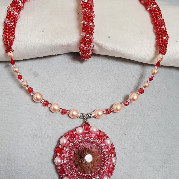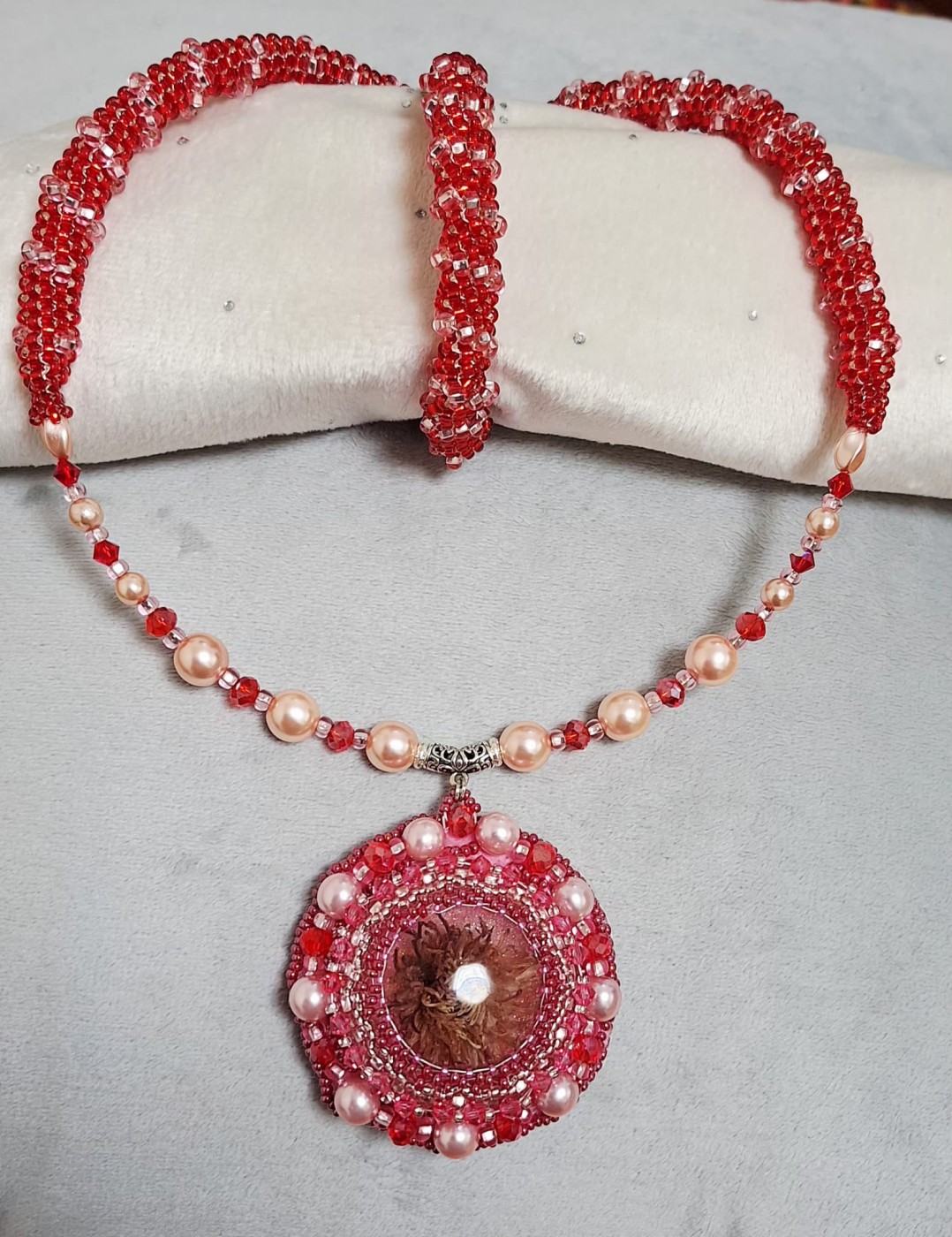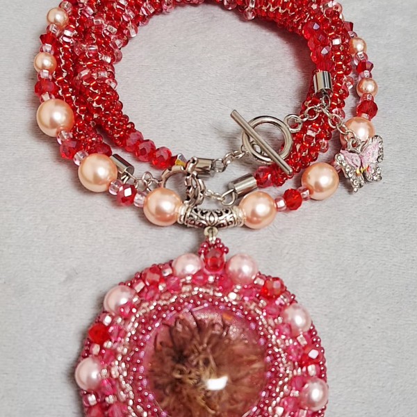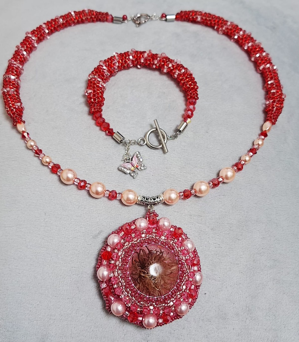 Komplekts: kaklarota ar kulonu un rokas sprādzi sarkanā krāsā. Izmantotie matieriāli: stikla pērlītes, metāla atmiņas stieple, aizdares un piekariņi (Čehija, Japāna, Ķīna). Kulona kabašons izgatavots no epoksīda sveķiem ar kaltētu ziedu (Mārtiņroze). Kaklarotas garums aptuveni 51 cm (bez aizdares), kulona diametrs 6 cm. Rokasprādzes garums ar aizdari 23 cm.