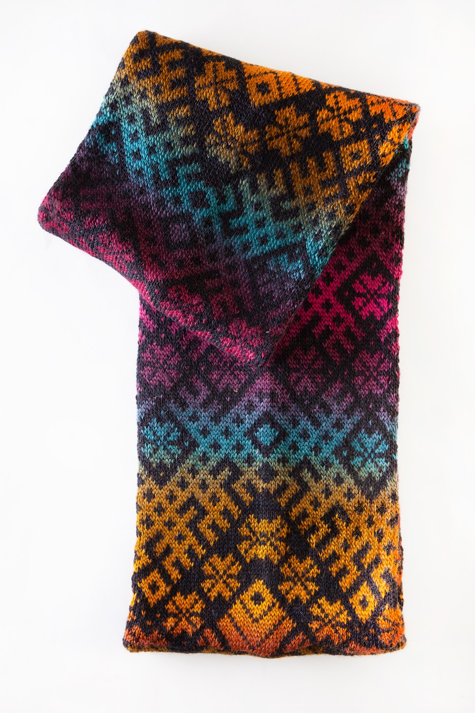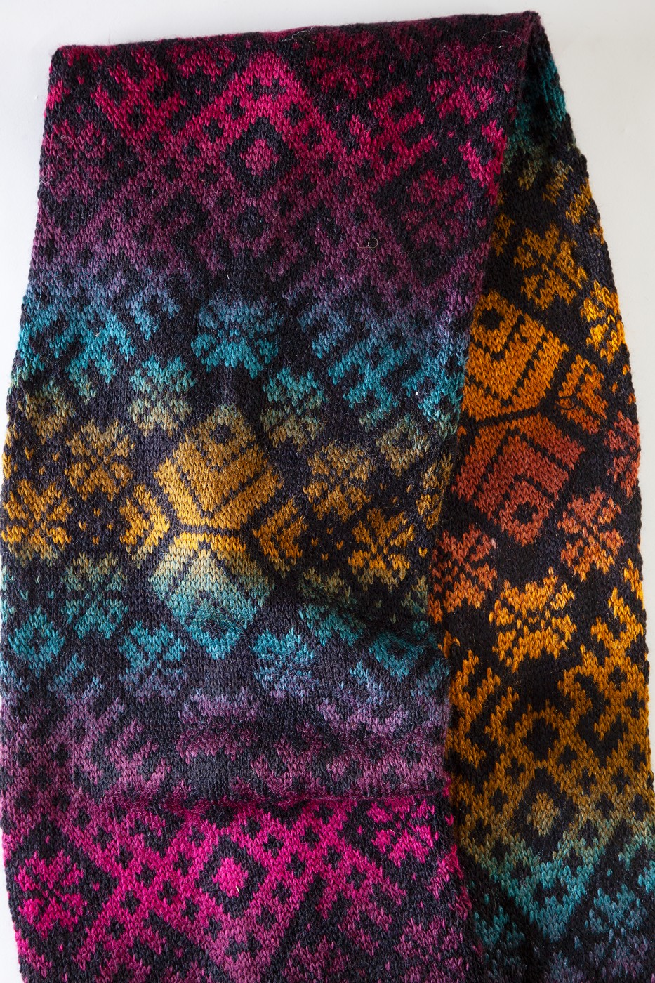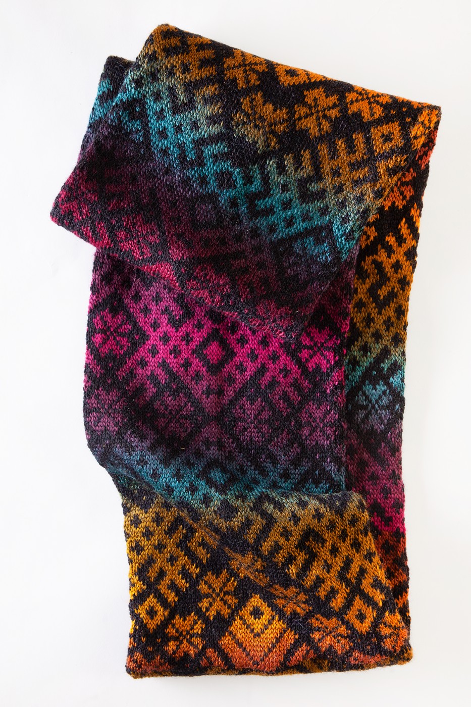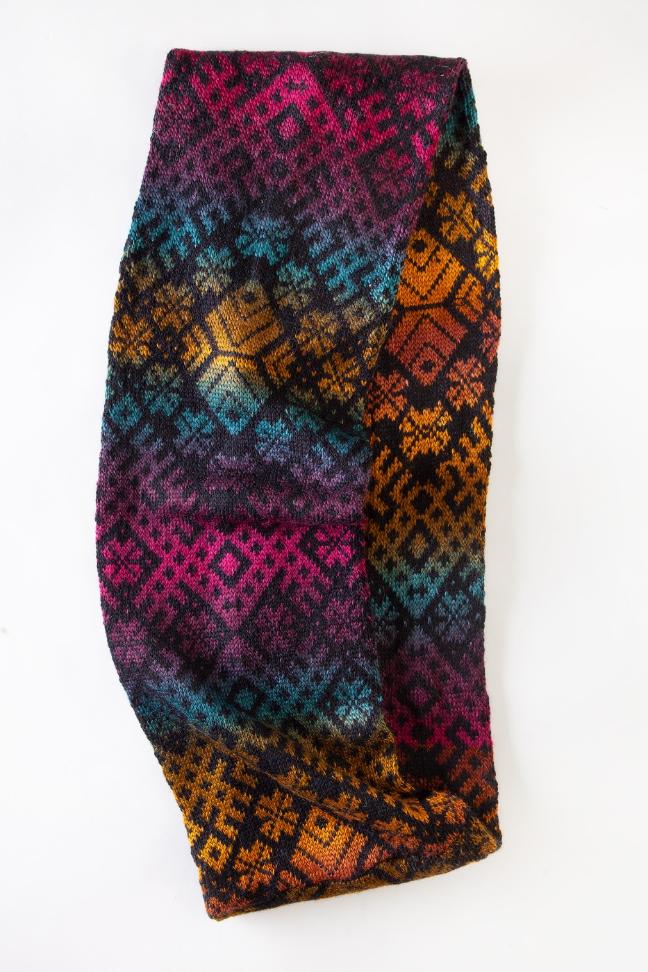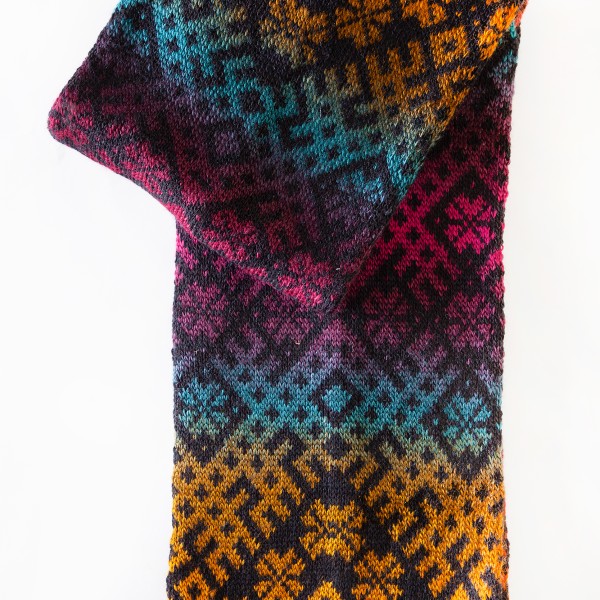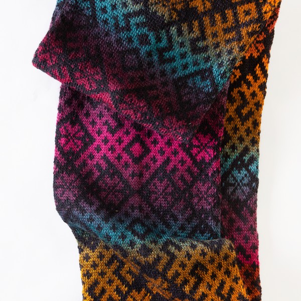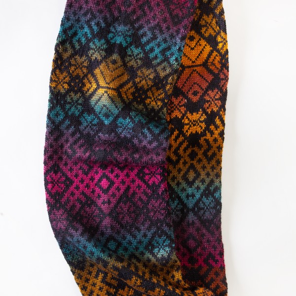 Košu krāsu apaļšalle ar Tautisku rakstu no mīkstas vilnas dzijas. Šalles izmēri 140x22 cm.