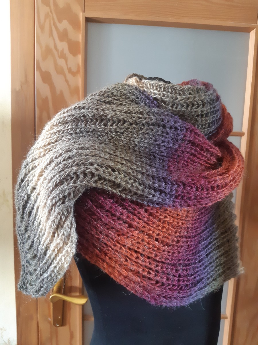 Mīksta, gara šalle patentadījumā harmoniskās dabas krāsās. 40% vilnas, 60% akrila dzijas. Izmērs 2,20 x0.33 m.