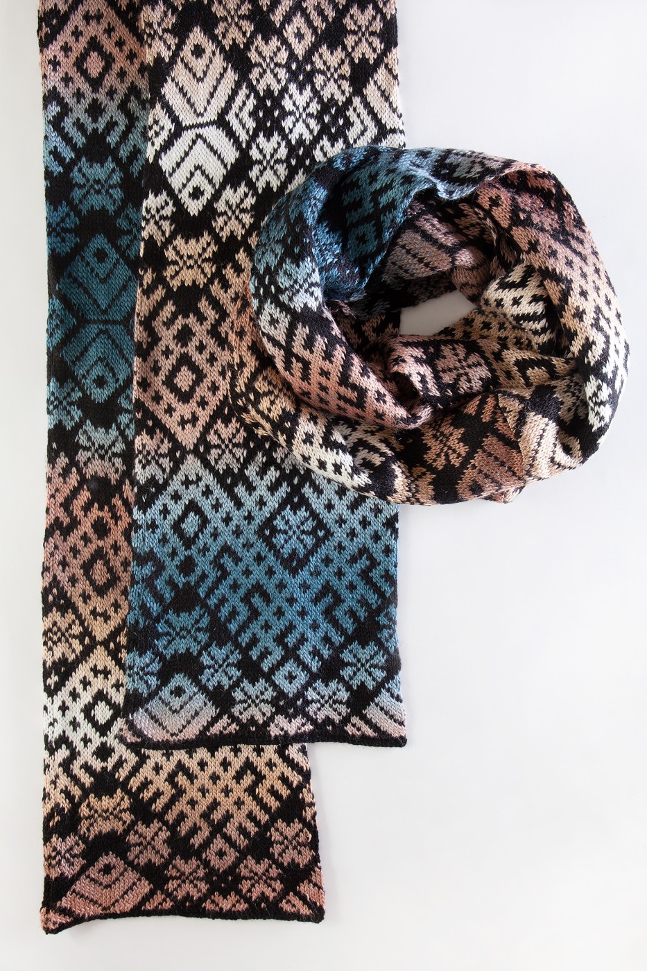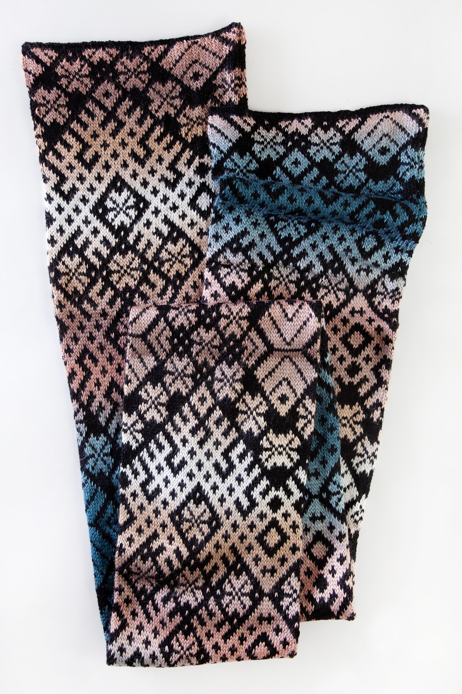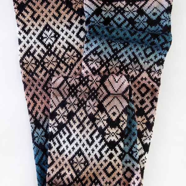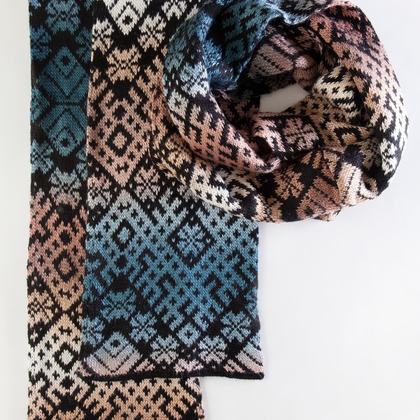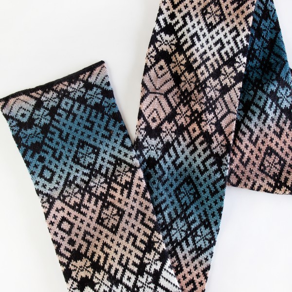 Šalles garums 190 cm, platums 21 cm. Adīta no mīkstas dzijas ar krāsu pārejām un melnu pamatu.