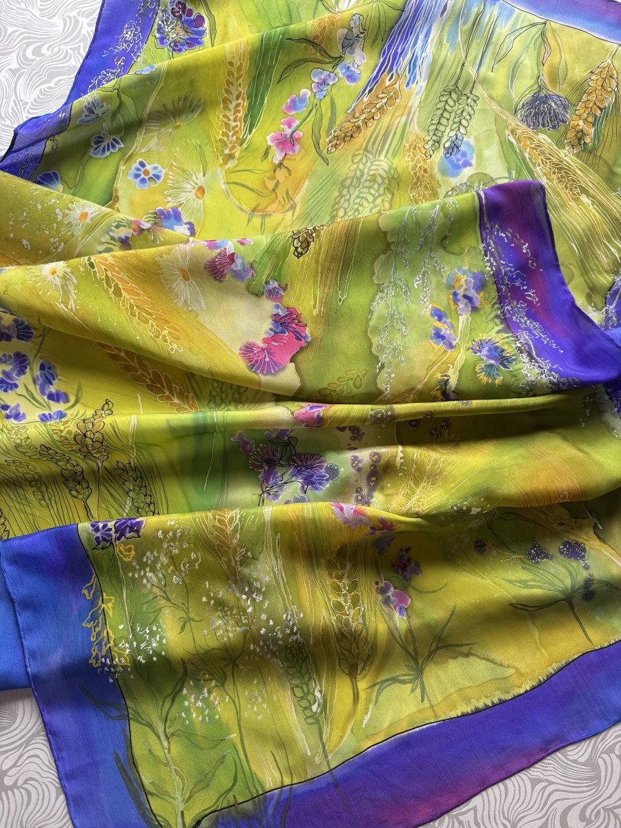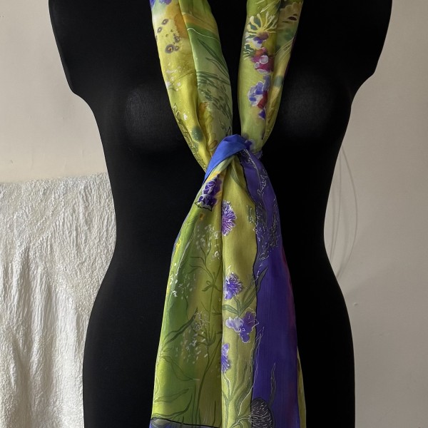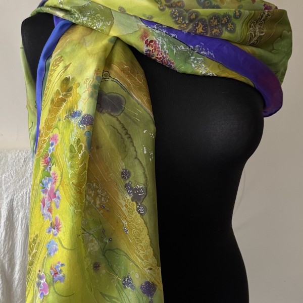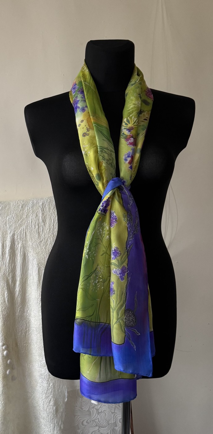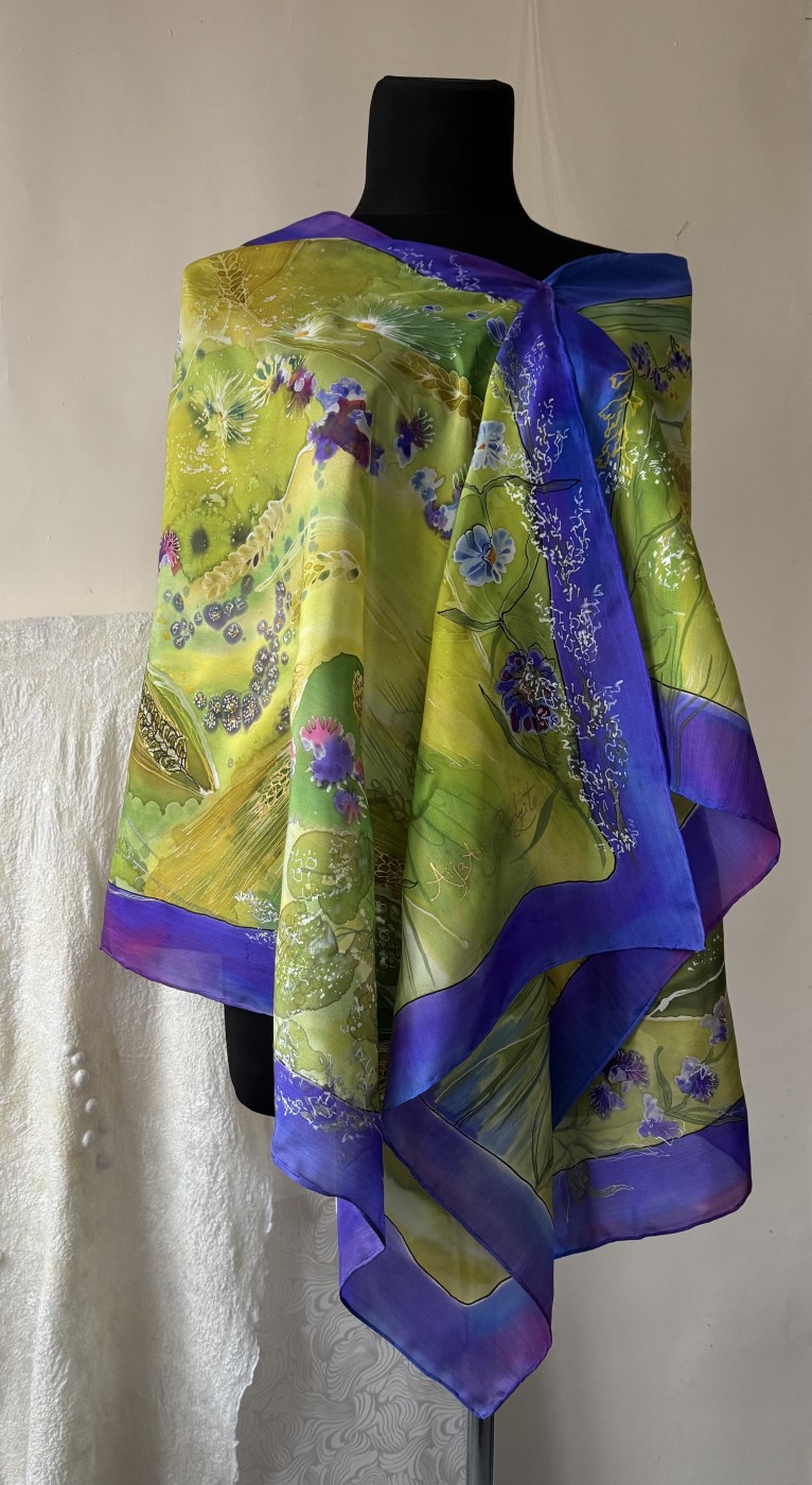 Dabīgā zīda šalle "Pavas iedvesma" ir izgatavota karstā vaska batikas tehnikā apvienojumā ar gleznojumu.