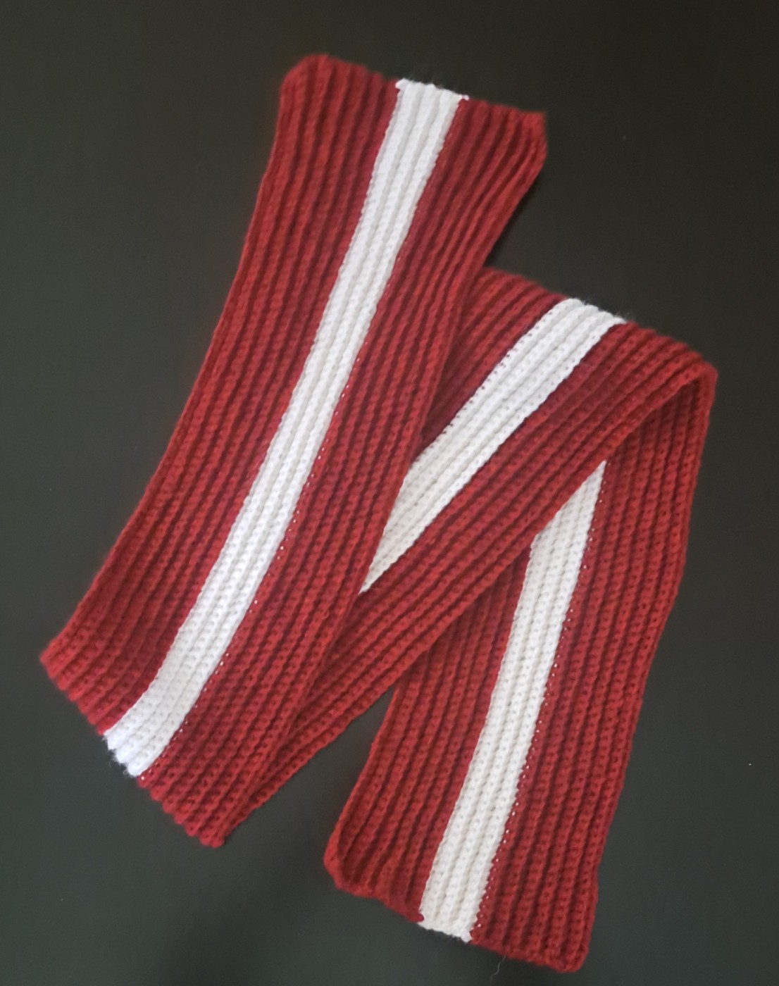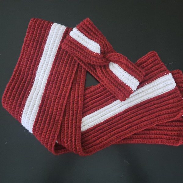 Sarkanbaltsarkana šalle 155cmx21cm. 40% alpaka, 20% vilna, 40% akrils. Var iegādāties komplektā ar uzausi(kopā 40EUR)