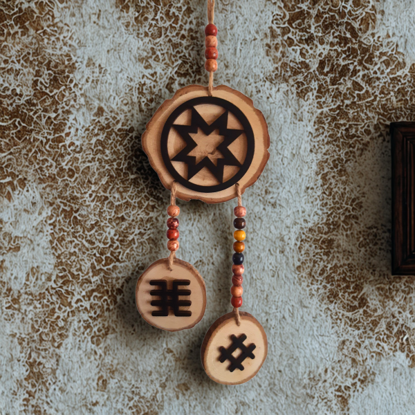 Roku darbs no dabīga ozolkoka – spēka amulets ar senlatviešu zīmēm: Auseklis, Aka un Ūsiņš.