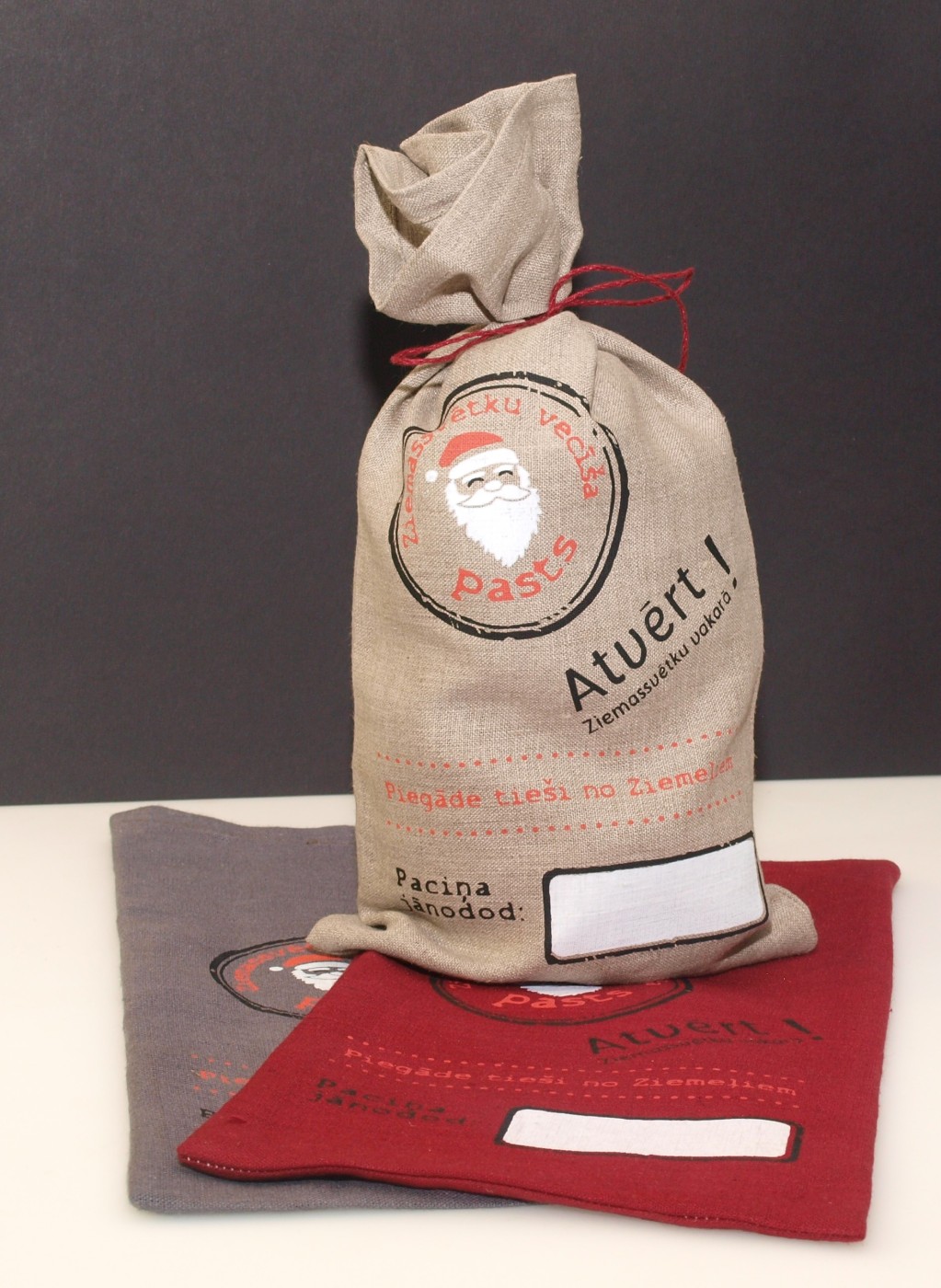 Lina maisiņus naturāli pelēka lina krāsā ar Ziemassvētku printējumu. Izmērs 18 x 30 cm Pieejami 9 gab.