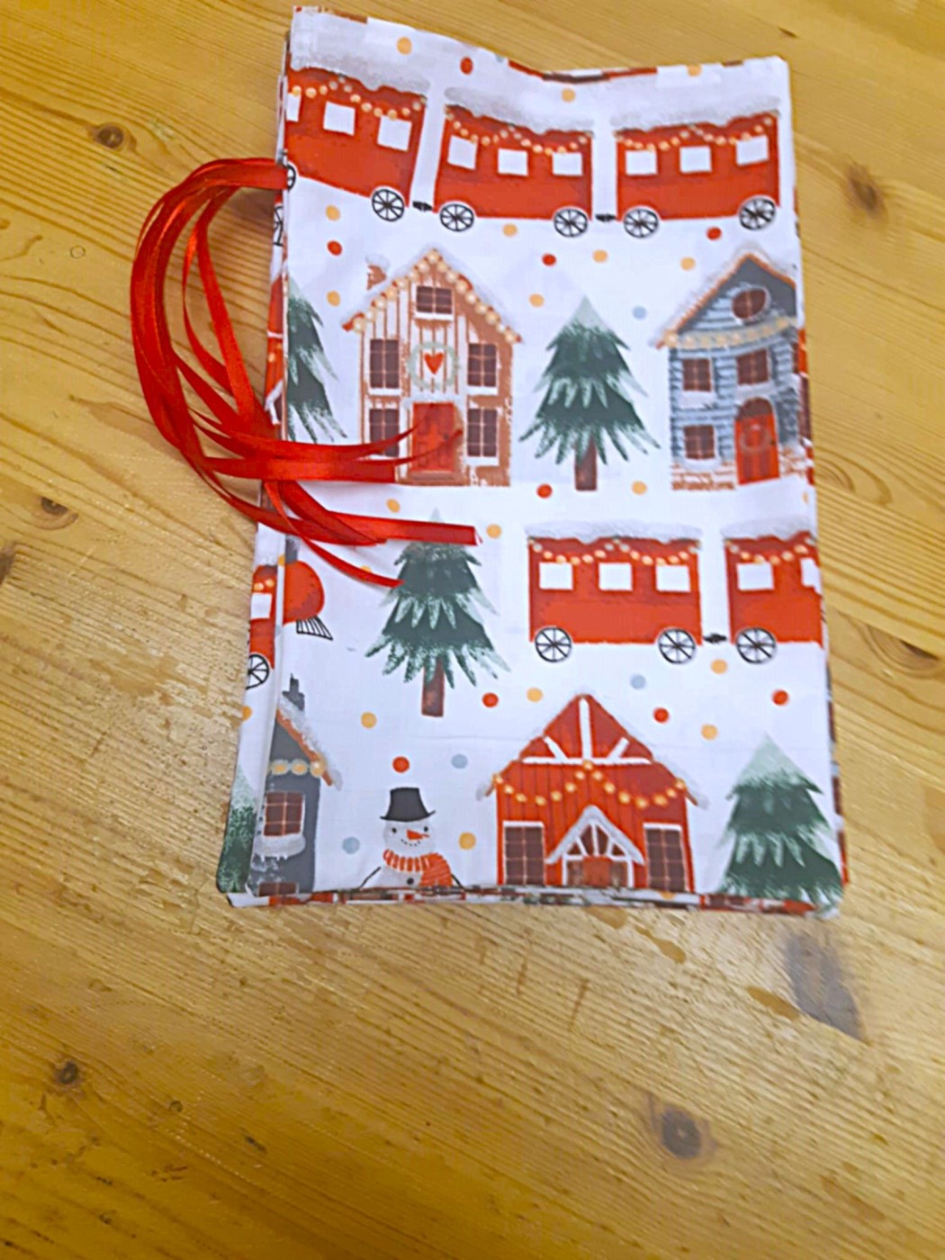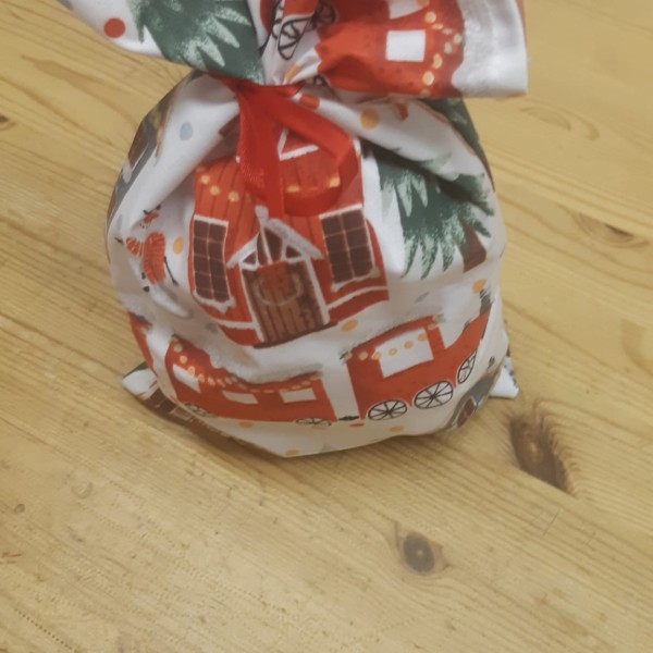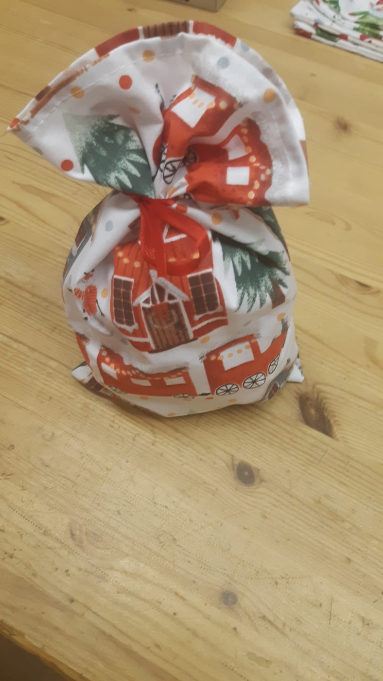 Kokvilnas auduma maisiņi ar Ziemasvētku motīvu. Izmērs 17 x 27 cm