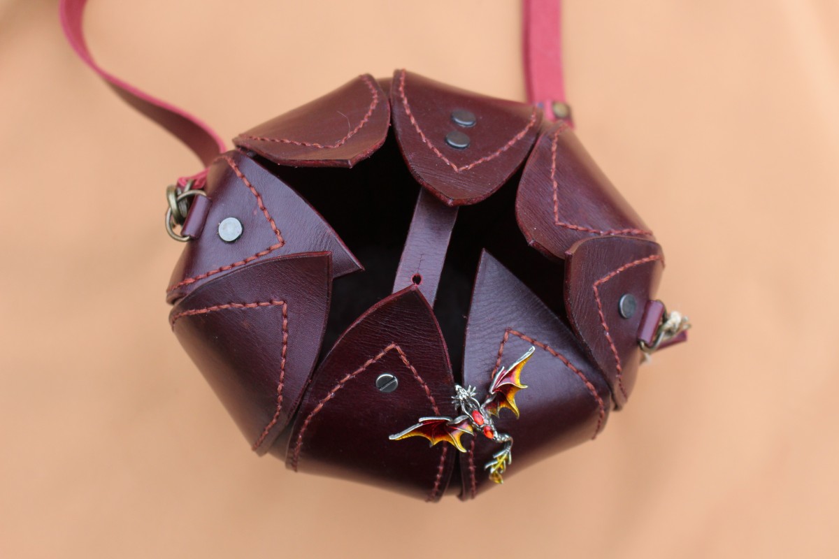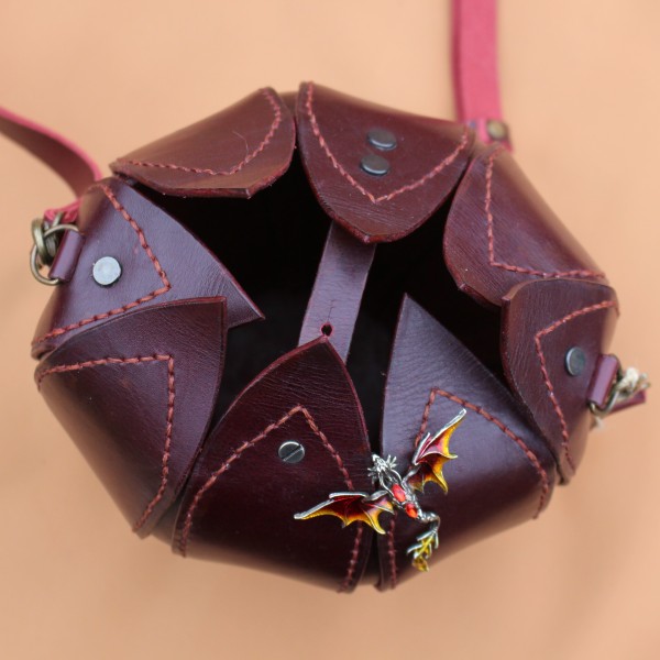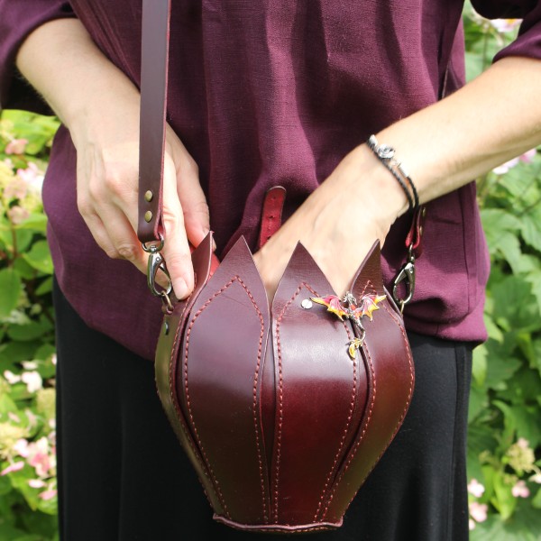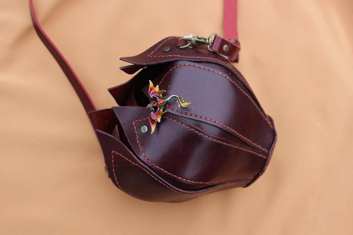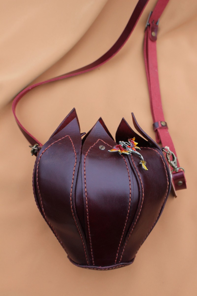 Eleganta apaļas zieda formas sieviešu soma no tumši sarkanas dabīgās ādas. Viens nodalījums ar spraudpogas aizdari. Izmērs 18cm X 22cm. Siksnas garums regulējams.