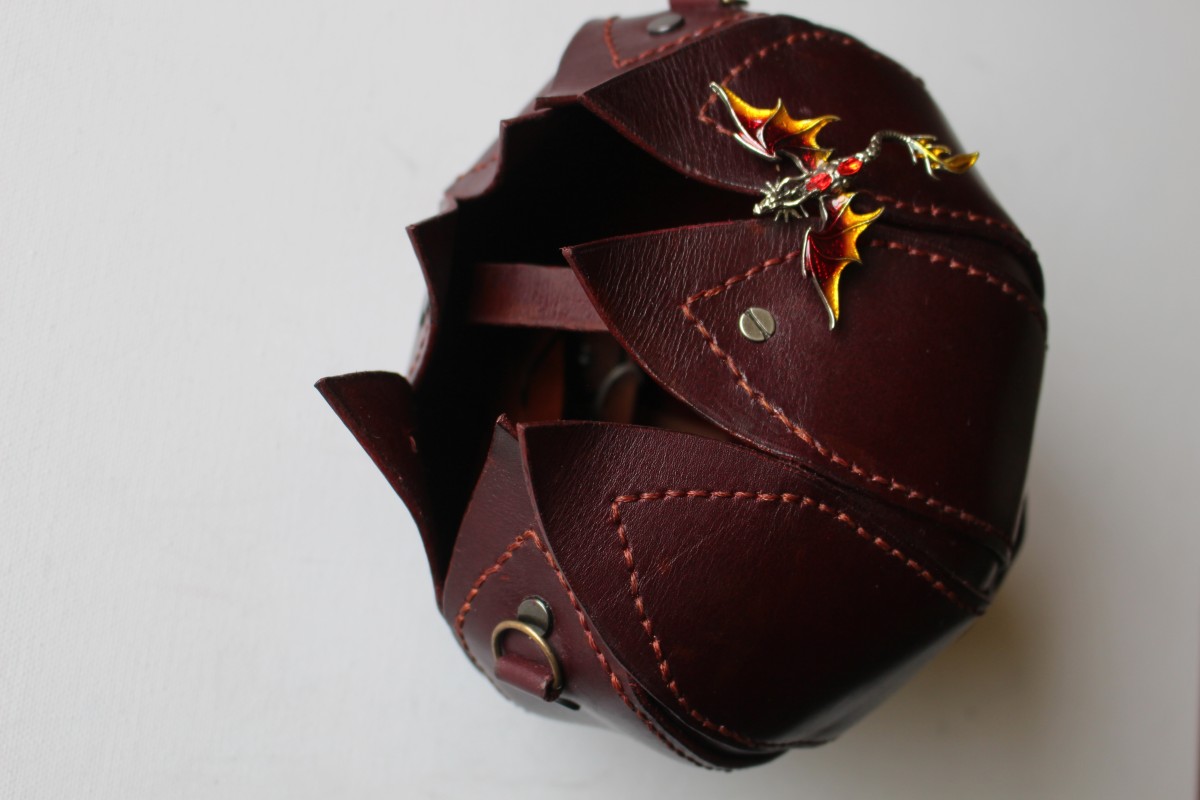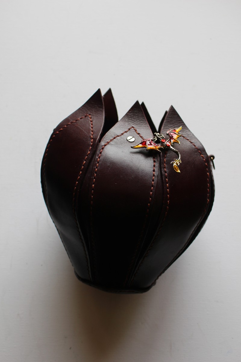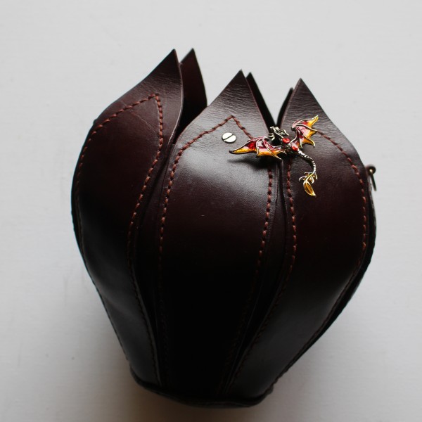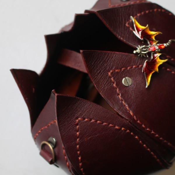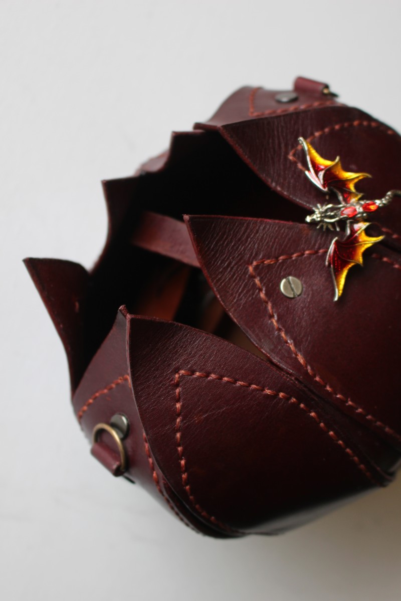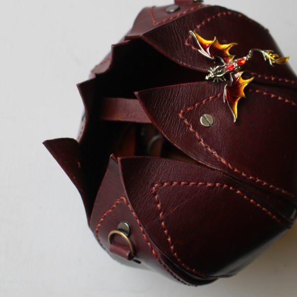 Eleganta apaļas zieda formas sieviešu soma no tumši sarkanas dabīgās ādas. Viens nodalījums ar spraudpogas aizdari. Izmērs 18cm X 22cm. Siksnas garums regulējams.