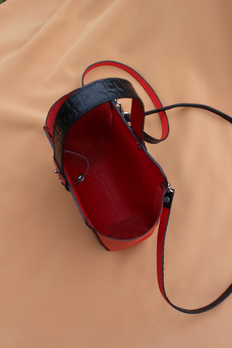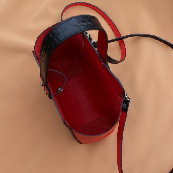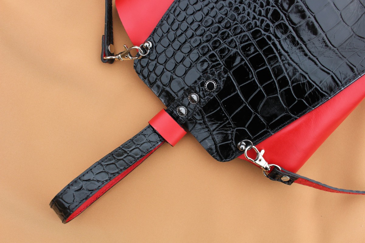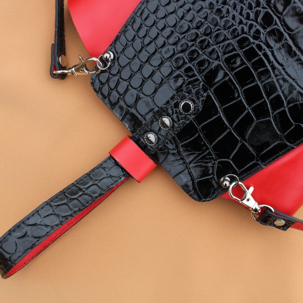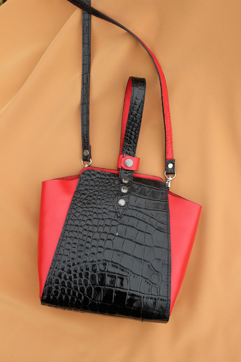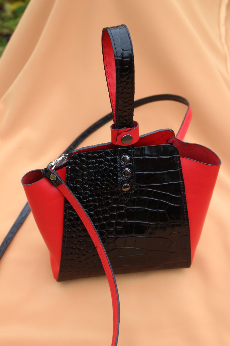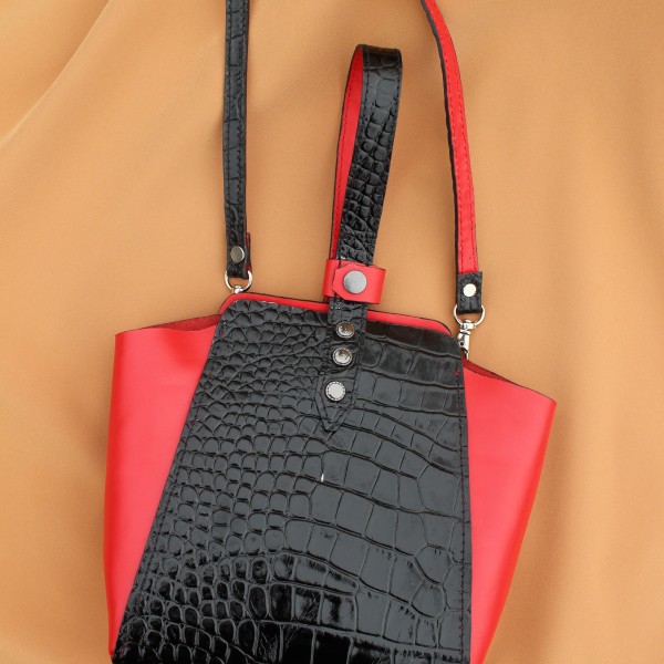 Sieviešu dabīgās ādas somiņa. Izgatavota no sarkanas gludas un melnas reljefas dabīgās ādas. Viens nodalījums ar metāla spiedpogas aizdari. Izmērs 20cm X 24cm X 7cm. Rokturis: īss, 15cm. Plecu siksna: noņemama, garums - 135cm . Ideāli piemērota gan ikdienai, gan svinīgākiem pasākumiem — šī soma būs spilgts akcents jebkurā tērpā!