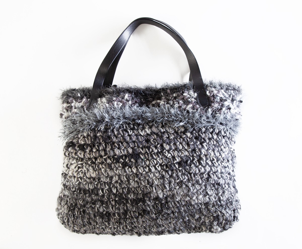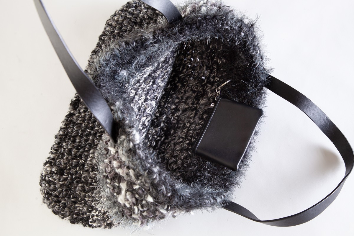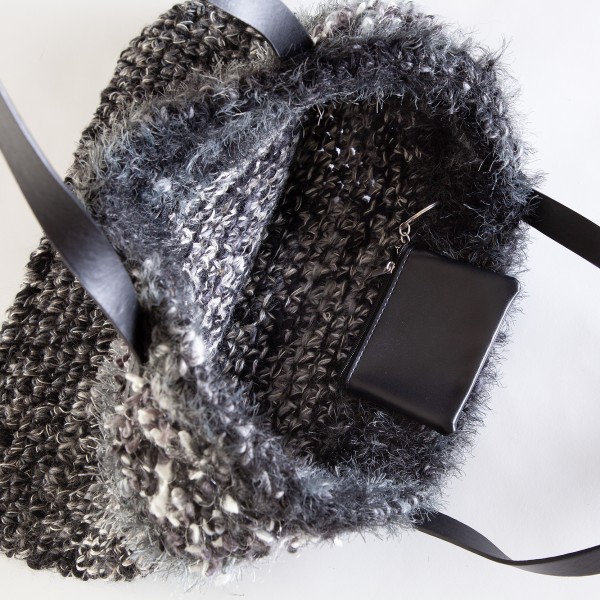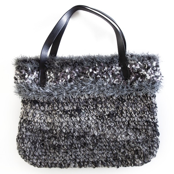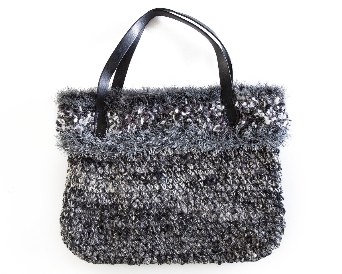 Dažādu efektdziju tamborēta soma ar aizdares spiedpogu un maciņu atslēgām. Izmērs 41x32 cm, rokturi 50 cm gari.
