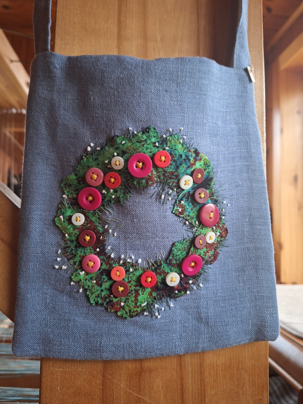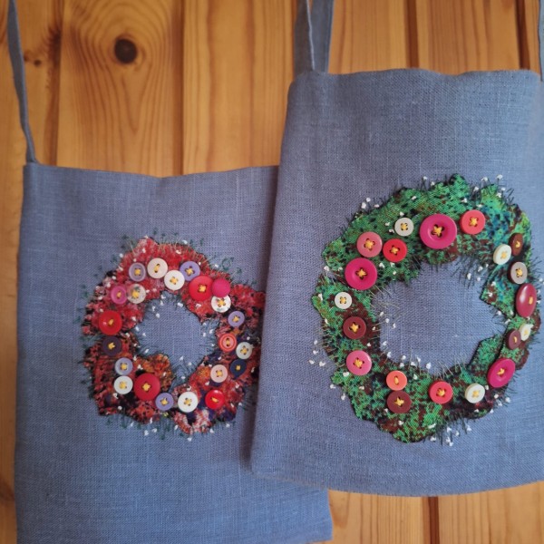 Pelēcīgi zilgana lina auduma plecu somiņa ar izšūtu podziņu dekoru. Priecīgs akcents pie tērpa visiem vasaras svētkiem un notikumiem. 20 x 21cm