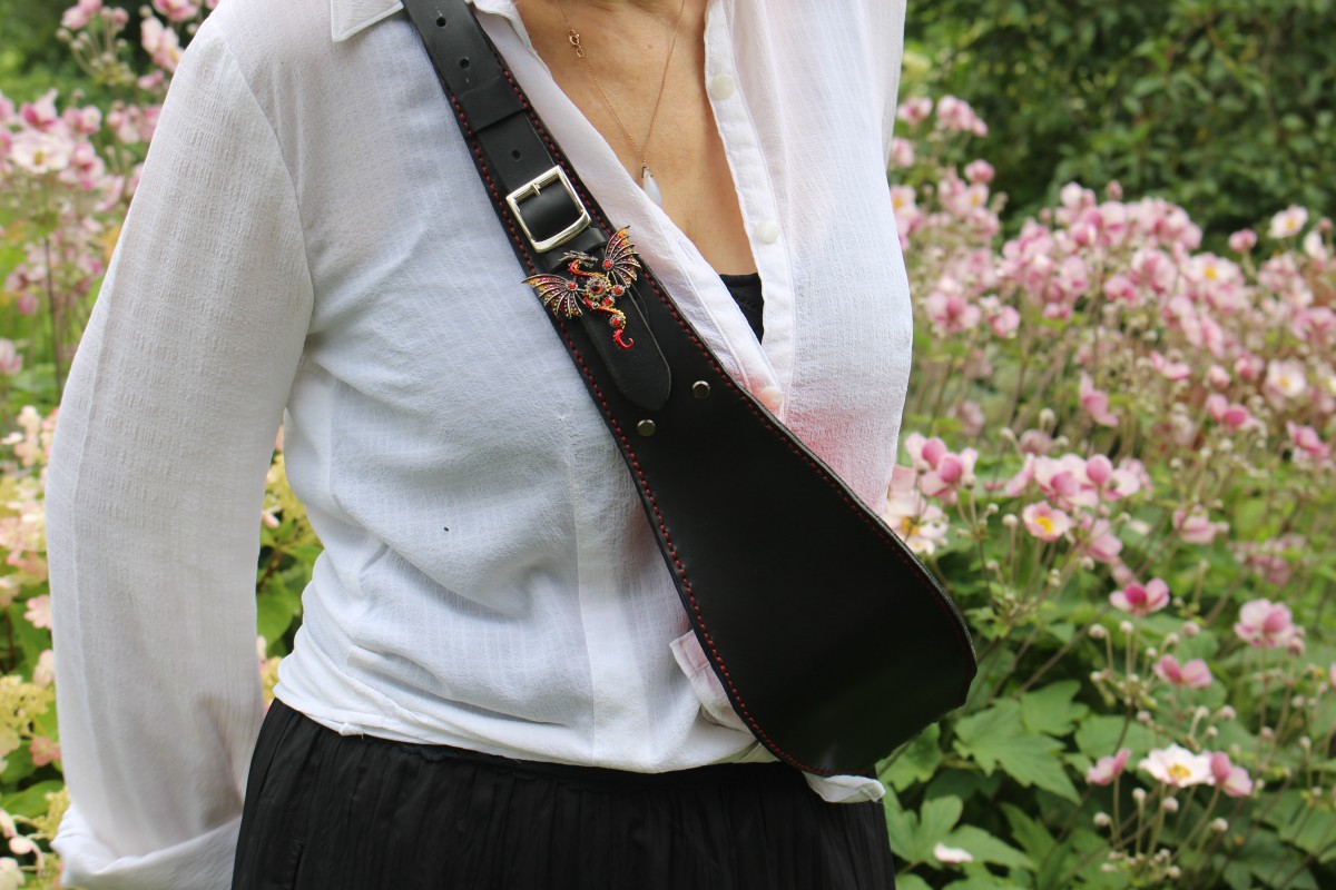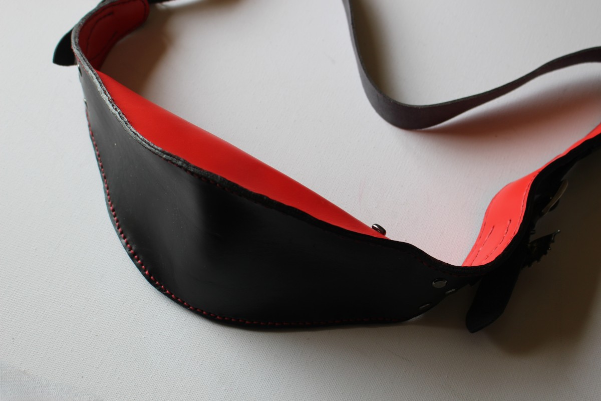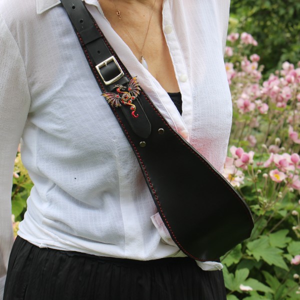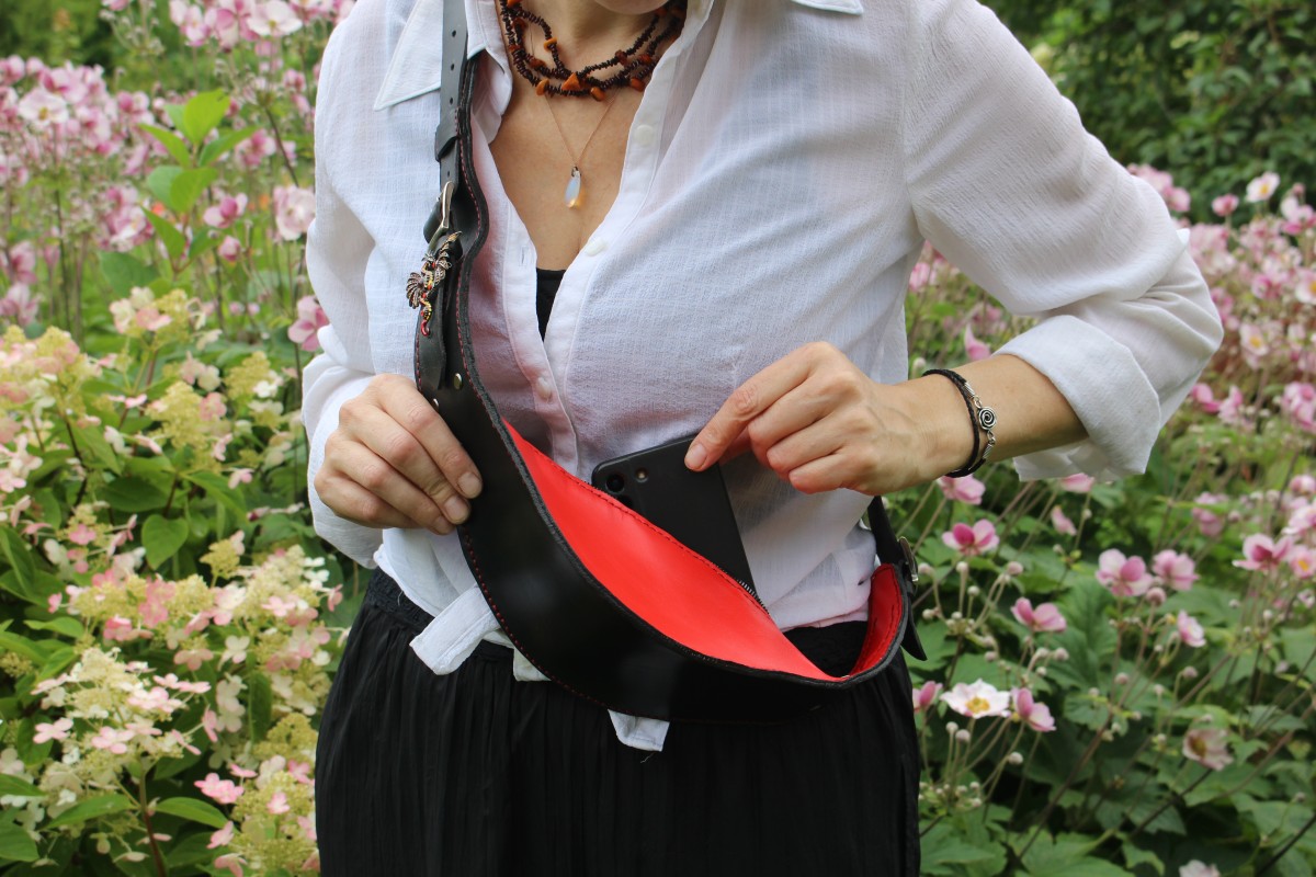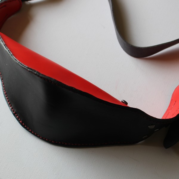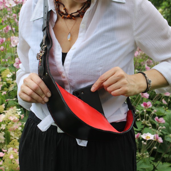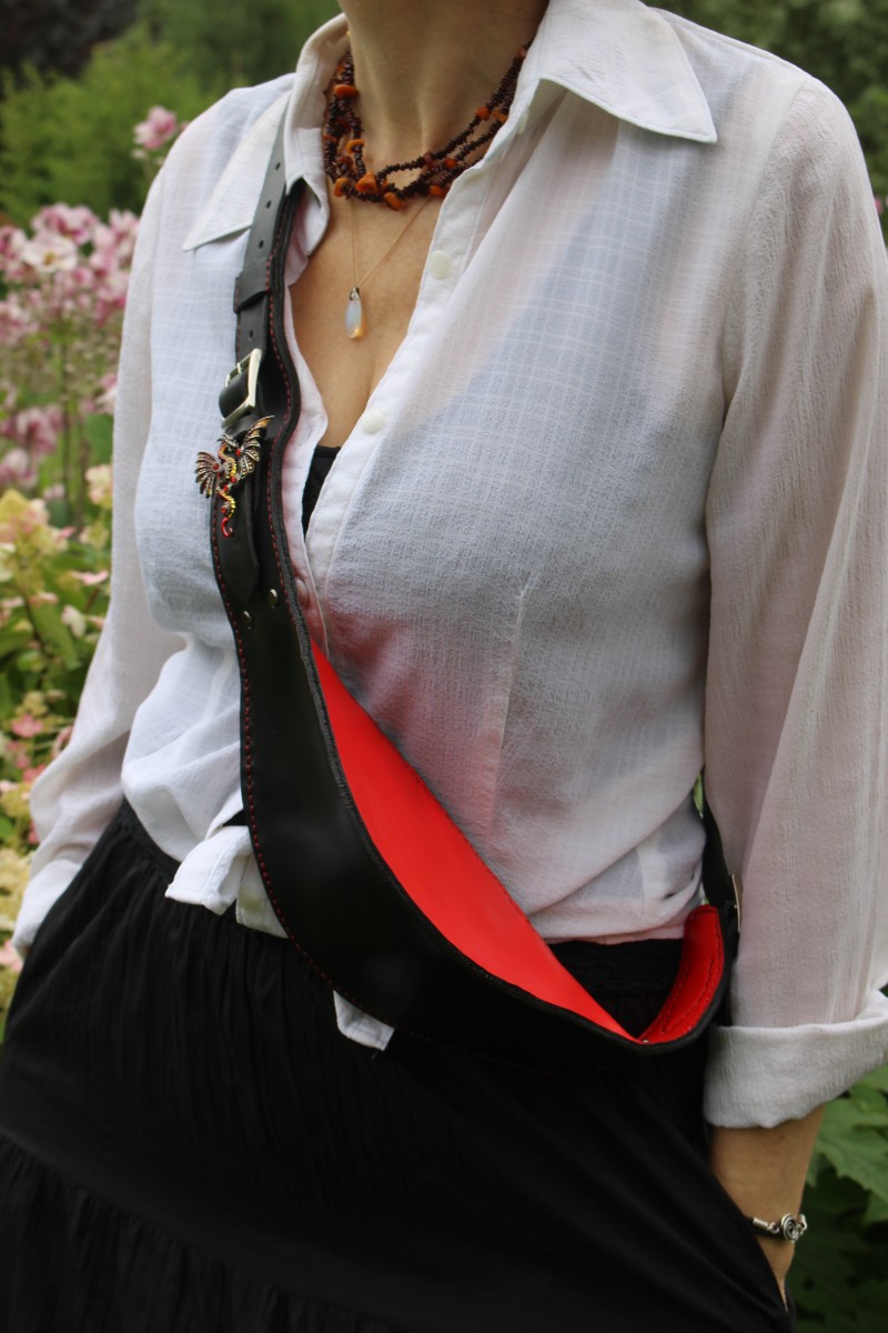 Jostas soma no melnas un sarkanas dabīgās ādas, viens nodalījums ar rāvējslēdža aizdari. Izmērs 26cm X 12cm, platums 9cm. Siksnas garums regulējams.