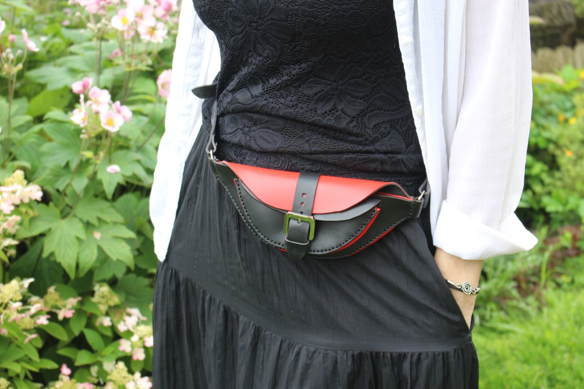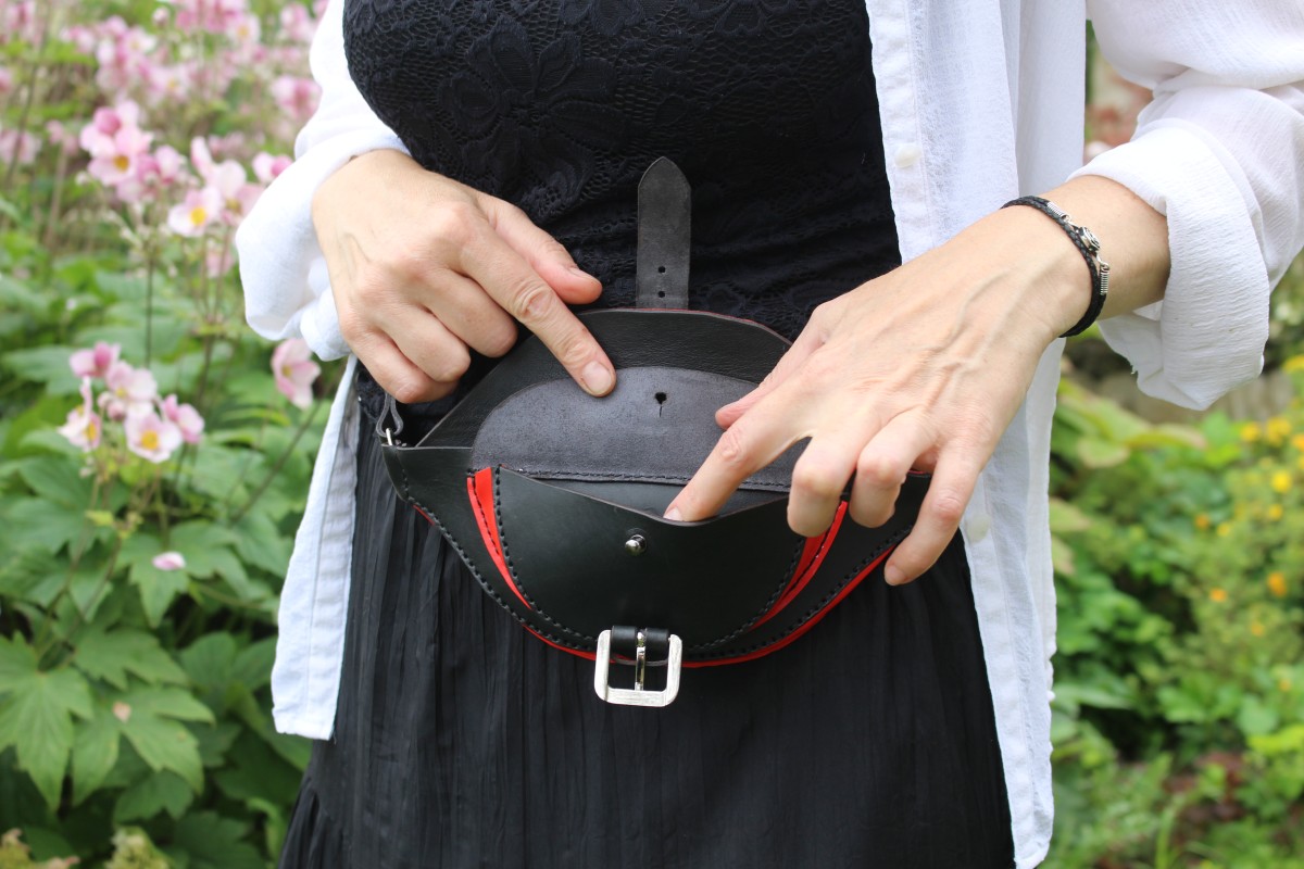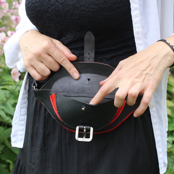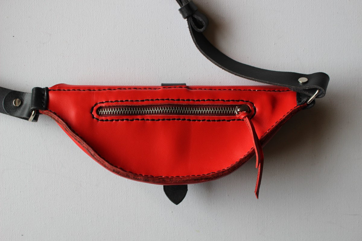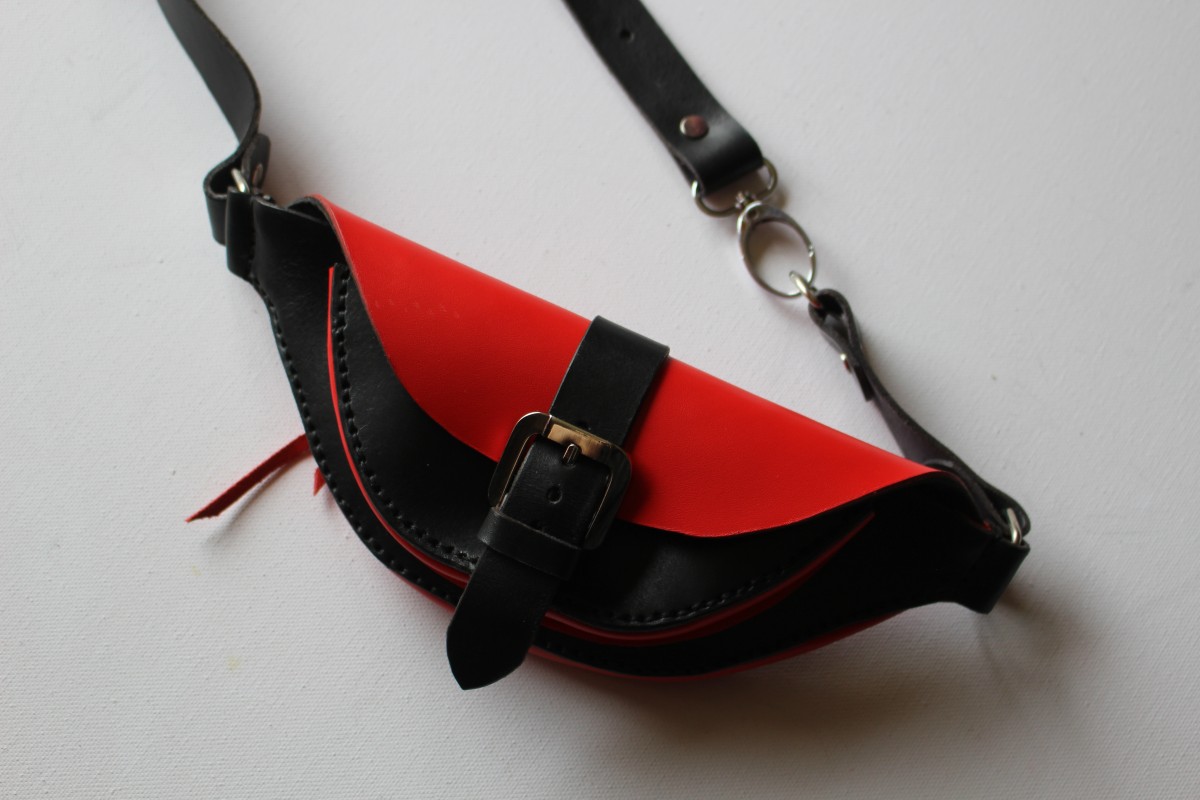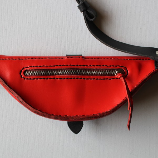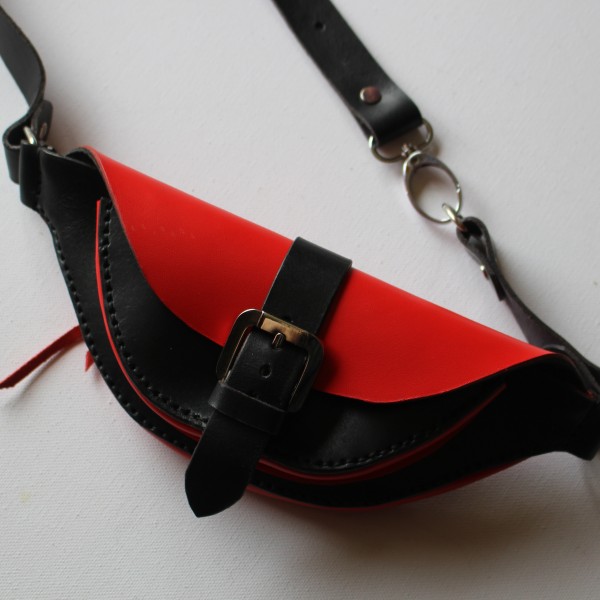 Jostas soma no melnas un sarkanas dabīgās ādas, trīs nodalījumi ar sprādzes un rāvējslēdža aizdari. Izmērs 22cm X 9cm, platums 4cm. Siksnas garums regulējams.