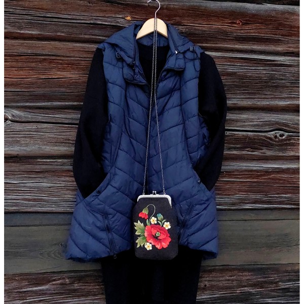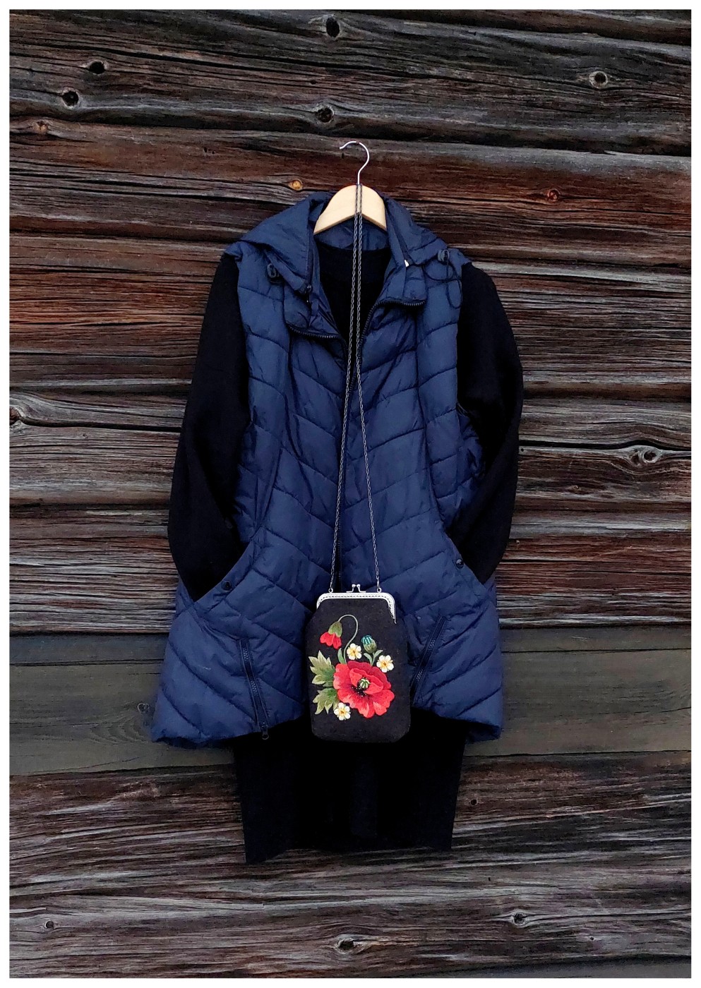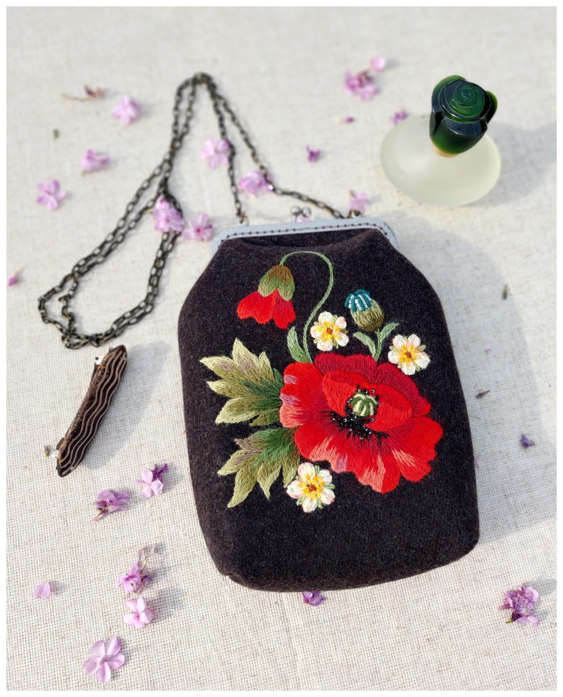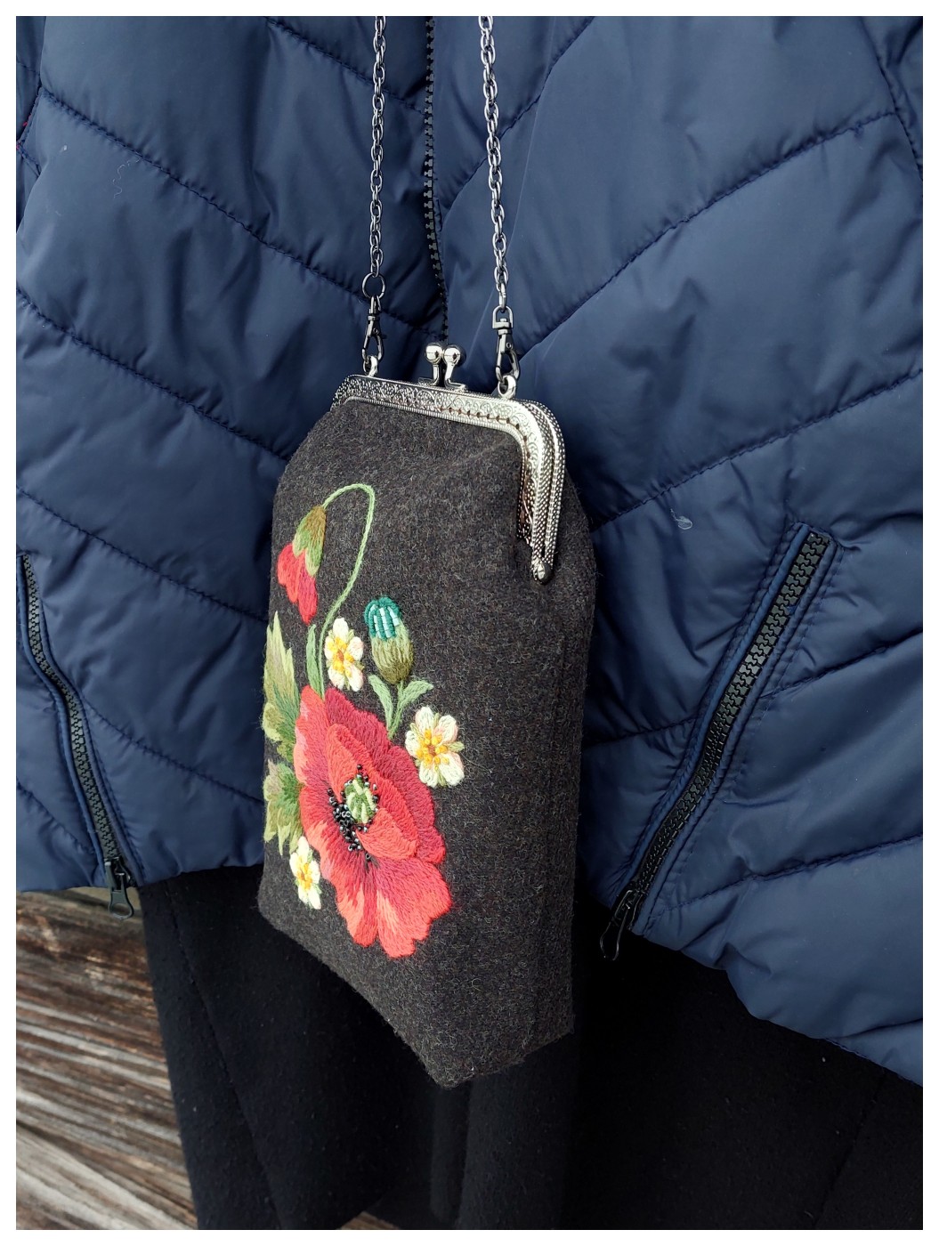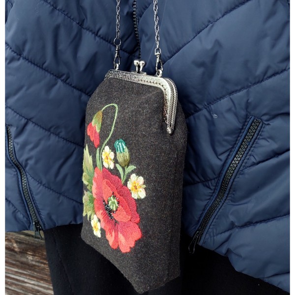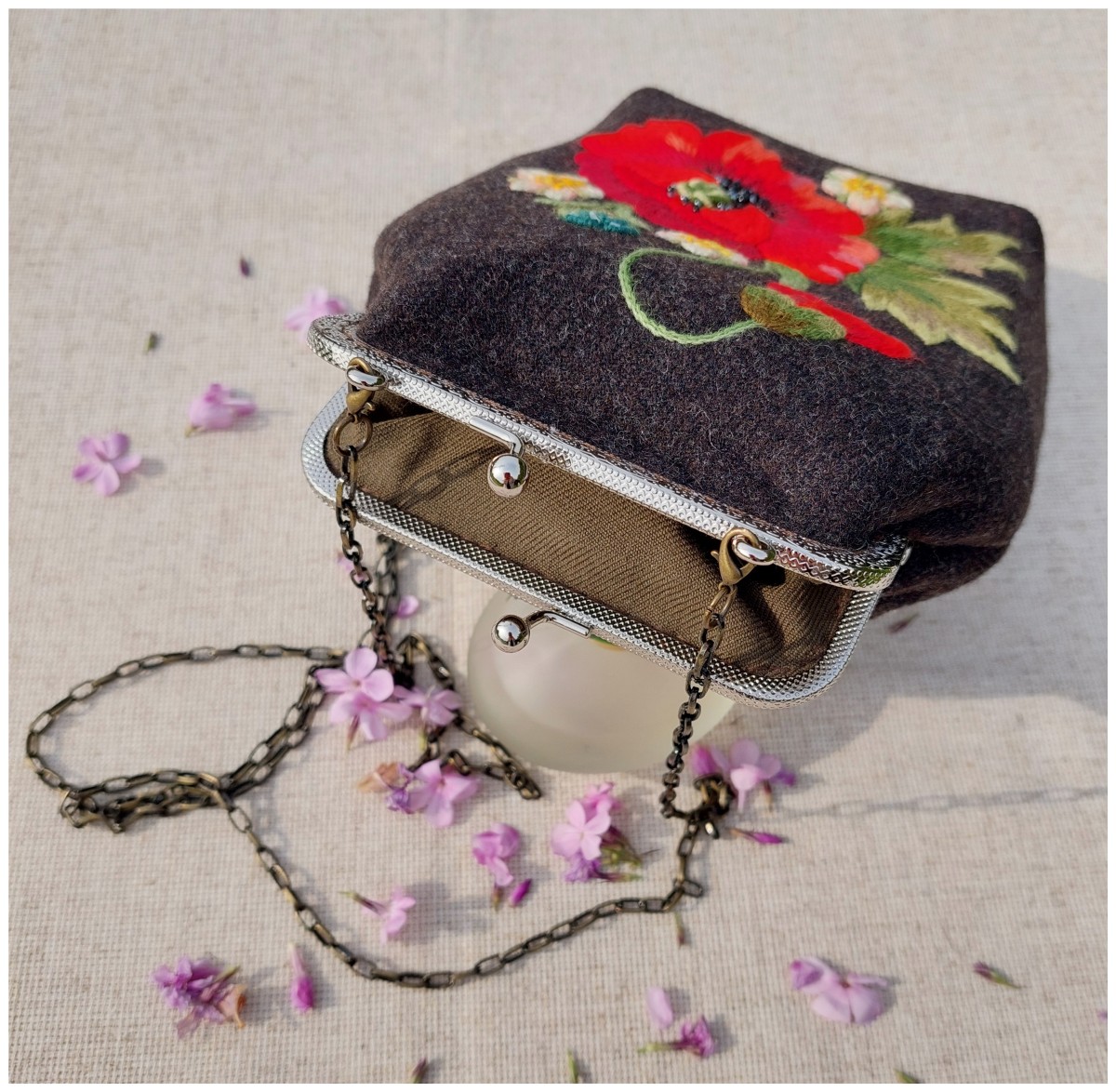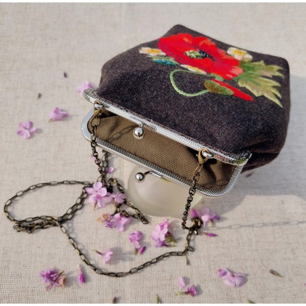 Purva krāsas vilnas audums, līmēts ar stabilizatoru - porolonu Vilene Style-Vil Fix 5 mm biezumā, kas nodrošina labu blīvumu. Iekšējais audums pusvilna, tumši zaļš. Vilnas diegi Appletons, pērlītes. Aizdare 13 cm, somas izmērs 21x16 cm, apakša 5 cm, noņemama ķēdīte 120 cm.