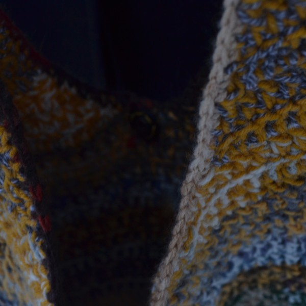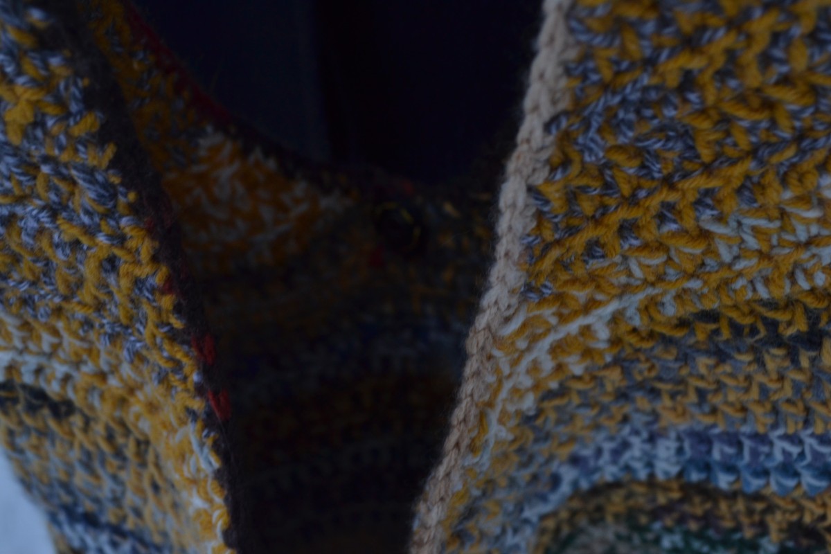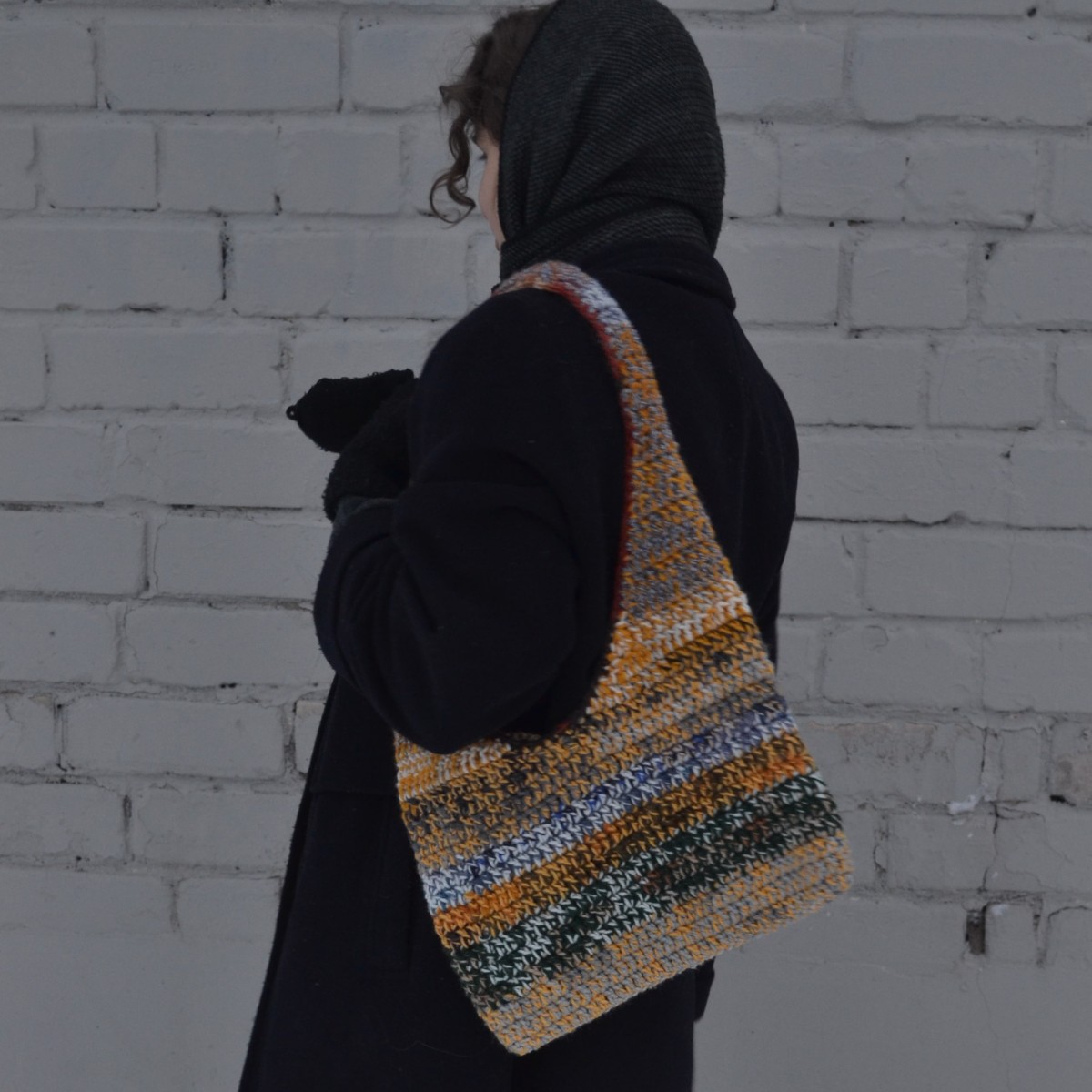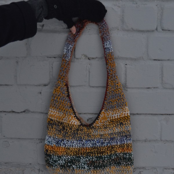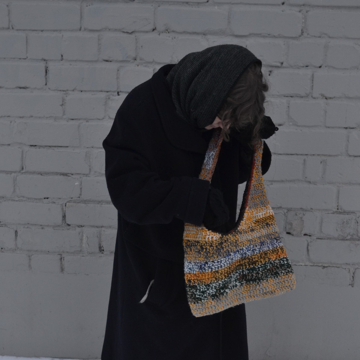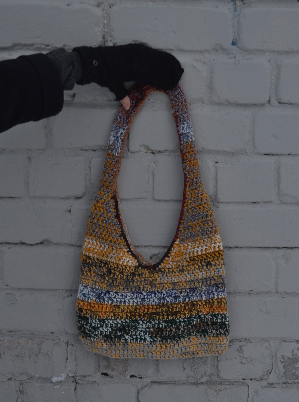 no pusvilnas dzijas kamolu pārpalikumiem tapusi raiba tamborēta soma!
