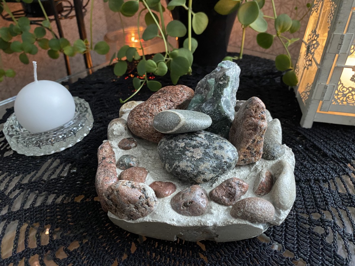 Dekors veidots no cementa un akmeņiem, apstrādāts ar akmens laku, kas piedod granātam līdzīgu spīdumu. Zem cementa pamatnes pielīmētas filca pamatnes kājiņas, lai netiktu saskrāpētas mēbeles.