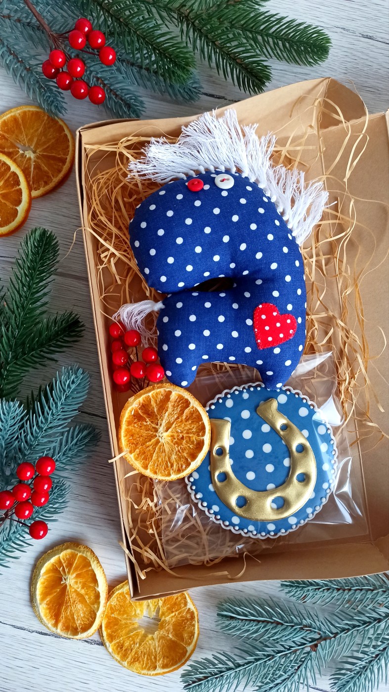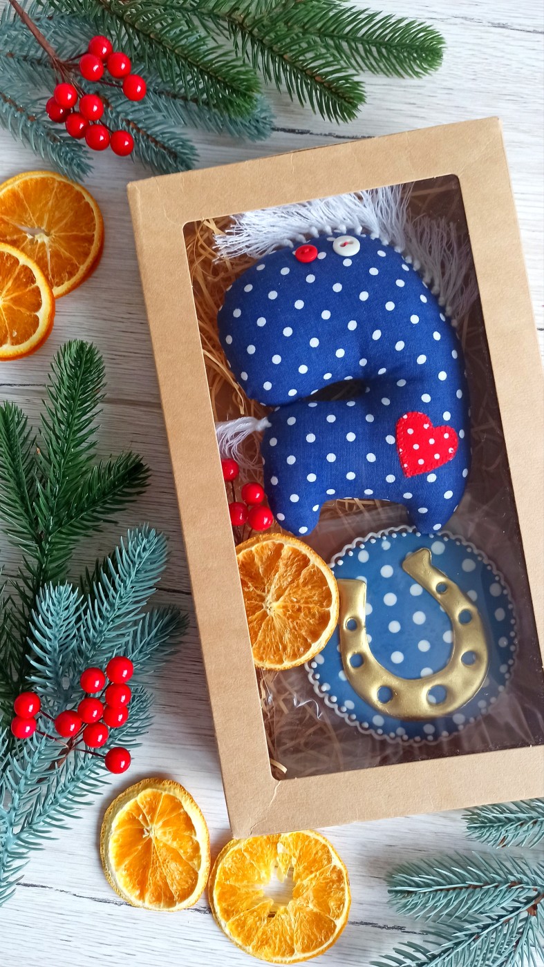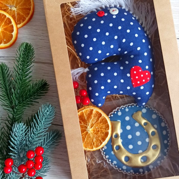 Jaungada dāvanu komplekts: tekstila zirdziņš - nākamā gada simbols - un ingvera un medus prjaniks (piparkūka) krafta kastītē.