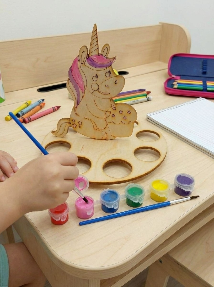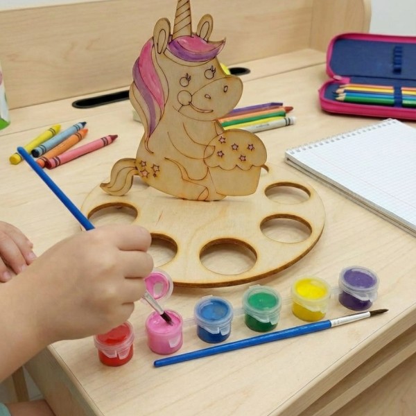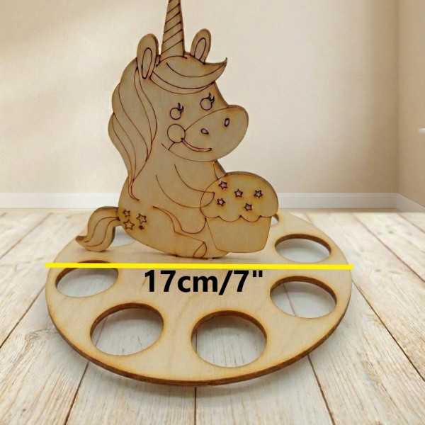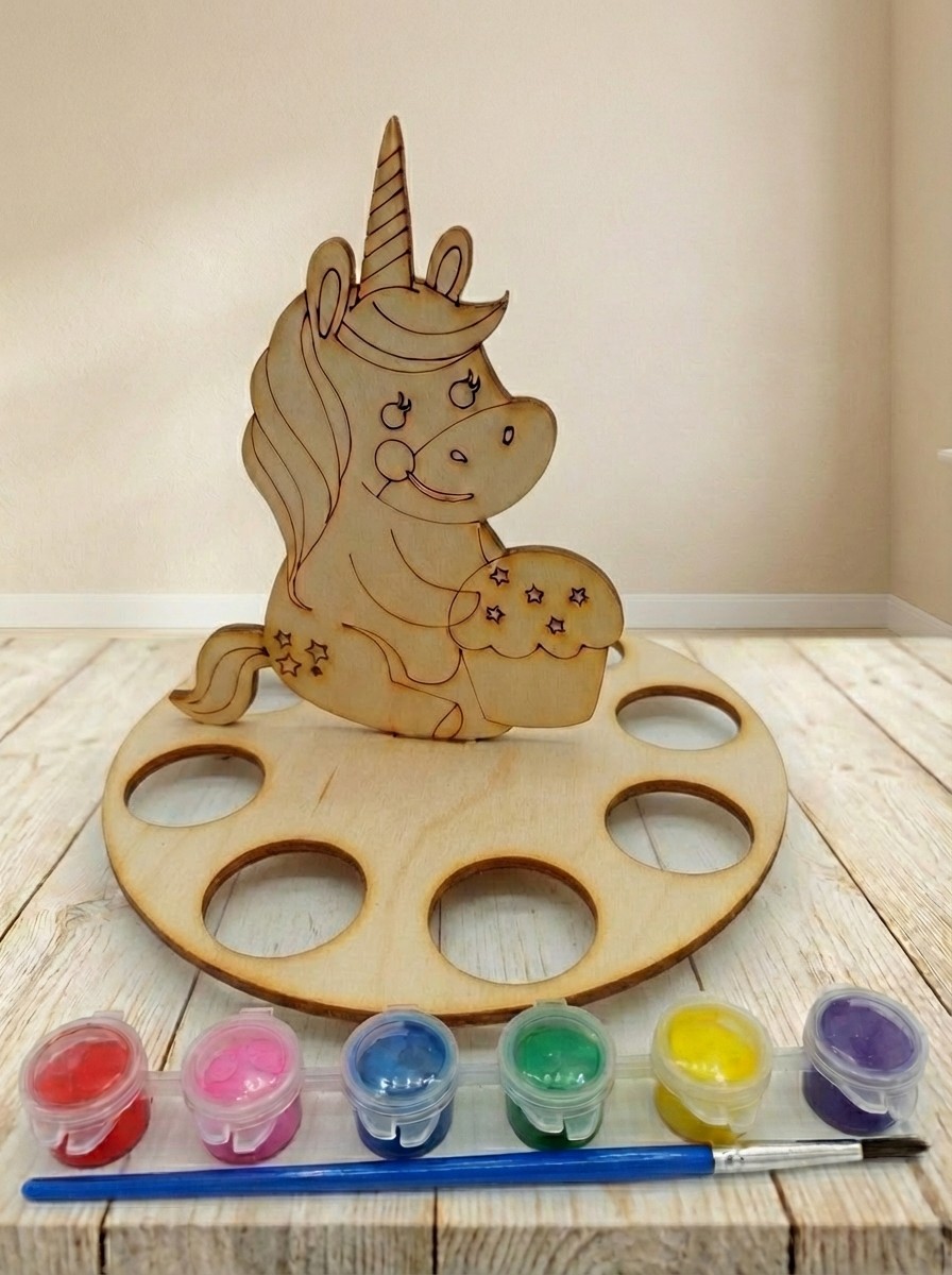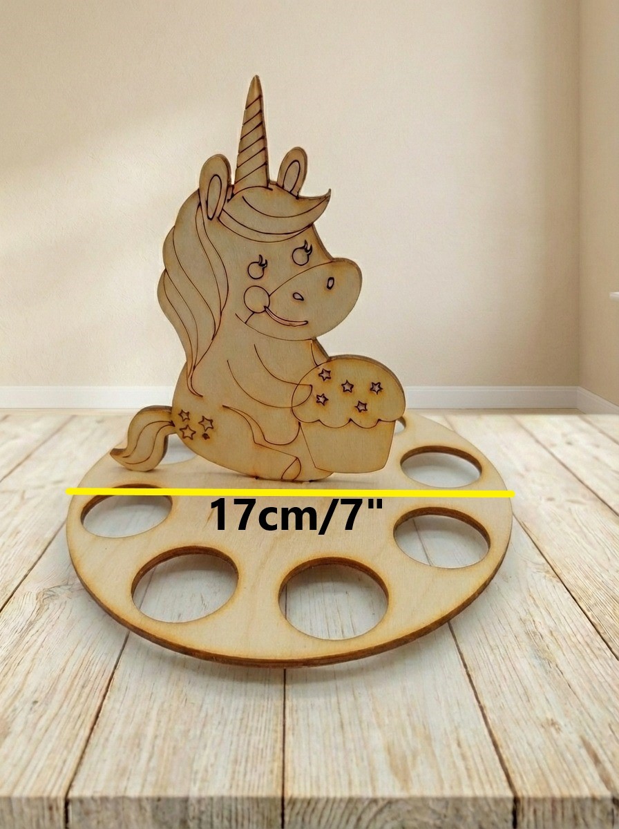 Koka olu paplāte ar vienradža figūru paredzēta 8 olām un ļauj bērniem pašiem to izkrāsot pēc savas fantāzijas.