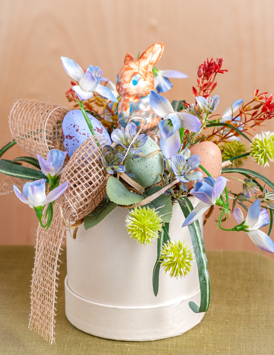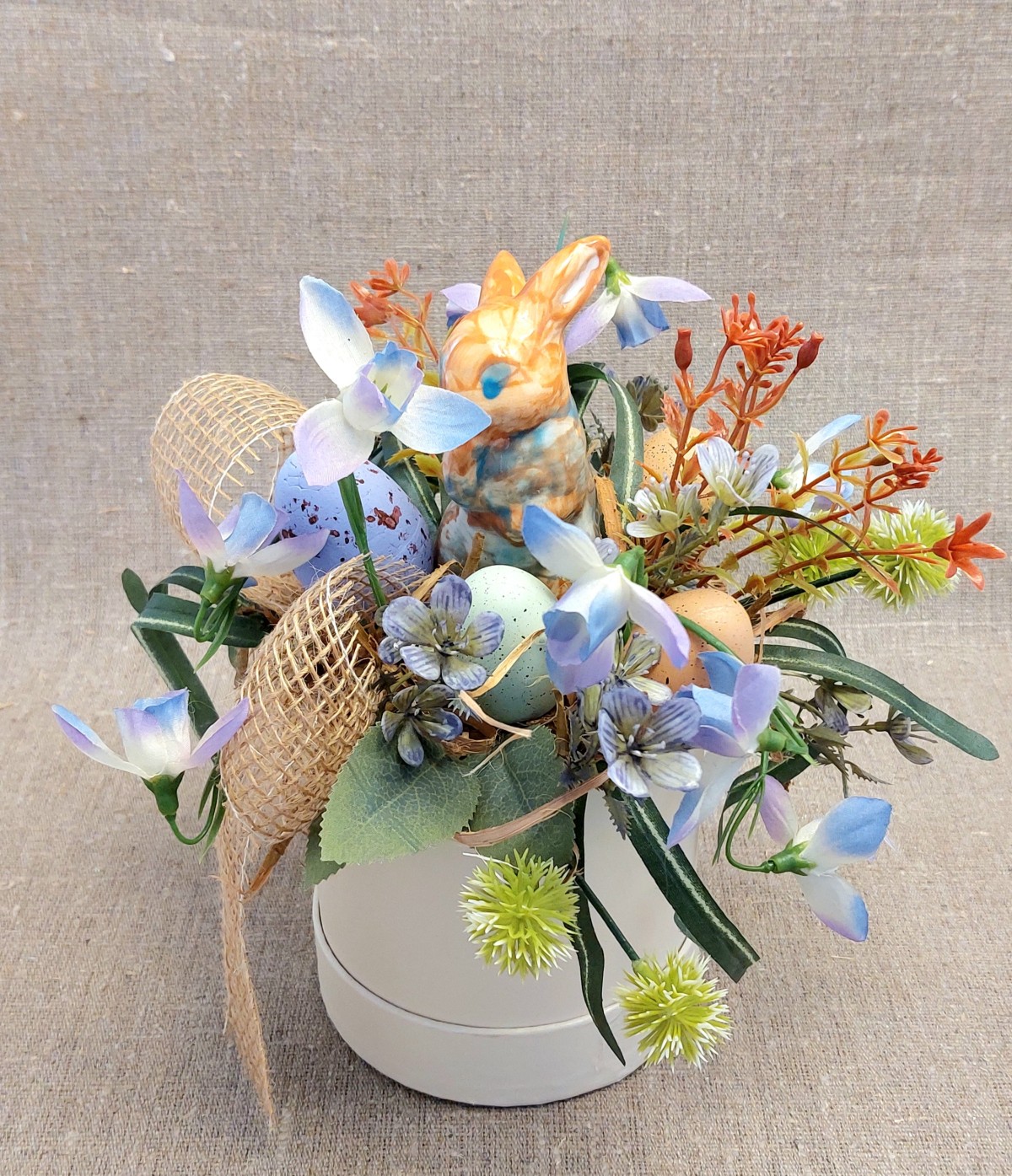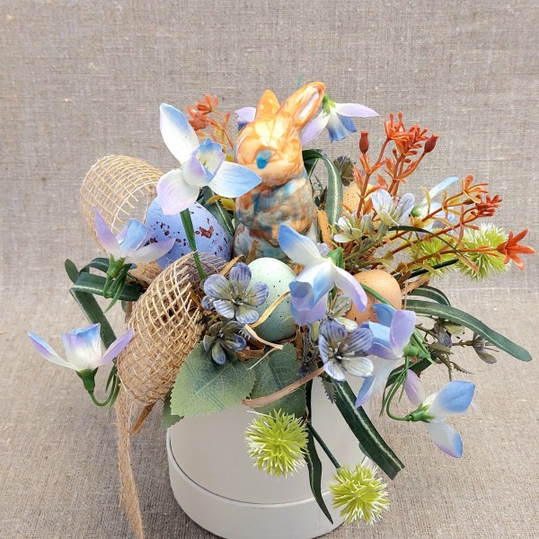 Galda dekors Lieldienām ar keramikas zaķi.