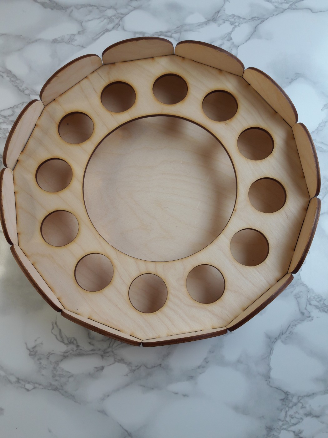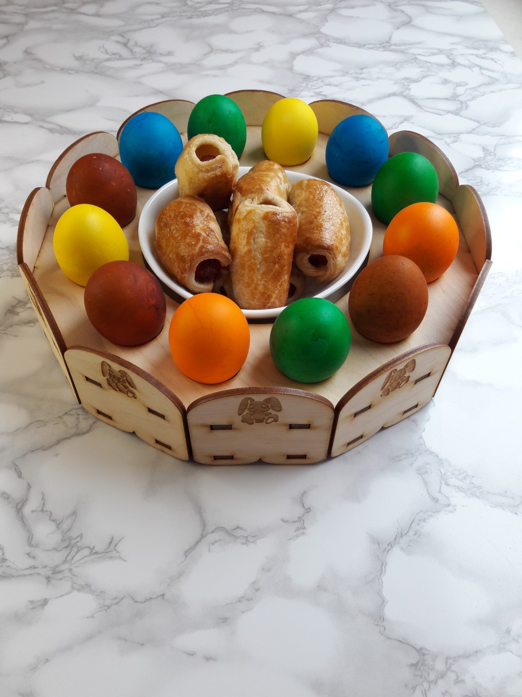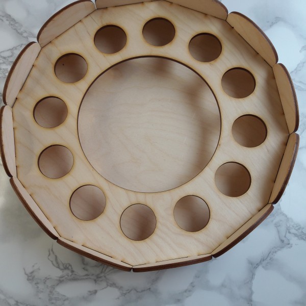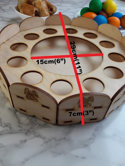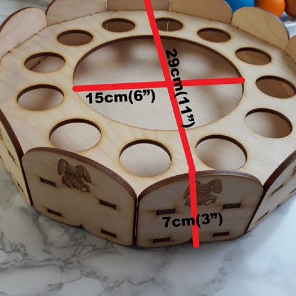 Šis koka Lieldienu olu paliktnis ir praktisks un estētisks papildinājums svētku galdam. Paliktnis paredzēts 12 Lieldienu olām, bet centrā atstāta vieta uzkodām, maizītēm vai saldumiem.