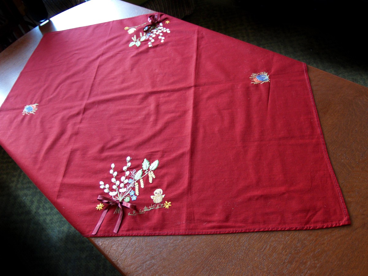 Roku darbs - Galvenais foto, Lieldienu galdauts, kokvilna, izšūtie pūpoli sasieti ar bantīti, galdauts apšūts, 105x 95 cm, cena 17.00 eiro,