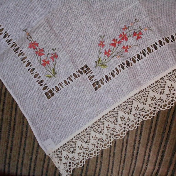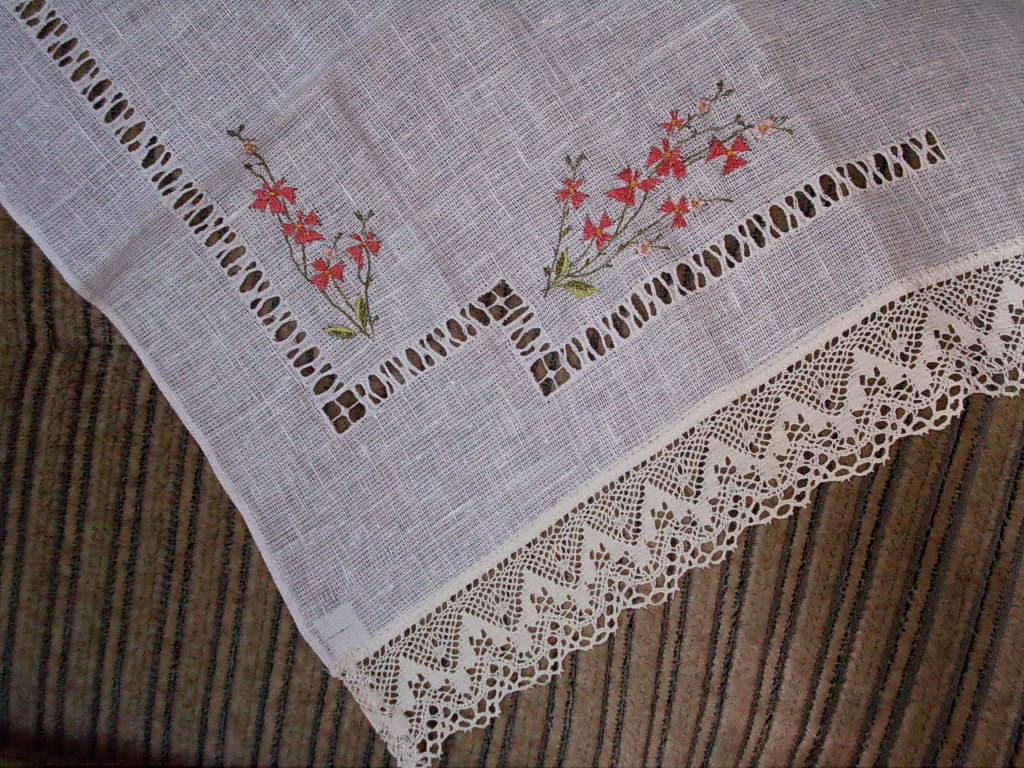 1. foto galdauts -celiņs , vienvirziena izvilkums, ziedi, 92x120 cm. lins, mežģīnes lina, 2. mazais galdautiņš dabas tēma, 49x46 cm, lins,