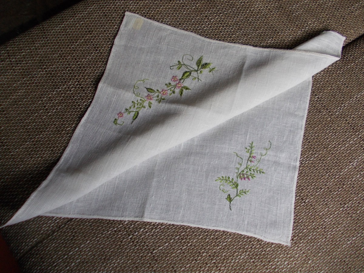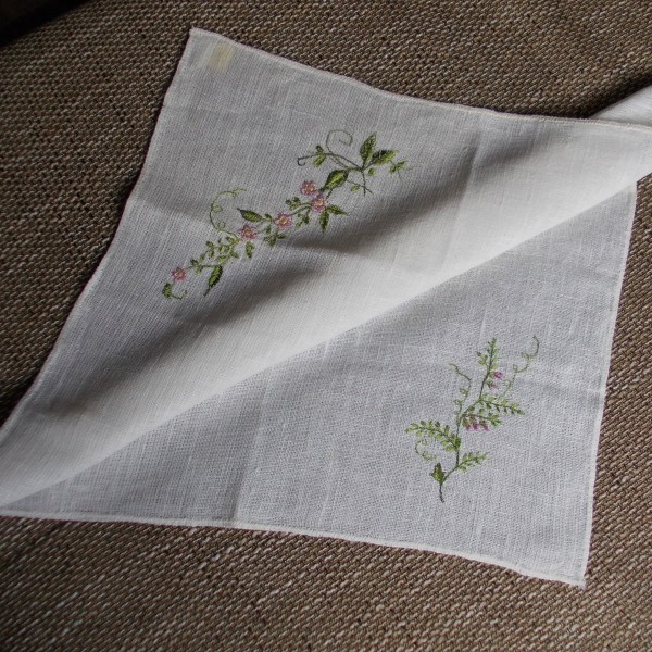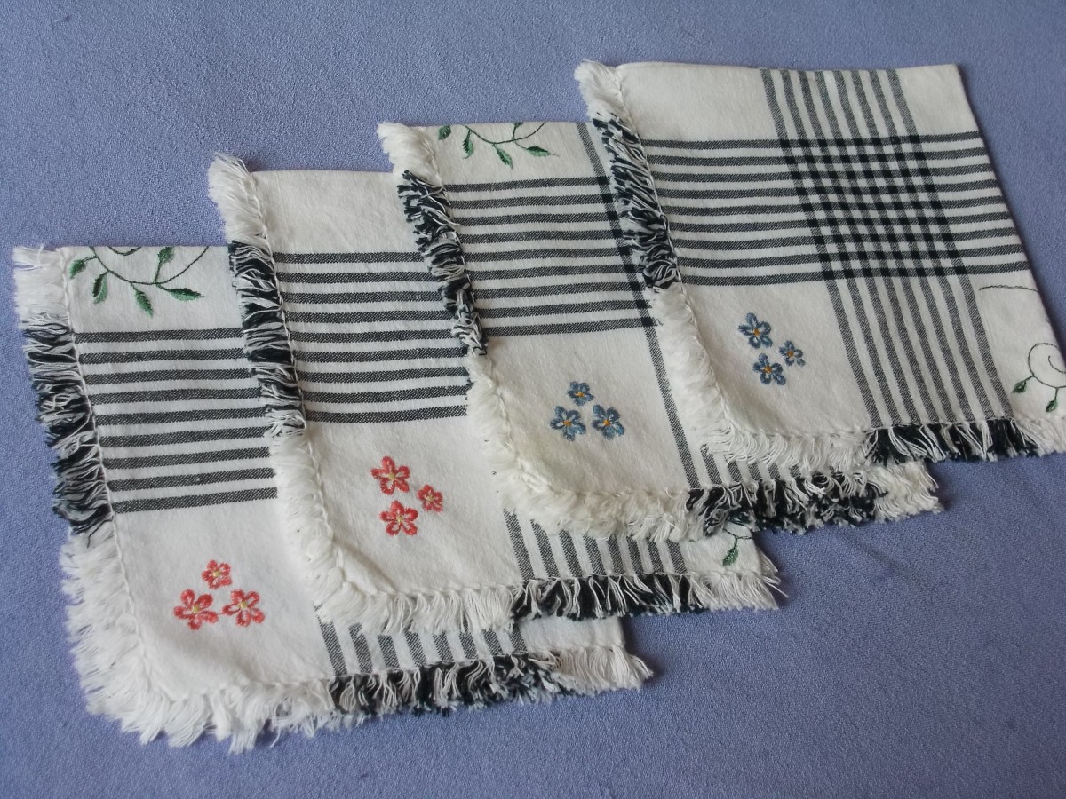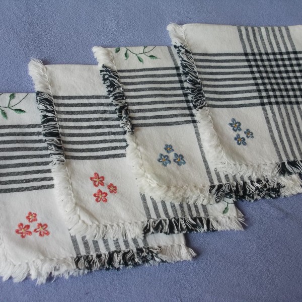 cena 12.00 eiro, 3. četras salvetes, kokvilnas, izšūti ziedi, 39x39 cm. cena 6.00 eiro gab. Autores zīmējumi.