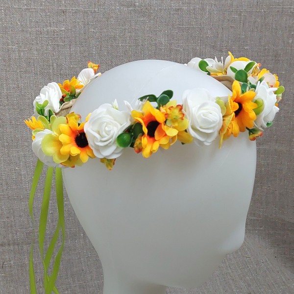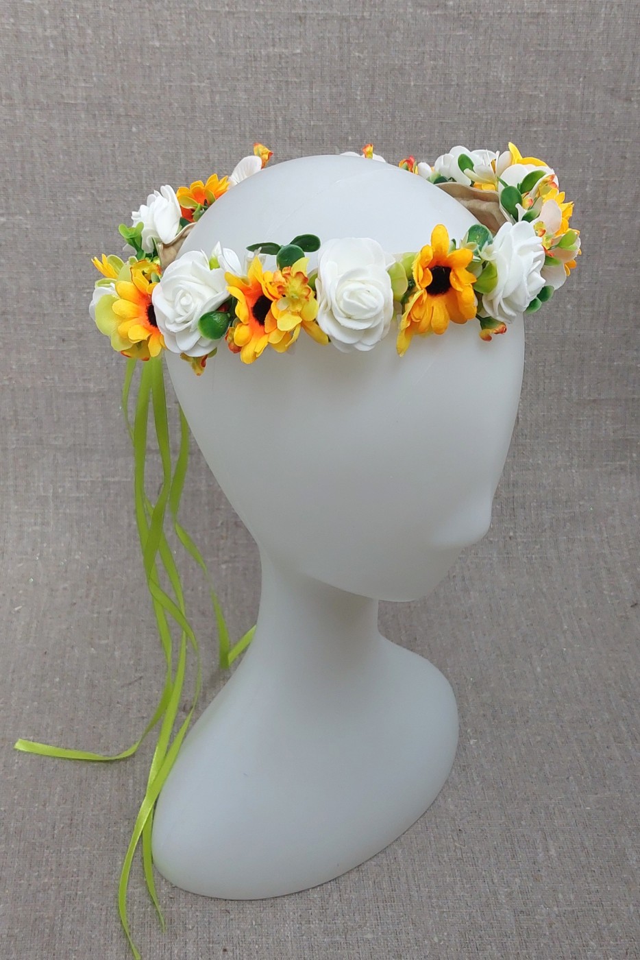 Regulējas sasienot ar lentēm aizmugurē. Derēs gan pieaugušam, gan bērnam.Ziedu garums 52-54 cm. Ir arī daudzi citi vainadziņi. Rakstiet, nosūtīšu vairāk bildes.