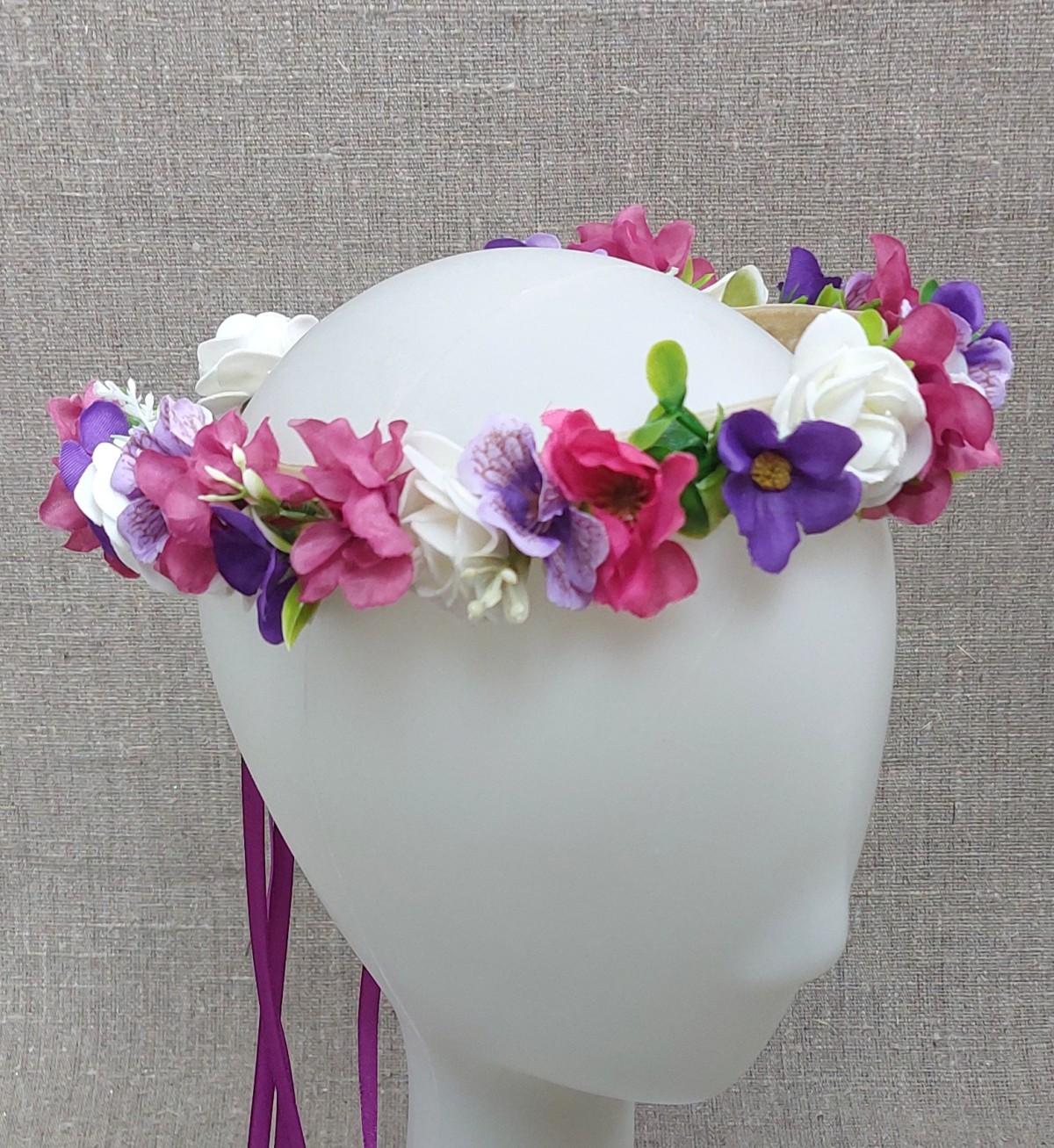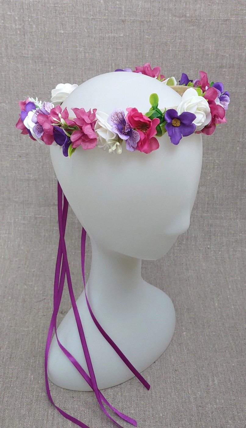 Regulējas sasienot ar lentēm aizmugurē. Derēs gan pieaugušam, gan bērnam.Ziedu garums 52-54 cm. Ir arī daudzi citi vainadziņi. Rakstiet, nosūtīšu vairāk bildes.