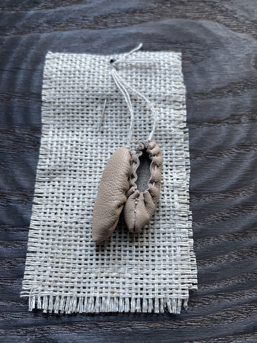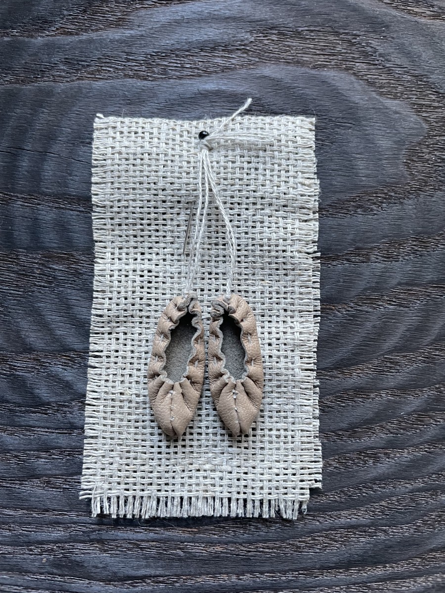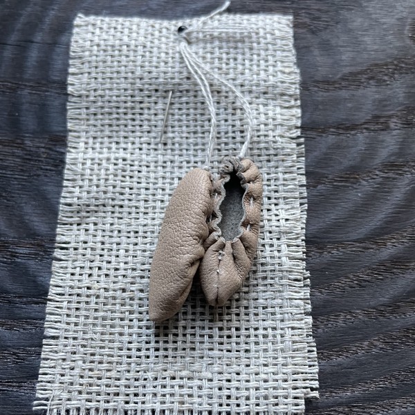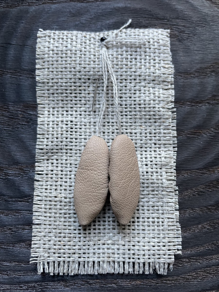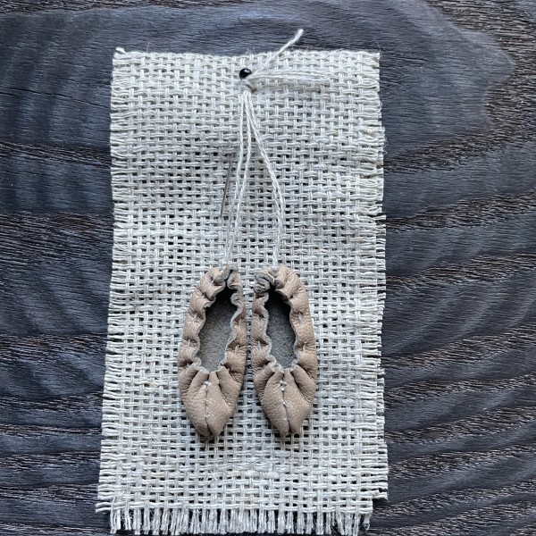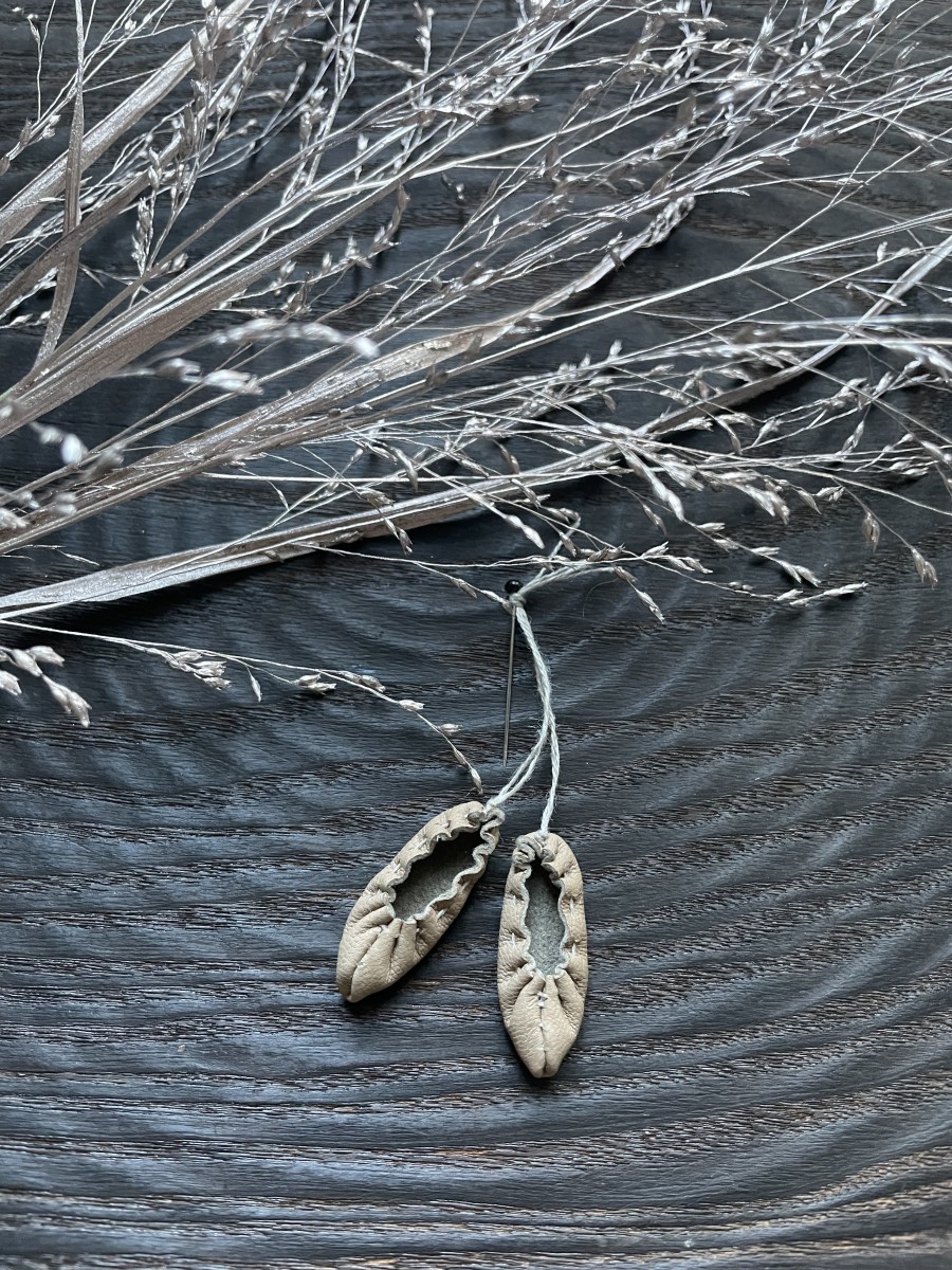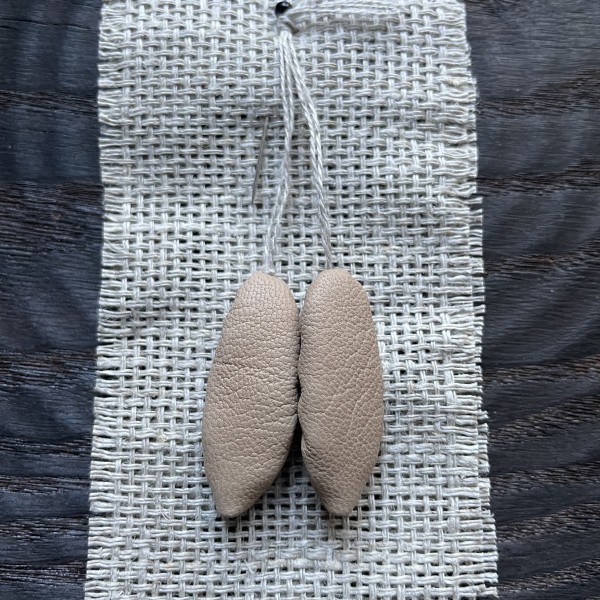 Mazītiņas ādas pastaliņas (3,3cm) no dabīgās ādas, linu aukliņā, piespraužamas ar kniepadatu. Iespējami dažādi toņi.