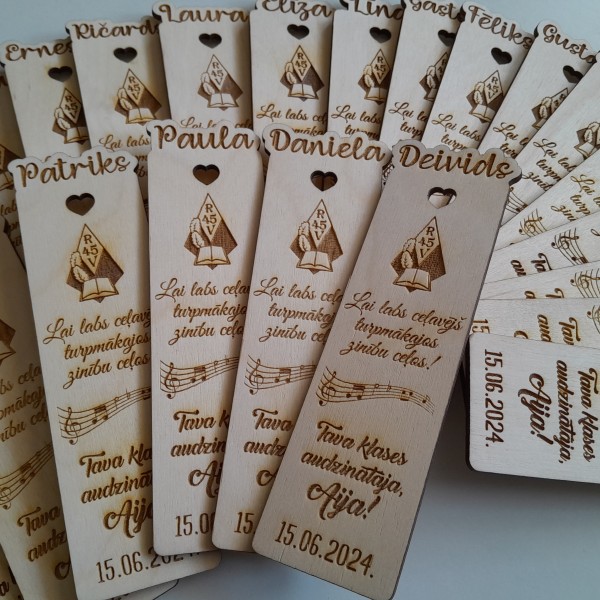 Grāmatzīmes ar Jums vēlamo tekstu, vārdiem un simboliem (piem. skolas logo).