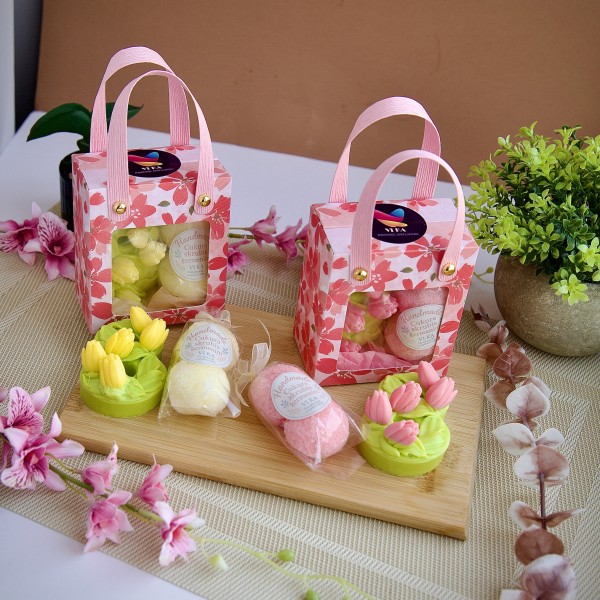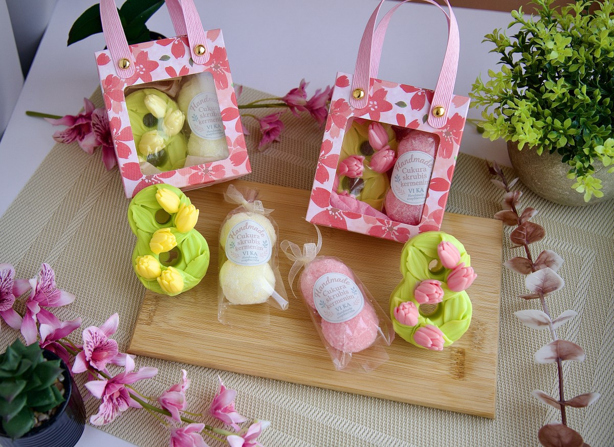 8.marta dāvana skaistā iepakojumā. Somiņā ziepes un ķermeņa cukura skrubīši. Kastītes izmērs 8,5*10cm. Pieejams divās krāsās-rozā vai dzeltens