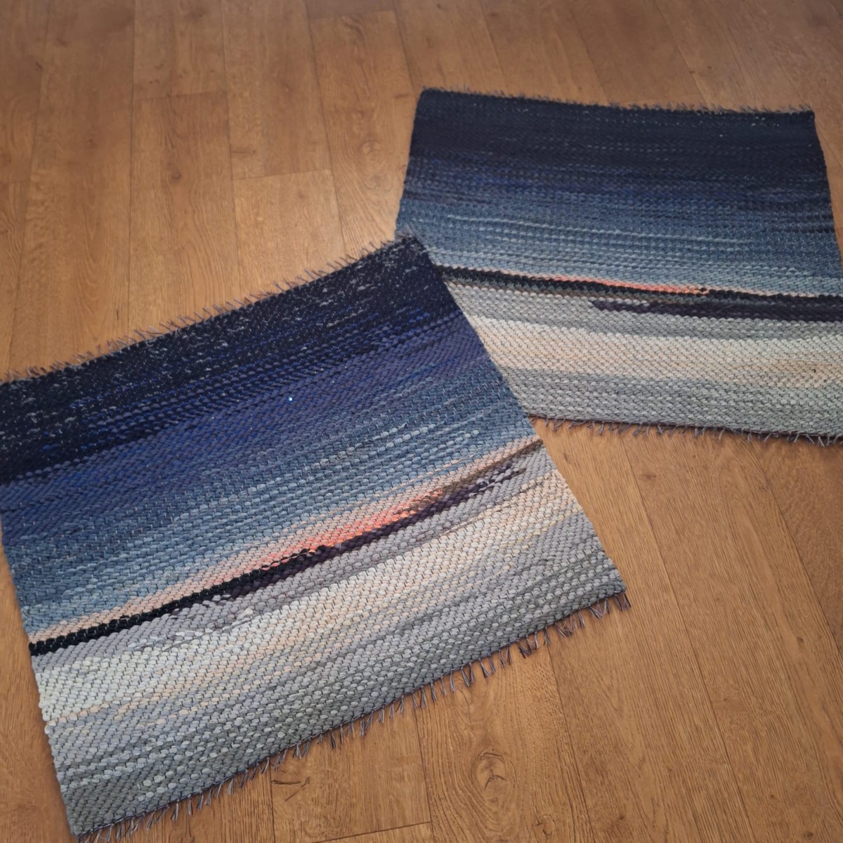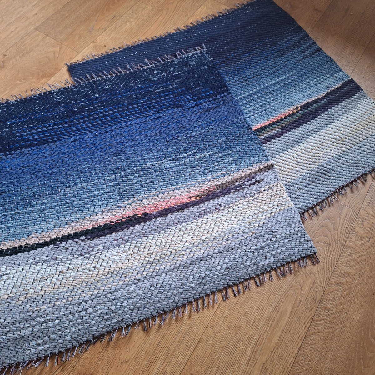 Neparastas un praktiskas dāvaniņas. Paklājiņi kā nelielas ainavas ar ziemas debesīm.0.63 x 0.68 un 0.61 x 0.68m. Pārstrādāts tekstils, kokvilnas velki. Cena 18 eiro par vienu. #neparastas_davanas_ziemassvetkos #davana_diviem #originalas_ziemassvetku_davanas