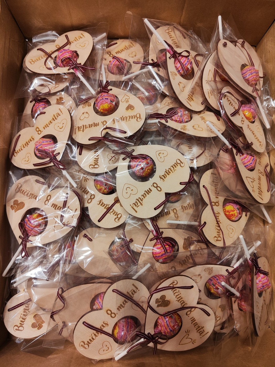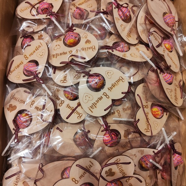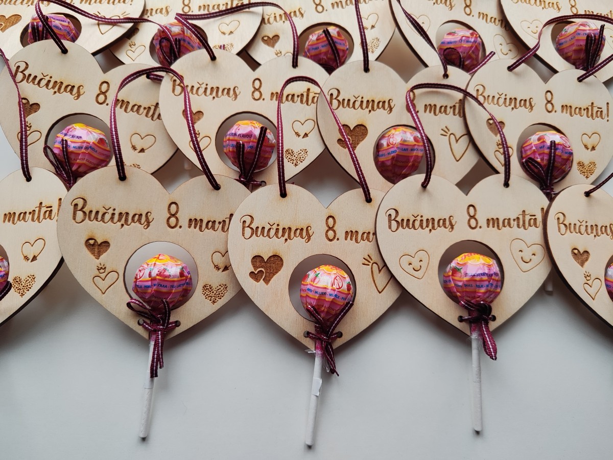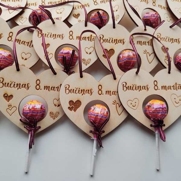Bērza saplākšņa sirsniņa ar gravēju + konfekte. Gravējums personalizējams.