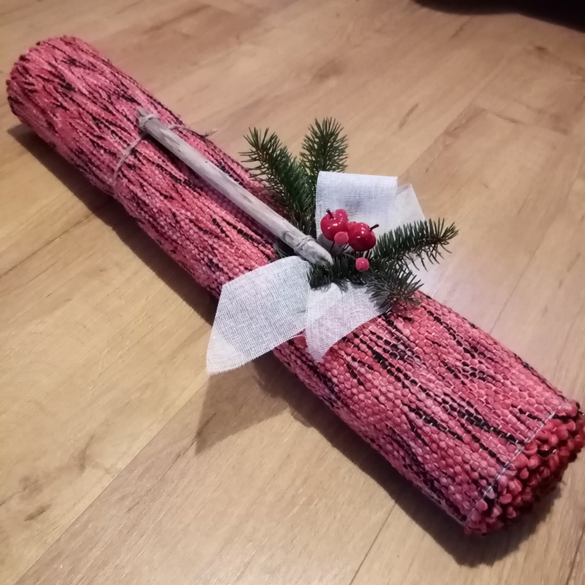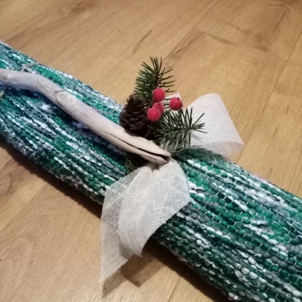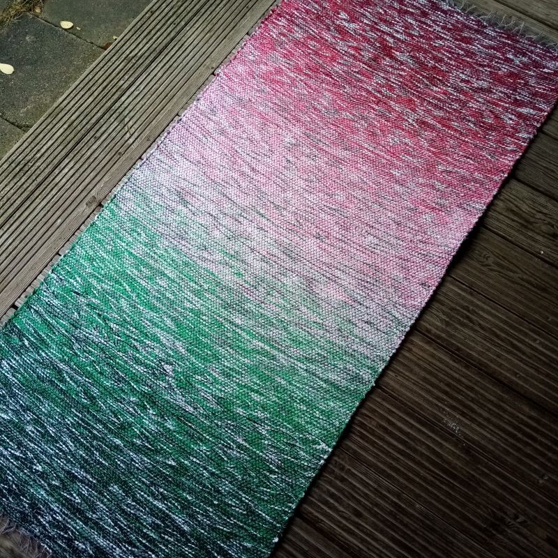 No diegiem / dzijas austs paklājs, kuram pakāpeniski uz vidu mainās tonis uz gaišāku. Gali vienādi - tumšāki. Izmērs : 2,11 m x 0,73 m. Var izmantot arī kā dīvāna pārklāju. Būs skaista un praktiska dāvana jebkuros svētkos. Ērtākai pasniegšanai noformēts ar jūras izskalotu kociņu, kurā ievērta lina šņorīte. Otrs 1,60 m garš, 56 eiro. Šo var izmantot arī kā atpūtas krēsla pārklāju. Katrs gals citā tonī. Varam arī vienoties par kādu citu krāsu vai garumu, jo šobrīd ir izvēle.
