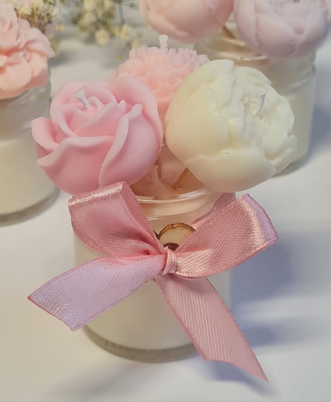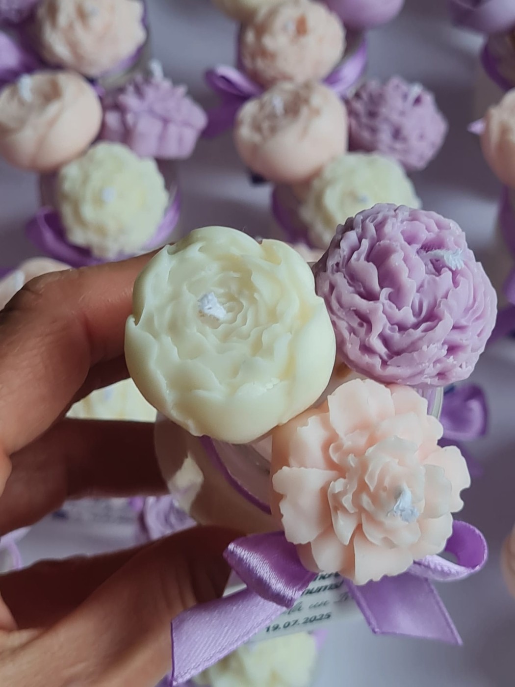 40 ml sojas vaska svece burciņā ir papildināta ar nelieliem sojas vaska sveču ziediņiem.