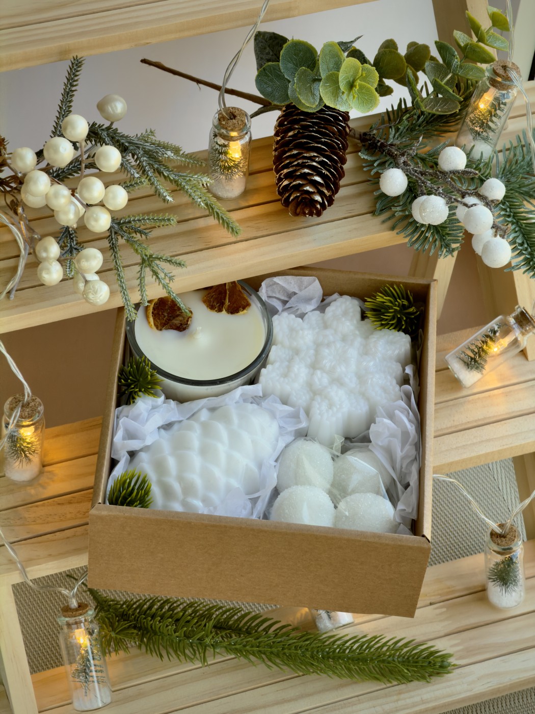 Svētku komplekts. Komplektā- svece, ziepes-čiekurs, pārsla, cukura skrubīsbumbiņas. Roku darbs.