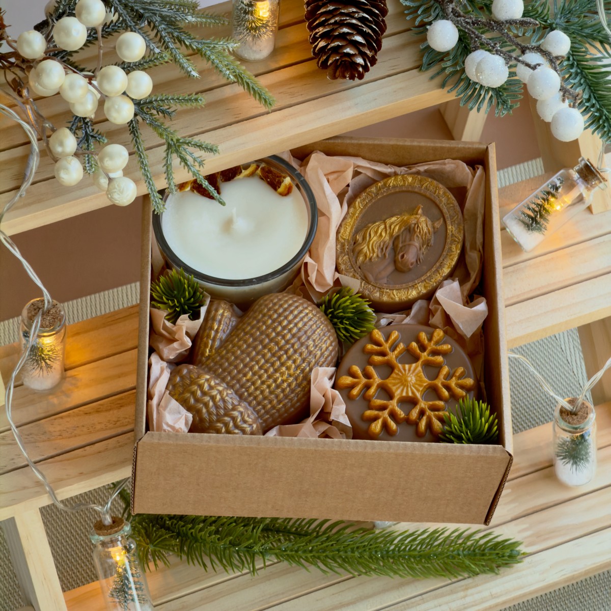 Svētku komplekts. Komplektā- svece, ziepes-cimdiņš, zirgs, sniegpārsla. Roku darbs.