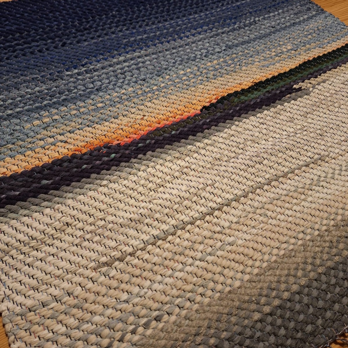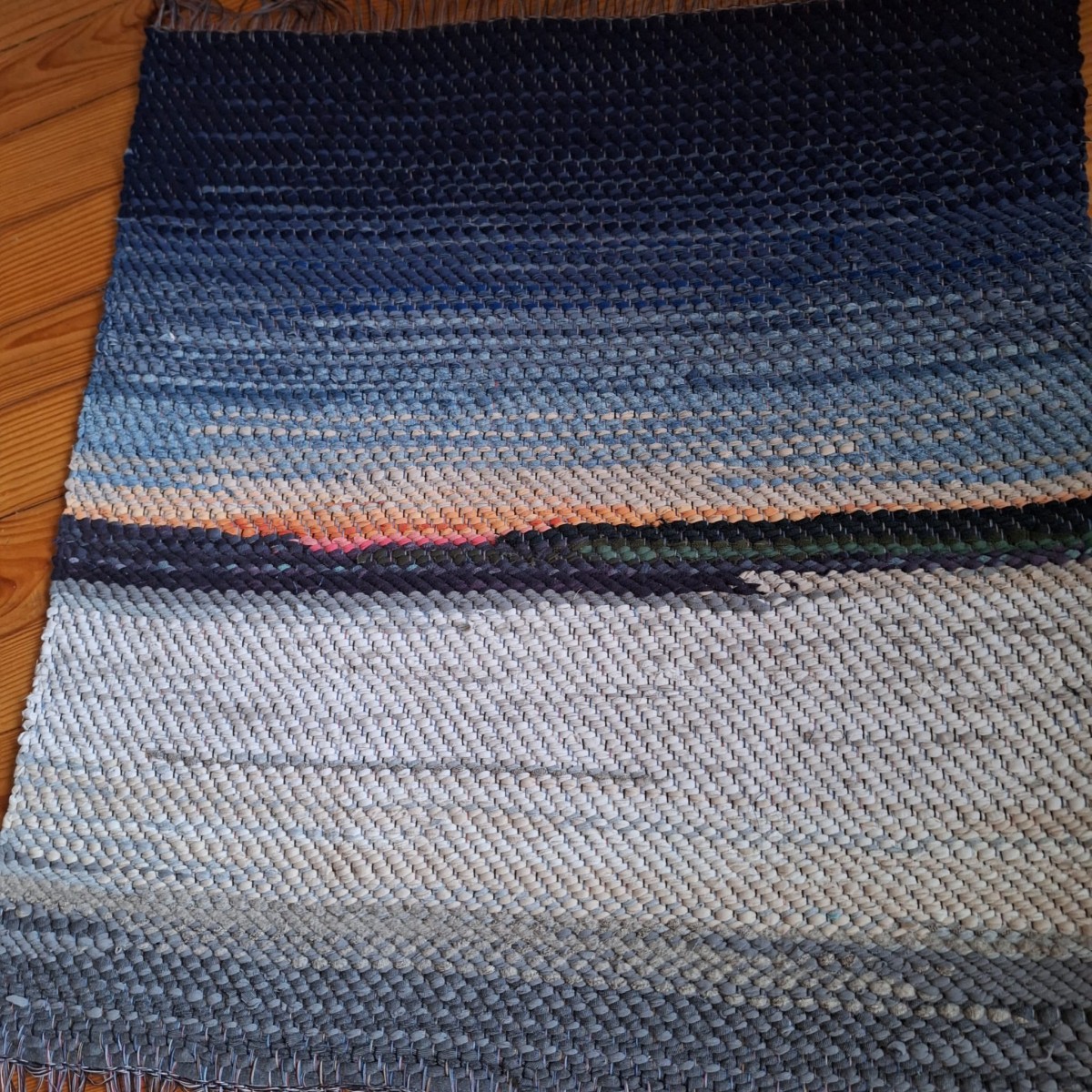 Mākslinieciska un praktiska dāvana Ziemassvētkos. No pārstrādāta tekstila austs paklājiņš ar ziemas ainavas motīvu. 0.72m x 0.69m.