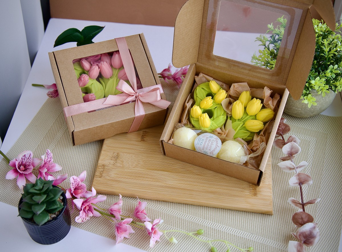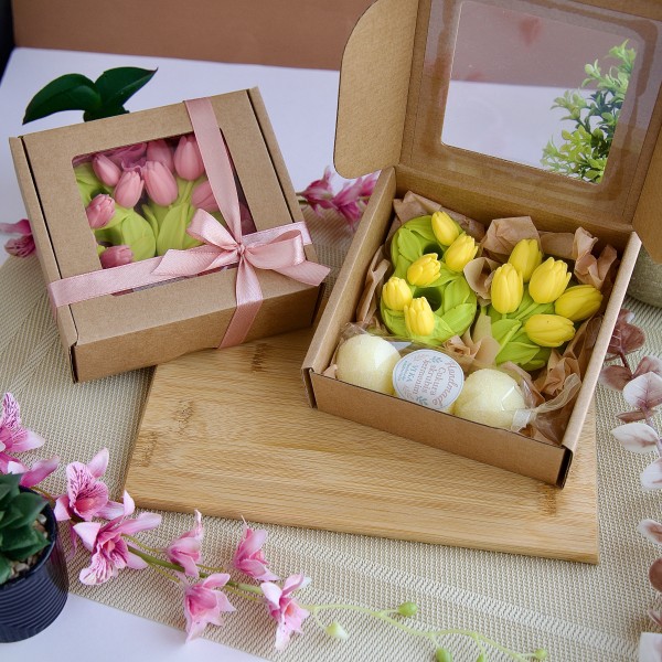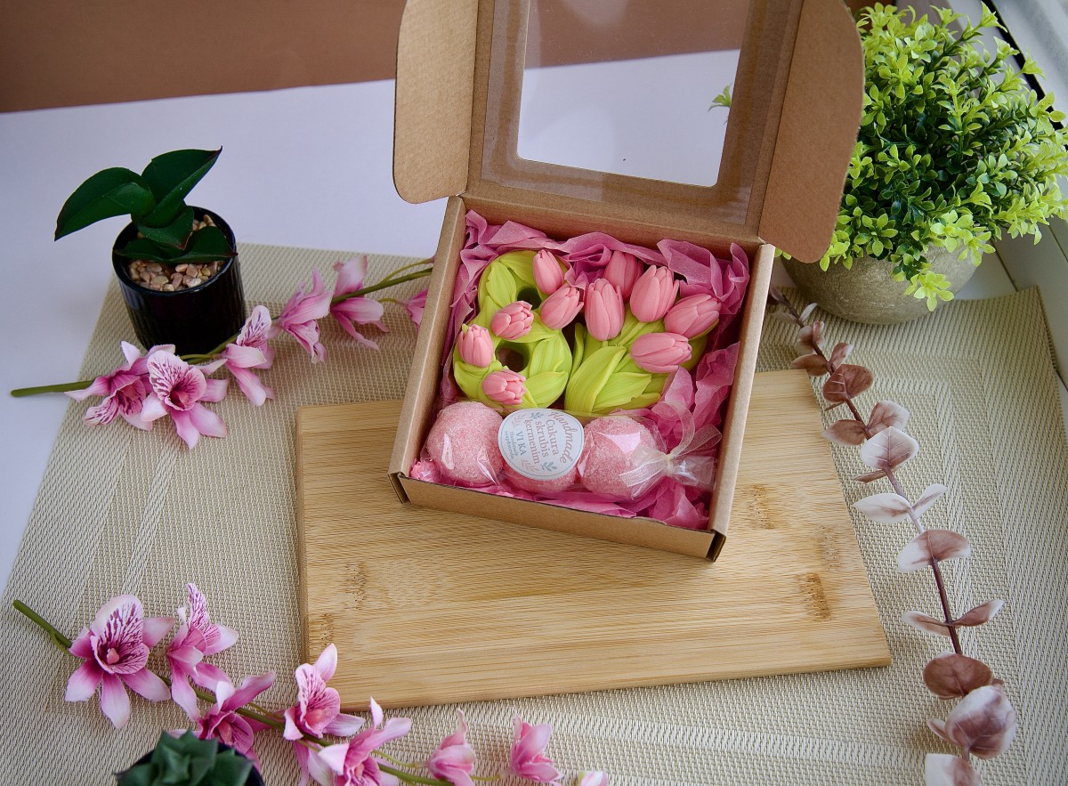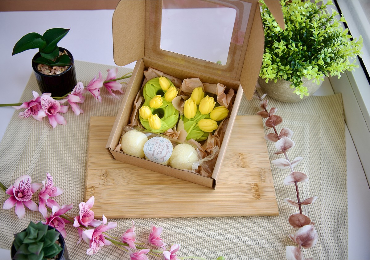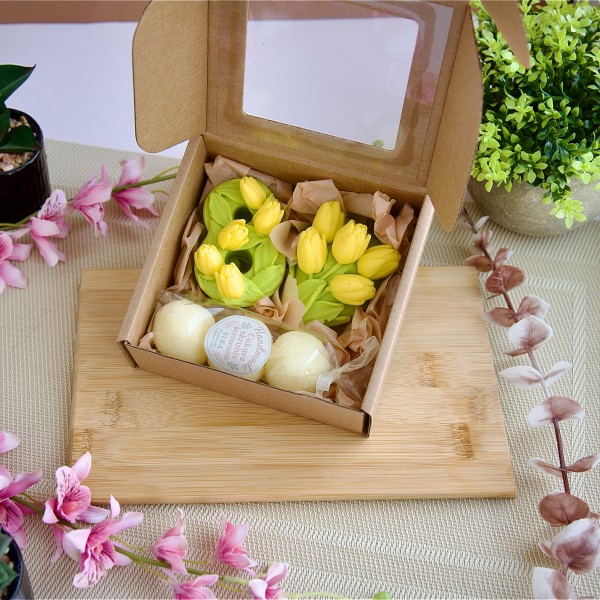 Ziepju dāvanu komplekts. Kastītes izmērs 12x12cm. Pieejams divās krāsās- rozā vai dzeltens. Komplektā ietilpst ziepes un cukura ķermeņa skrubīšbumbiņas.