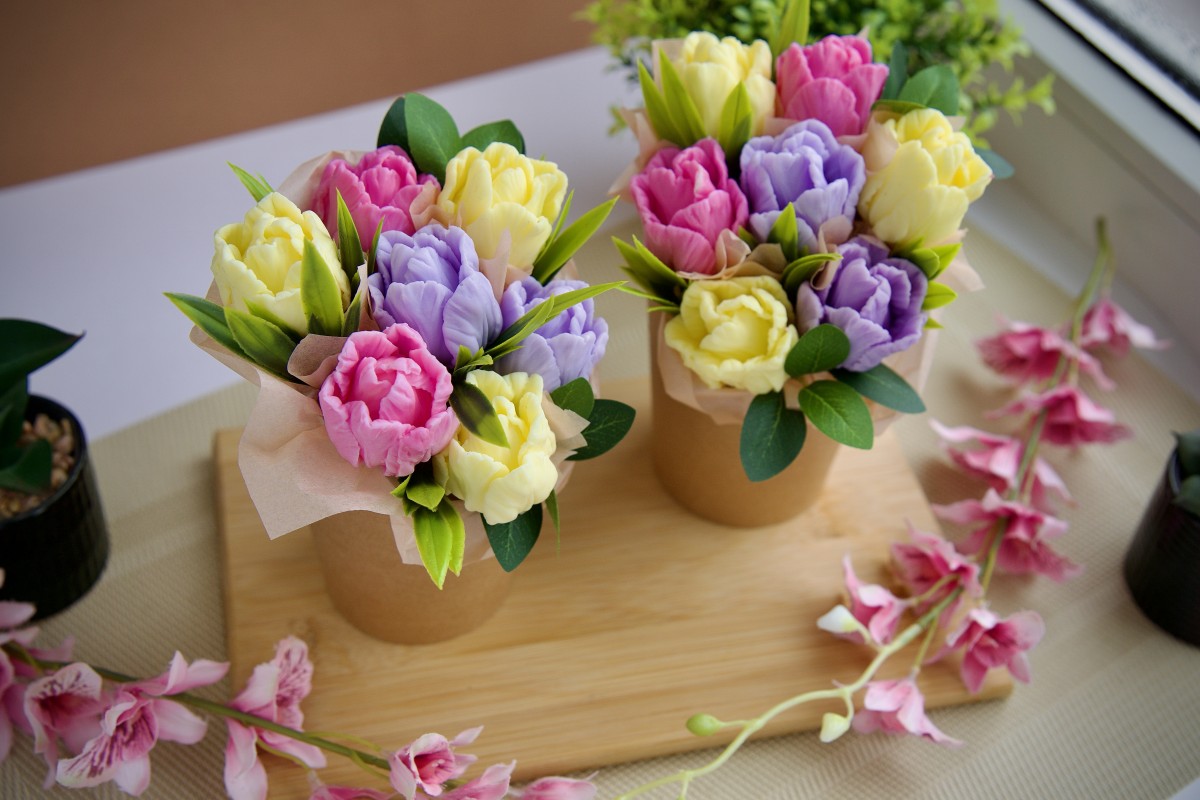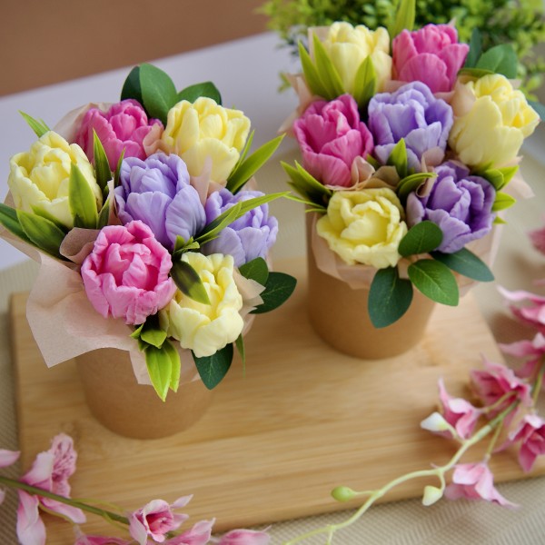 Ziepju tulpju pušķis. Pušķa augstums 14-15cm. Katrs zieds ir atsevišķi uz kociņa, to var izņemt no pušķa un izmantot kā parastu ziepes gabaliņu.