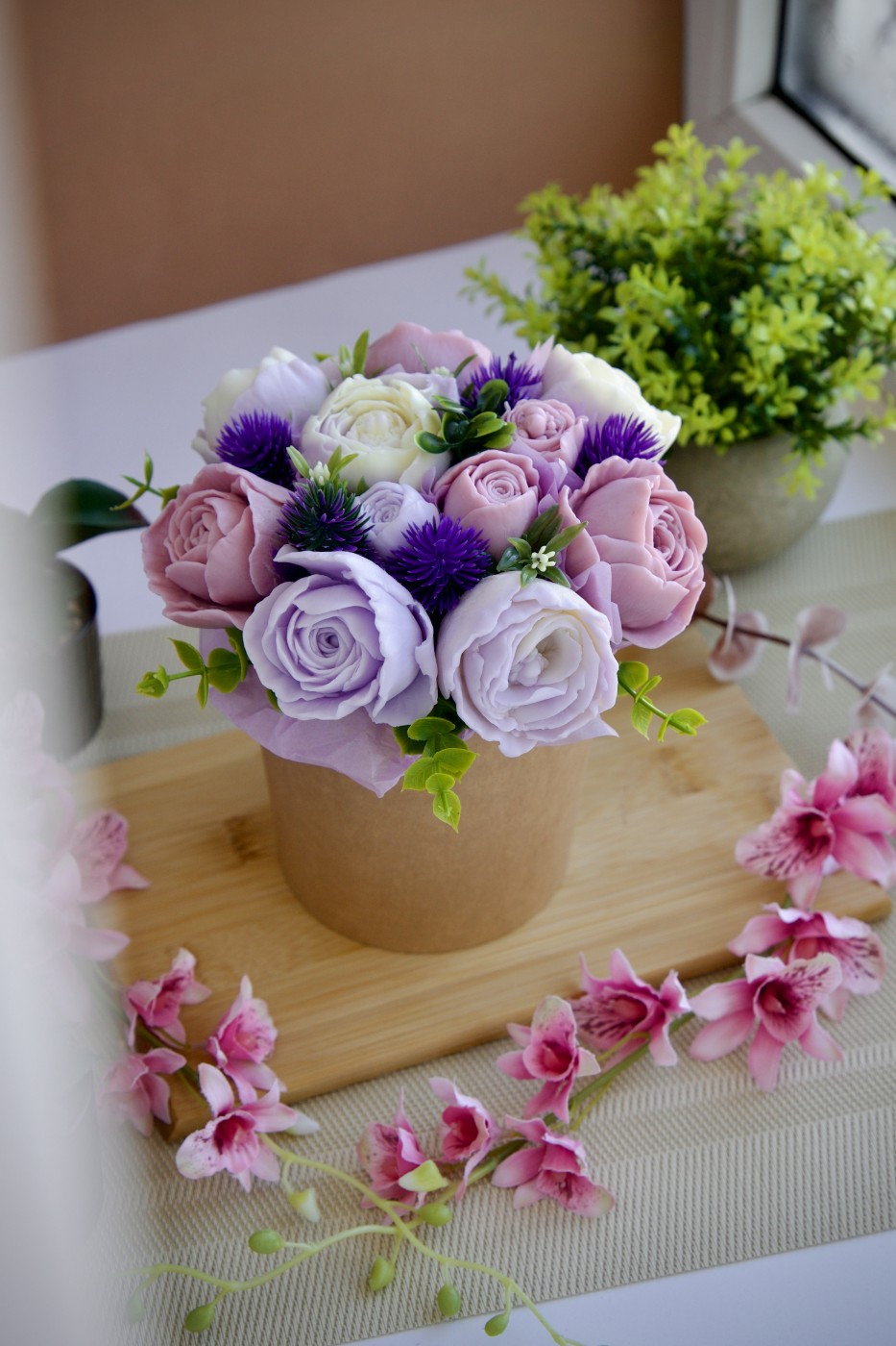 Ziepju pušķis violetos toņos. Ilgi priecēs un pēc tam varēs izmantot arī praktiski. Katrs zieds ir izņemams no pušķa un var izmantot kā ziepes gabaliņu.