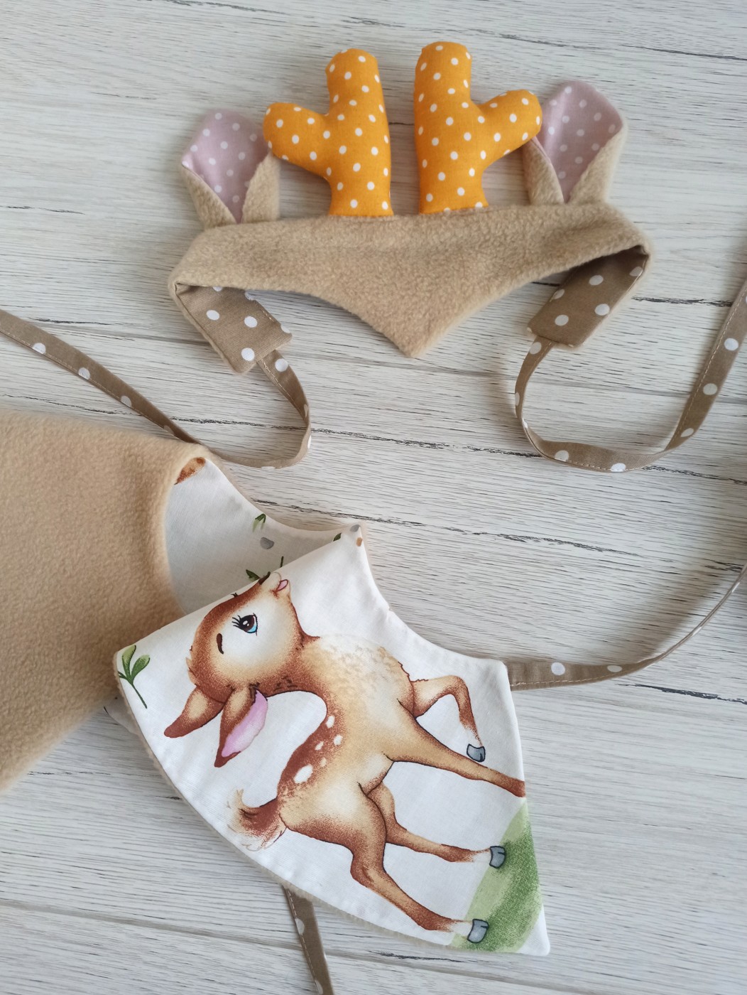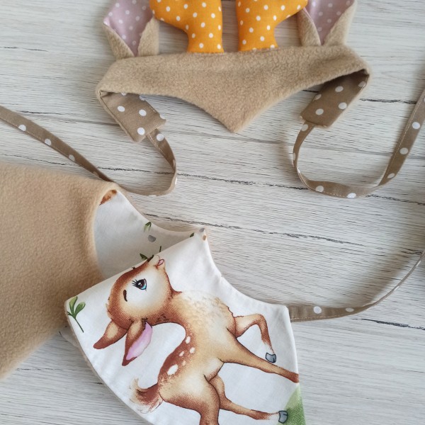 Saite ar ausīm un ragiem ir regulējama. Audums - pūkains flīsa audums, kokvilnas odere.