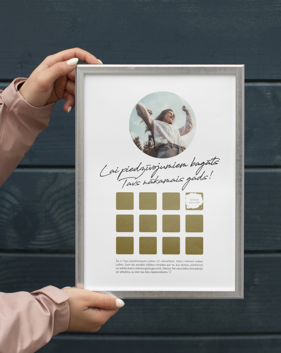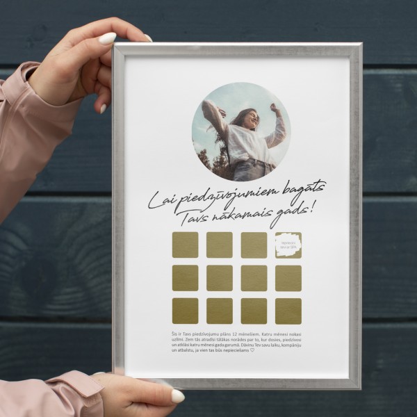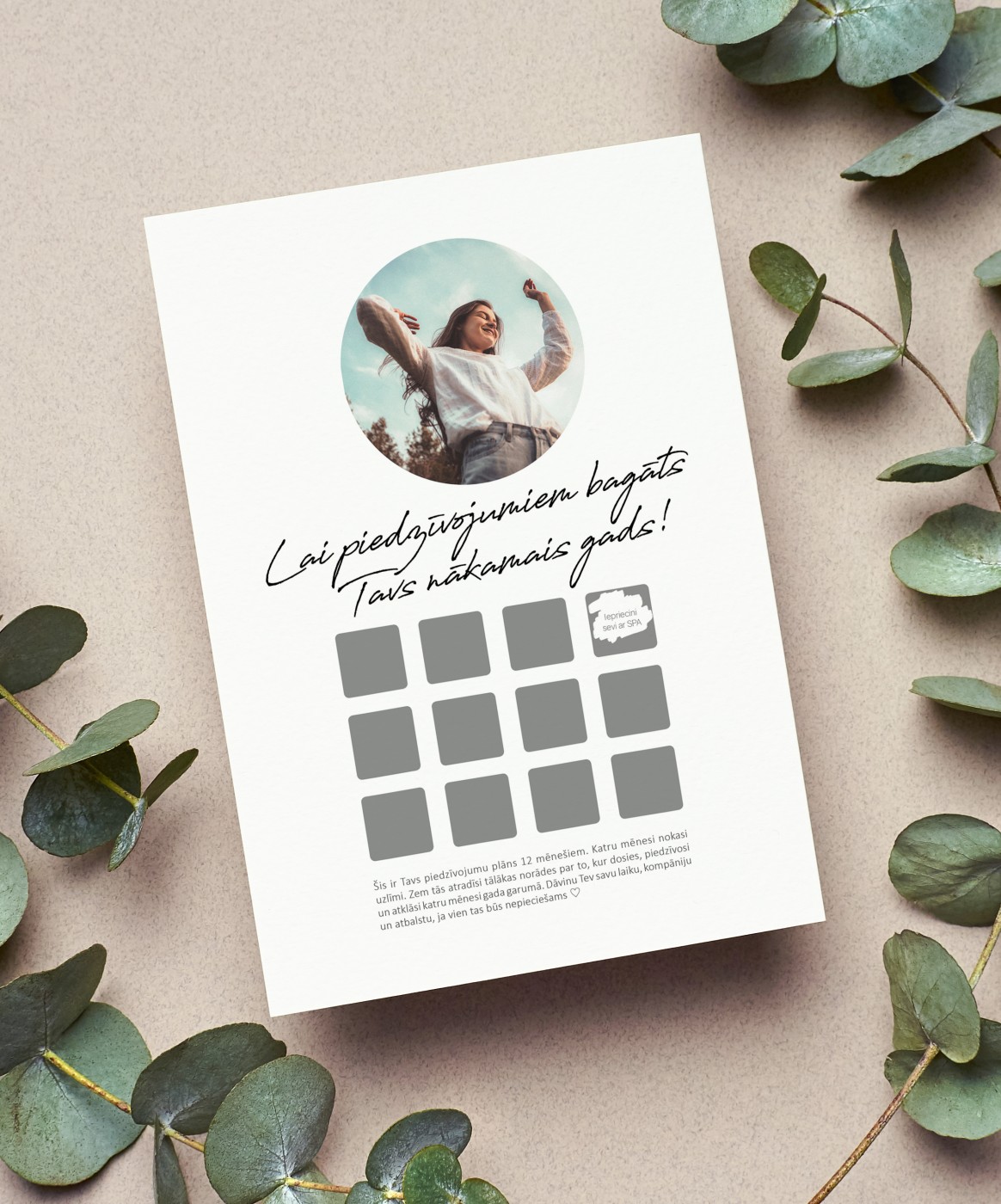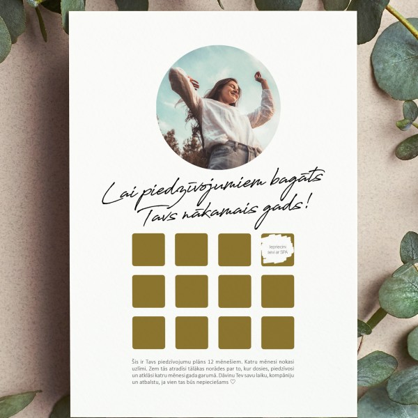 "Šis ir tavs piedzīvojumu plāns 12 mēnešiem. Katru mēnesi nokasi uzlīmi. Zem tās atradīsi tālākas norādes par to, kur dosies, piedzīvosi un atklāsi katru mēnesi gada garumā. Dāvinu Tev savu laiku, kompāniju un atbalstu, ja vien tas būs nepieciešams ♡"