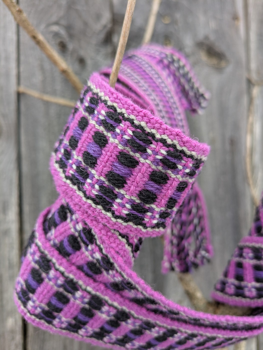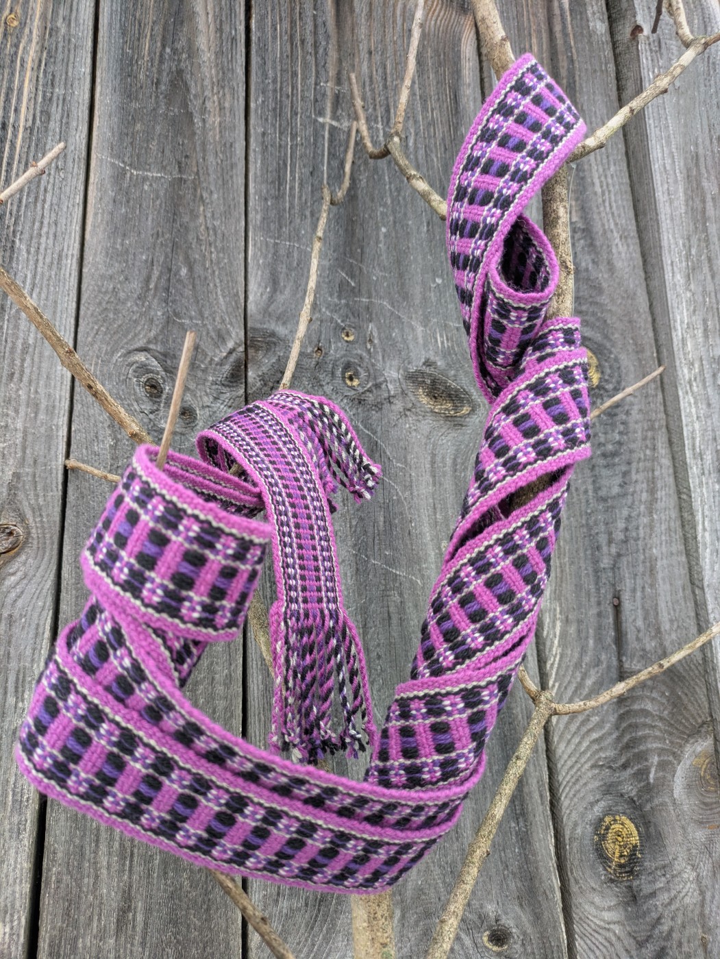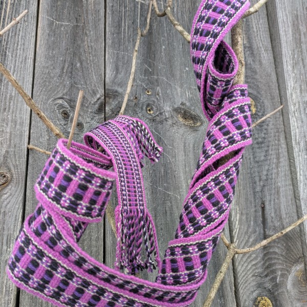 Alūksned josta austa trīs toņu lillā, melnā un pelēkā krāsā. Vilnas dzija.