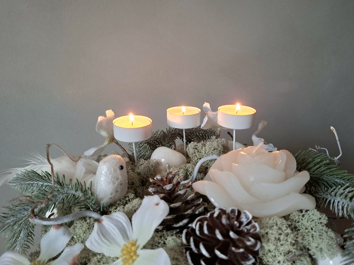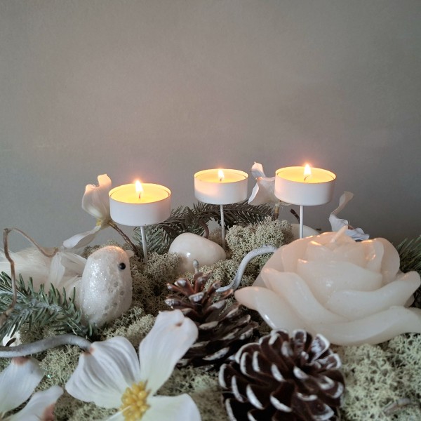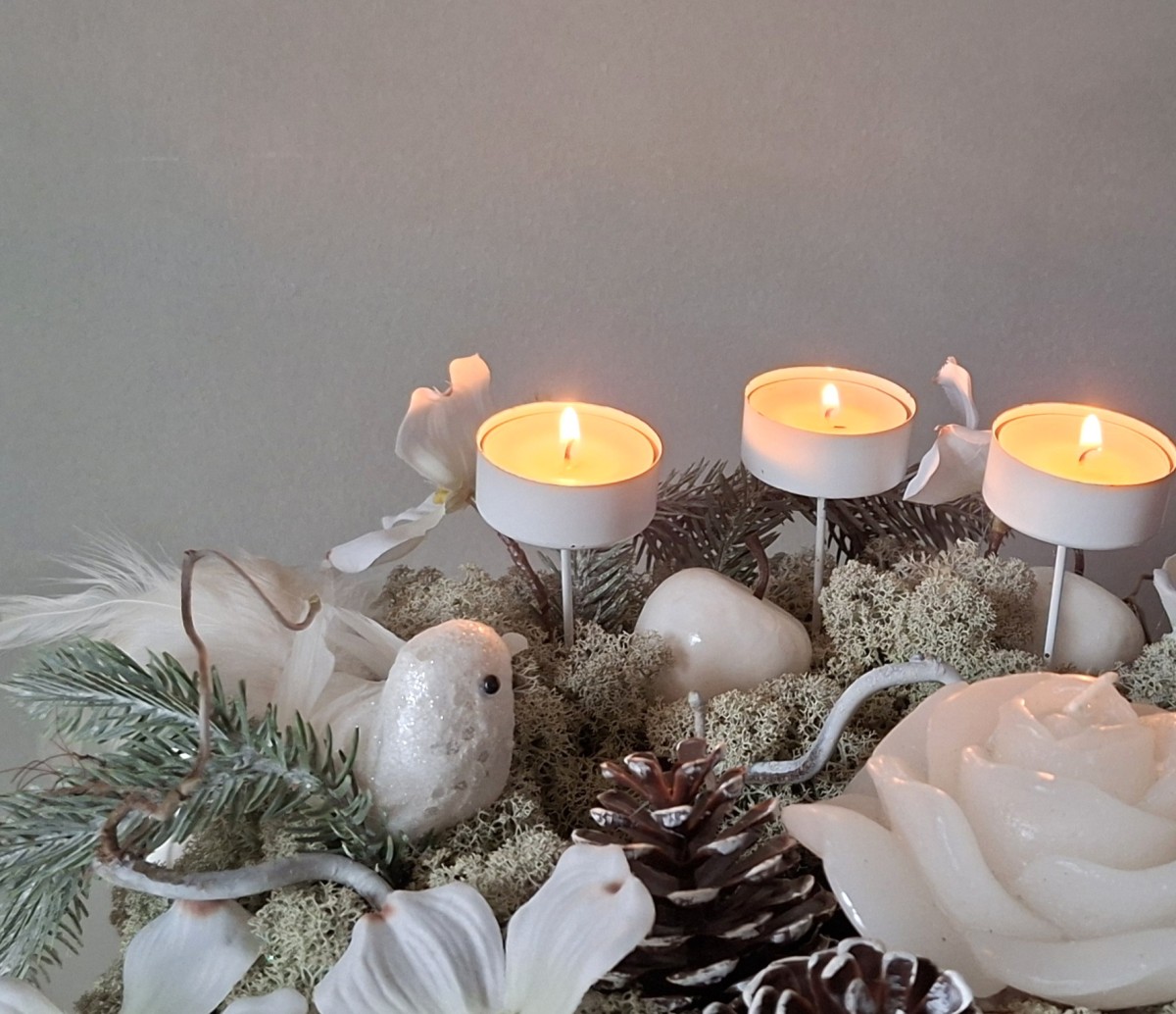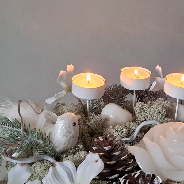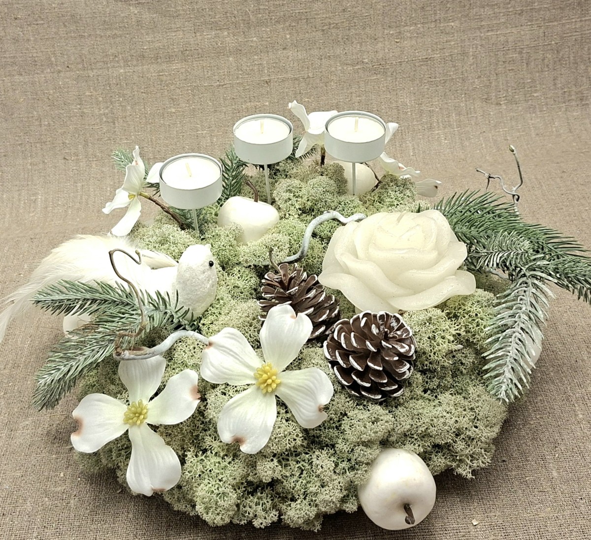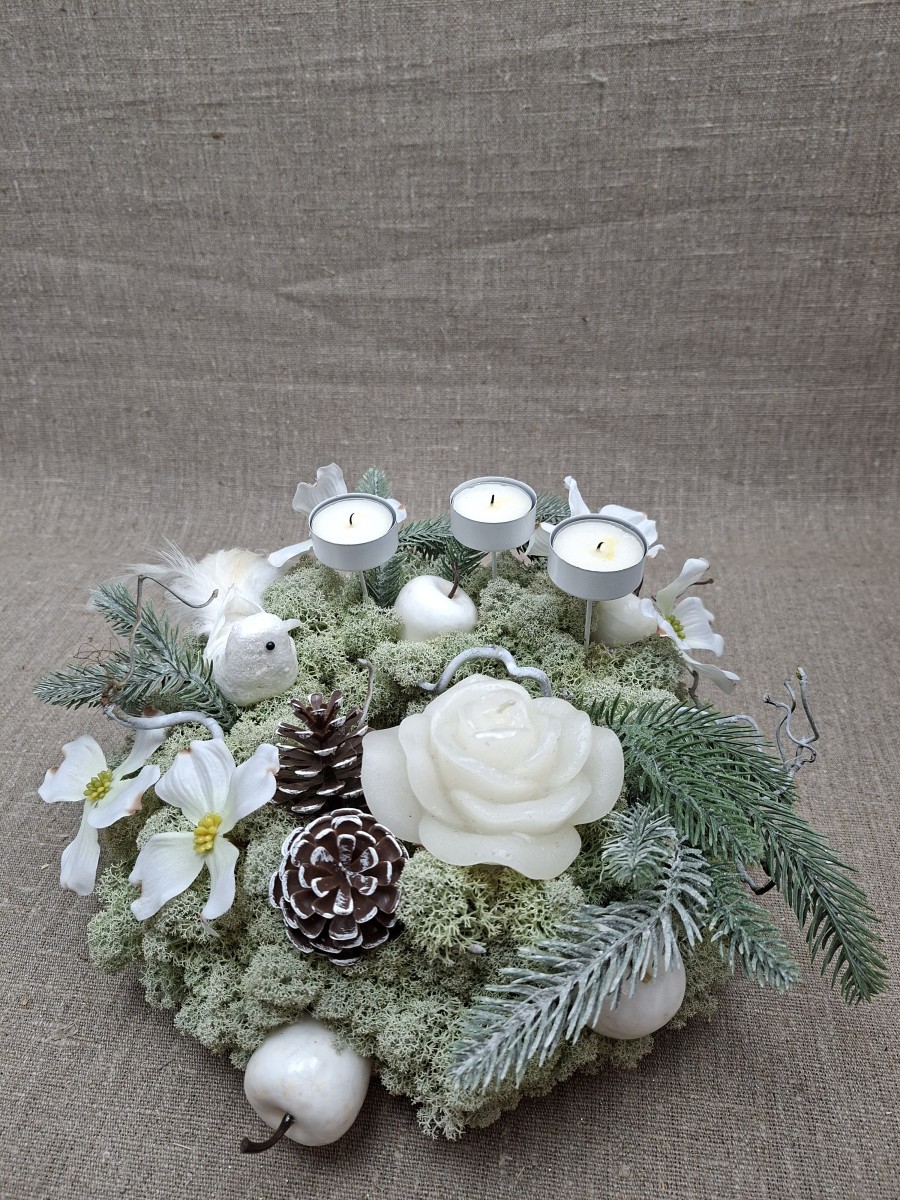 Dekora augstums ar svecītēm 36 cm. D=33 cm. Daudzgadīgs. Ar ļiti greznu balto putnu.
