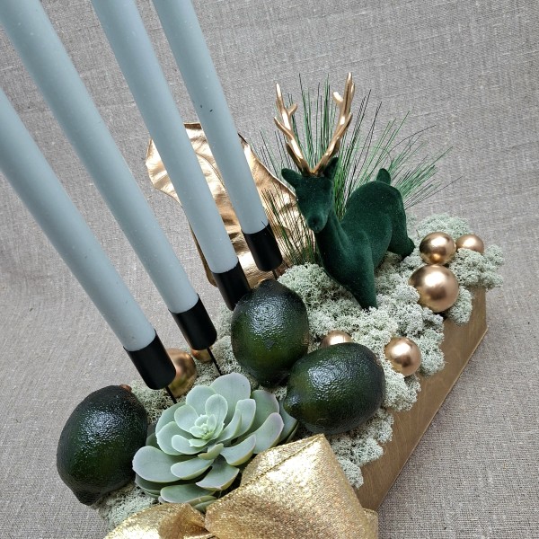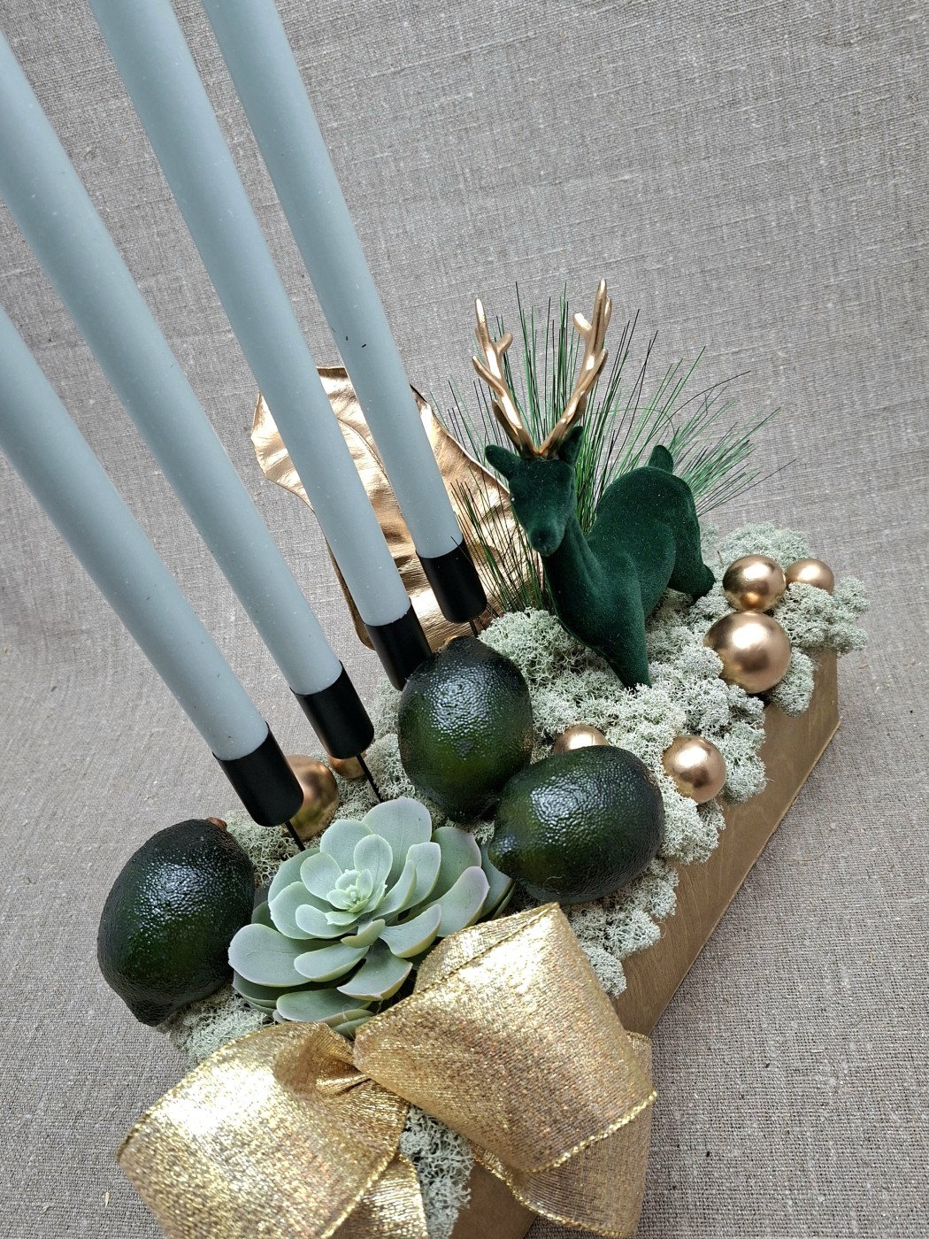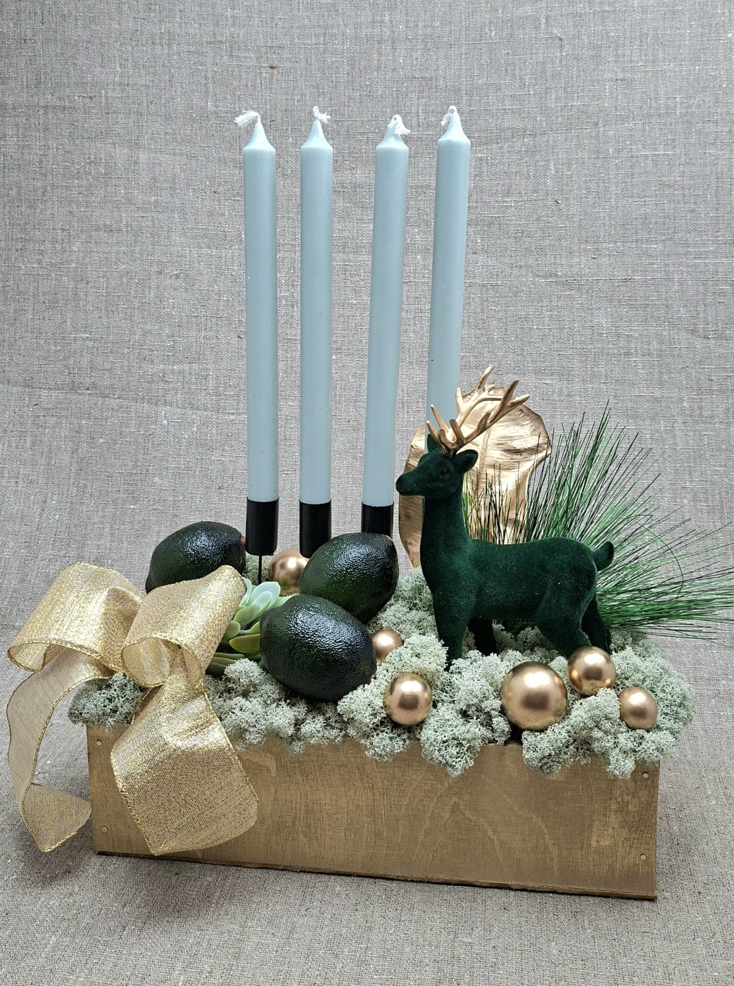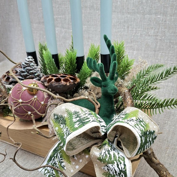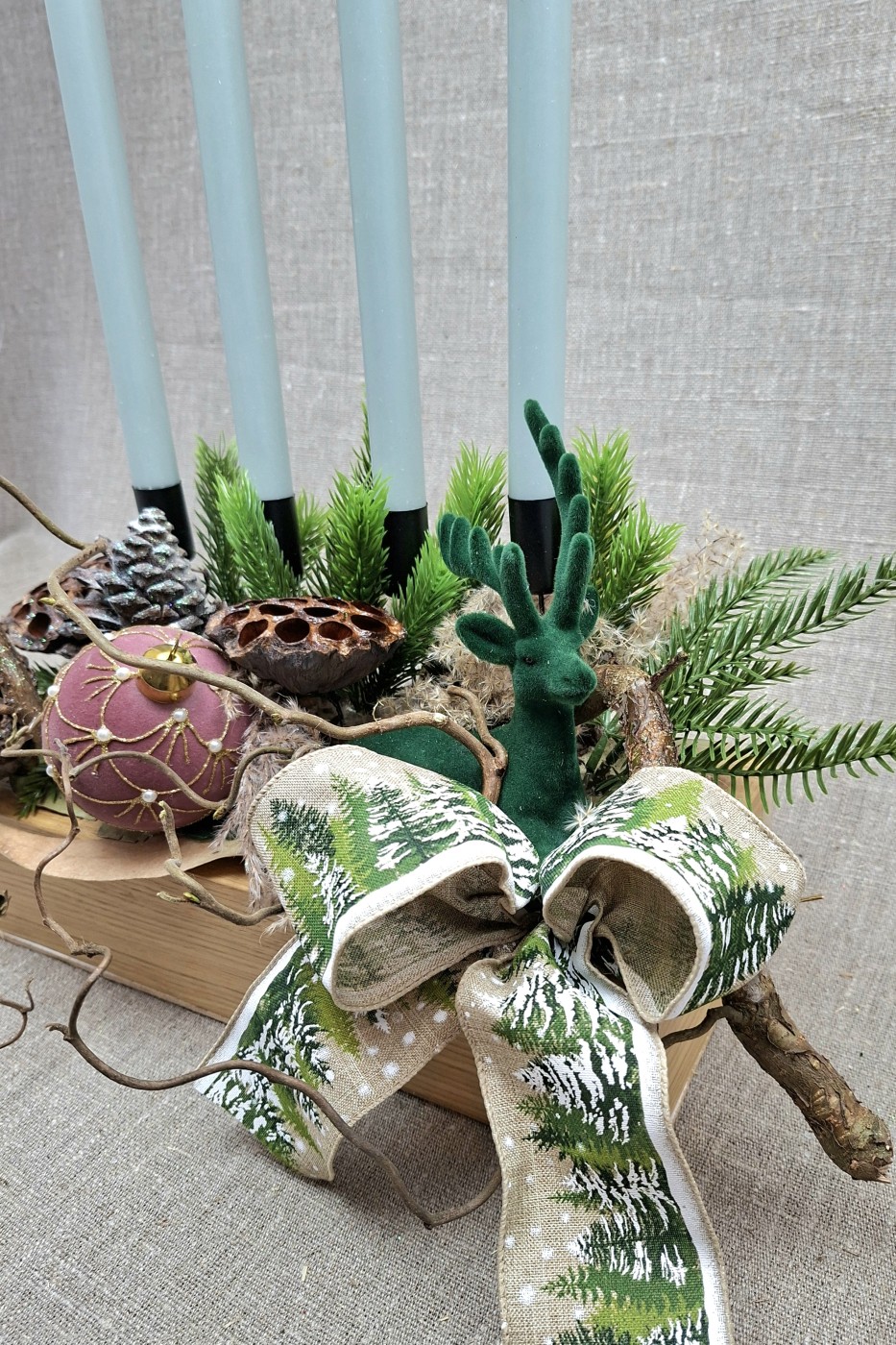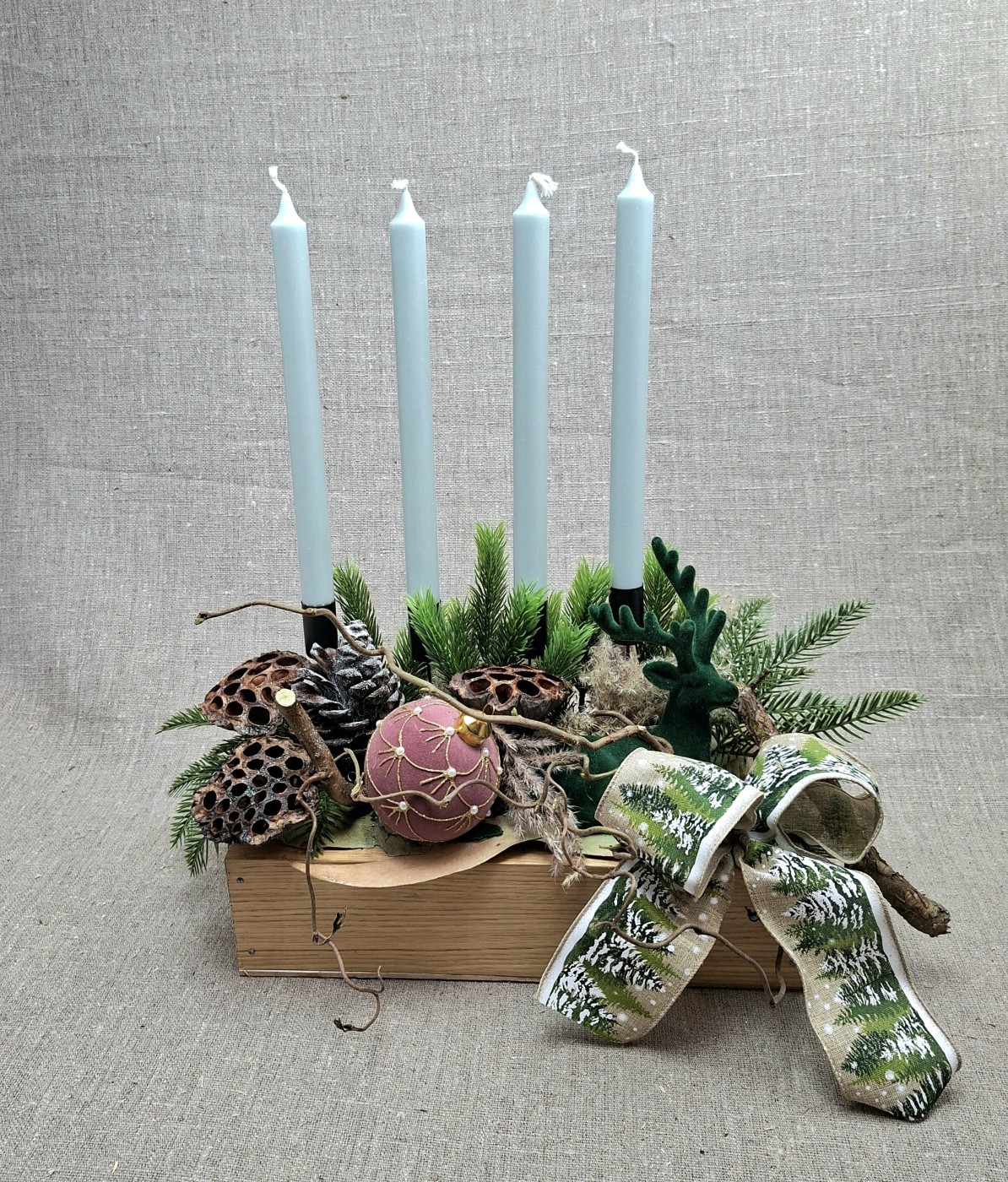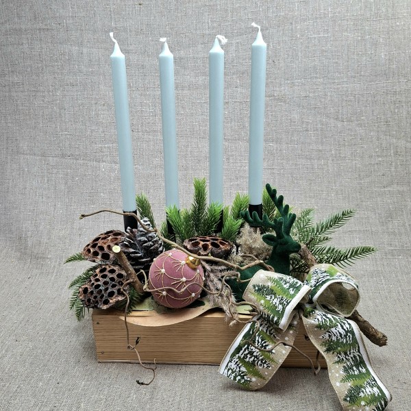 Dekors veidots koka kastītē, izmēri 34x15 cm. Dobeles garās sveces ir izņemamas no svečturiem. Pārdodas kopā ar svecēm.