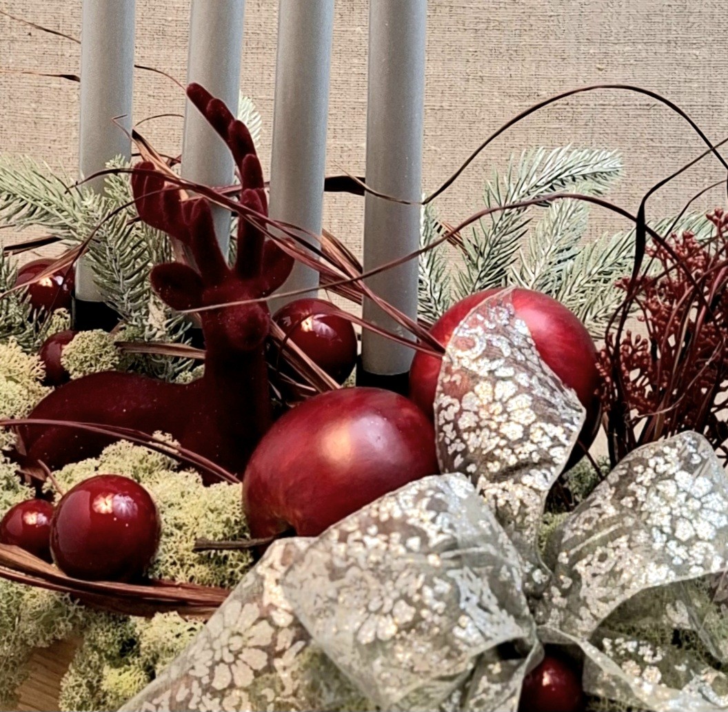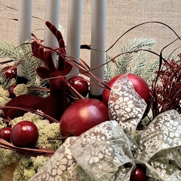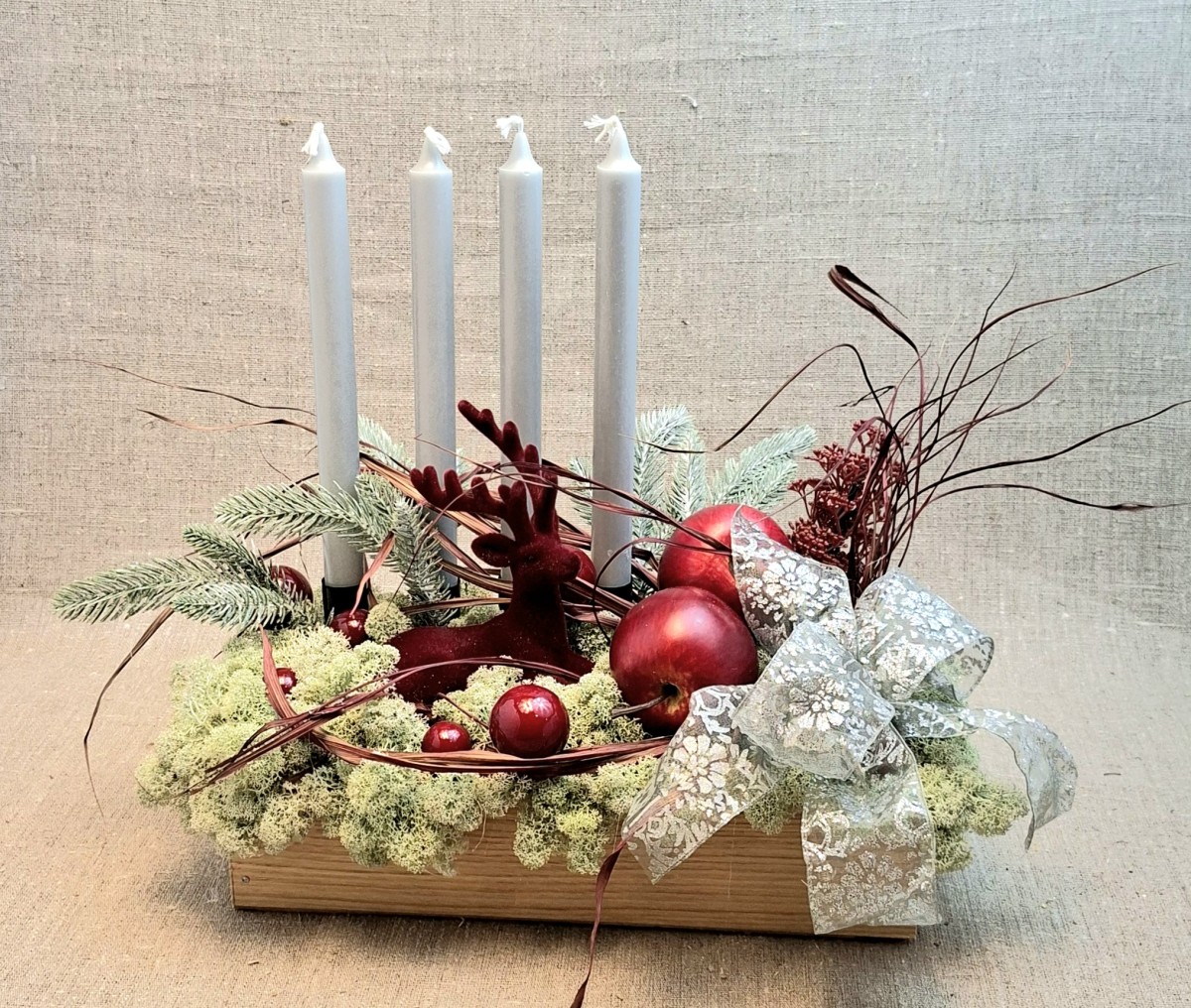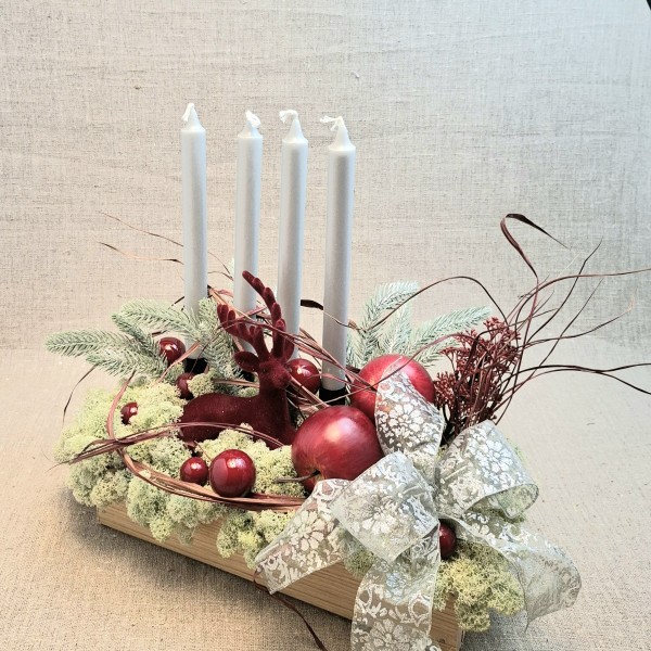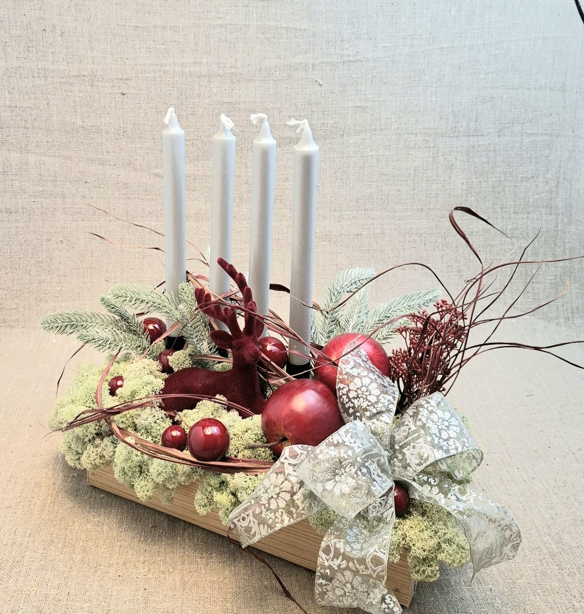 Dekors veidots koka kastītē, izmēri 34x15 cm. Dobeles garās sveces ir izņemamas no svečturiem. Pārdodas kopā ar svecēm. Daudzgadīgs.
