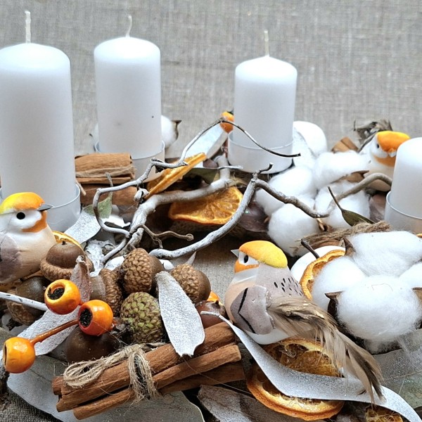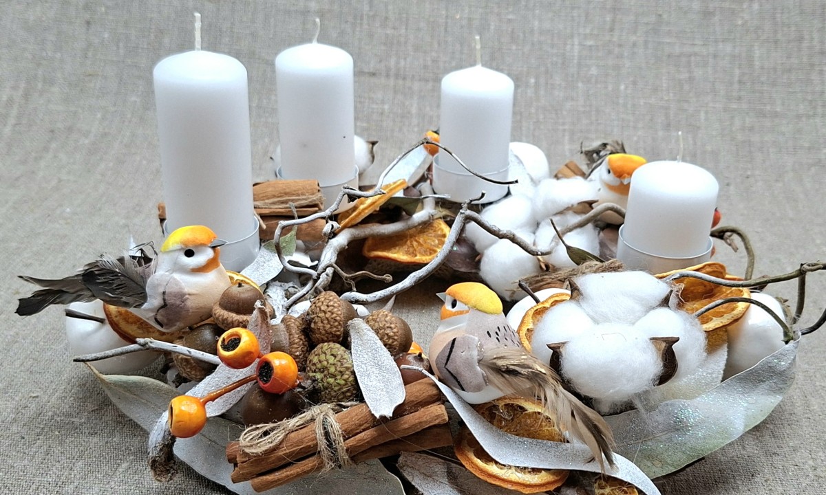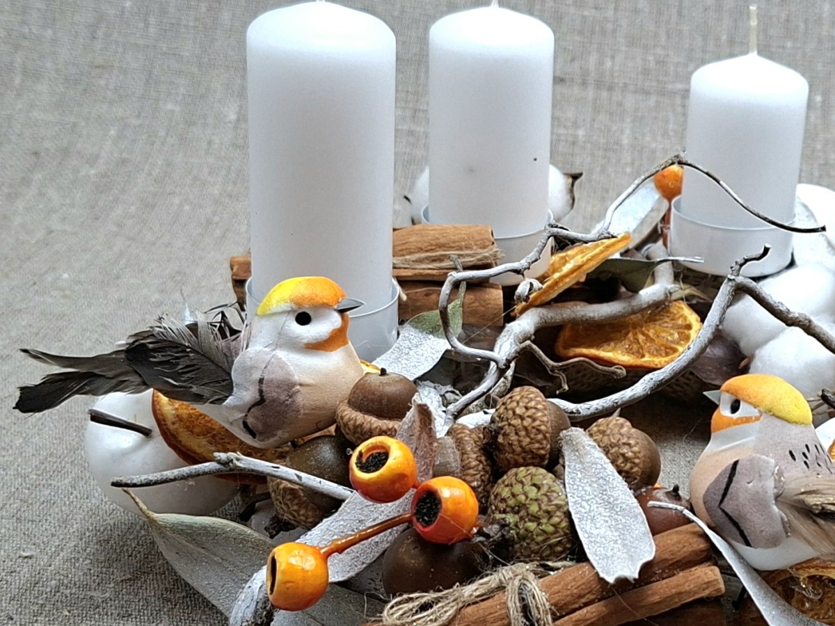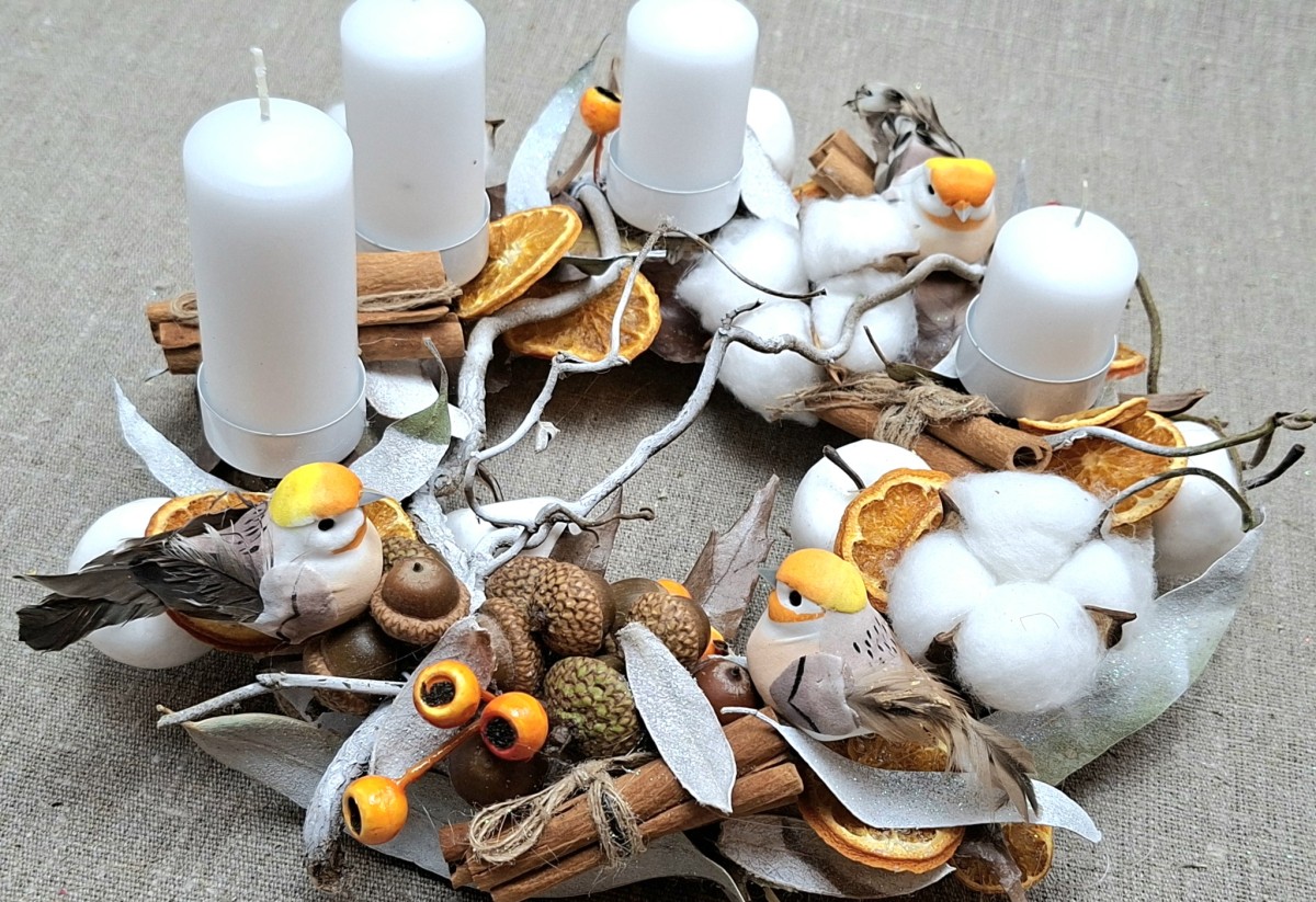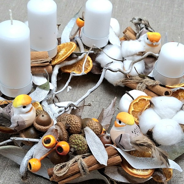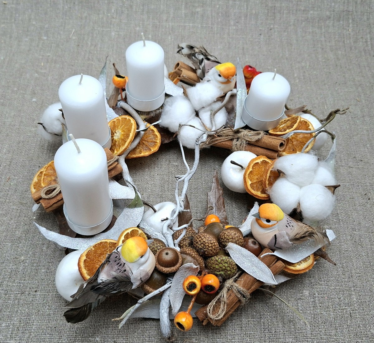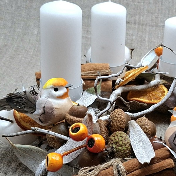D=33 cm. Veidots uz salmu pamatnes, kas noklāta ar džutas materiālu , no dabas un mākslīgiem materiāliem , ar svecēm svečturos.
