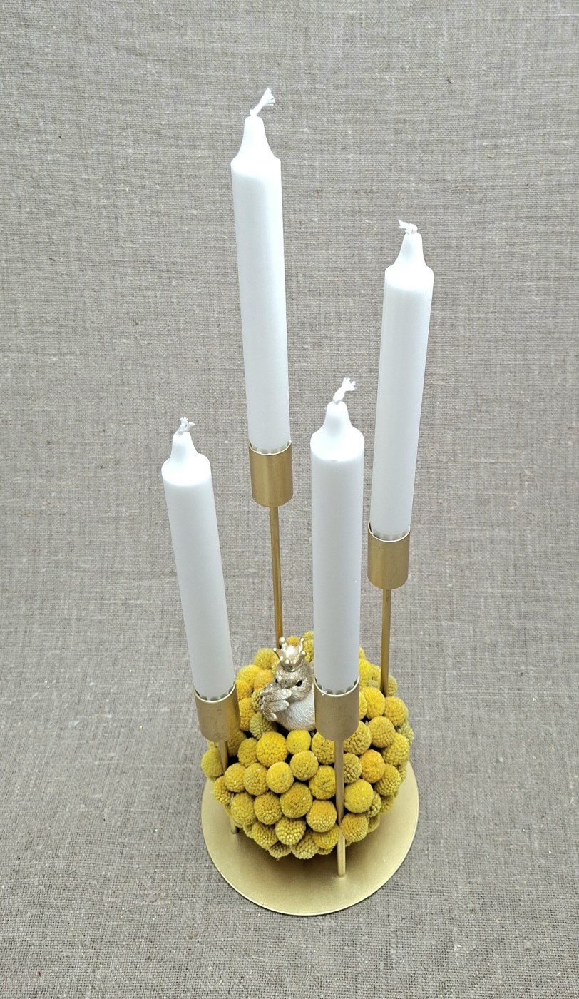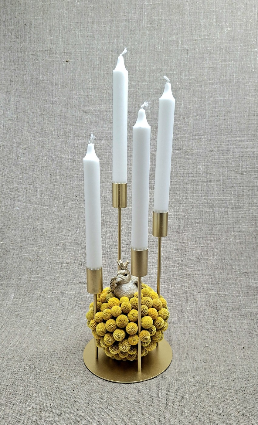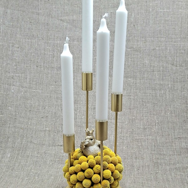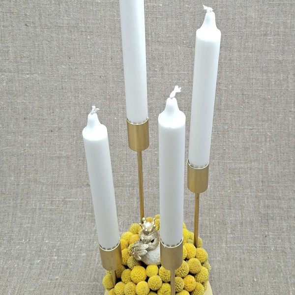 Veidots uz metāla svečtura zelta krāsā. Pamatnes d=15 cm. Svečtura augstākā vieta bez sveces 28 cm. Sveces h =19 cm
