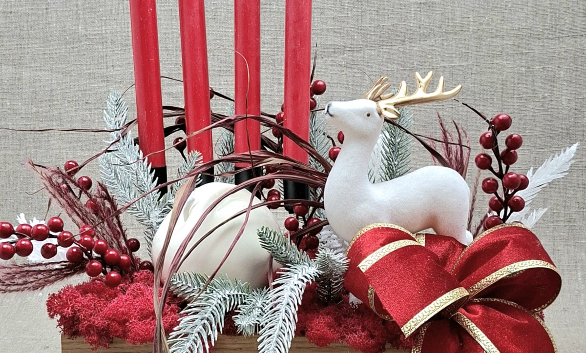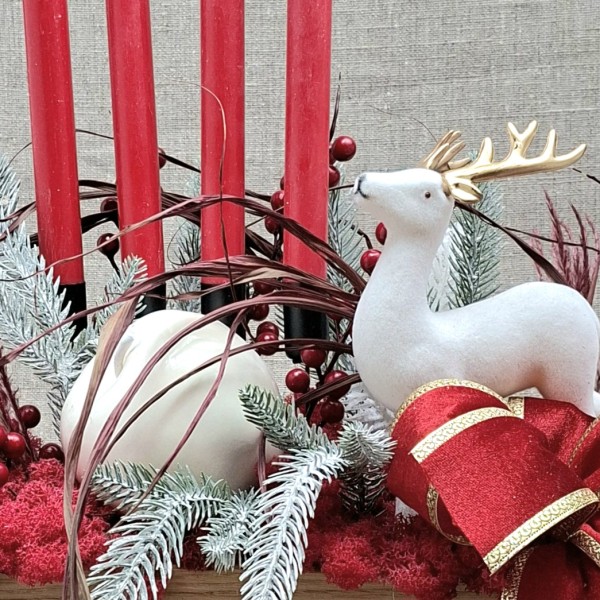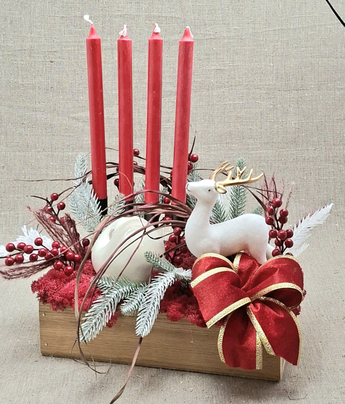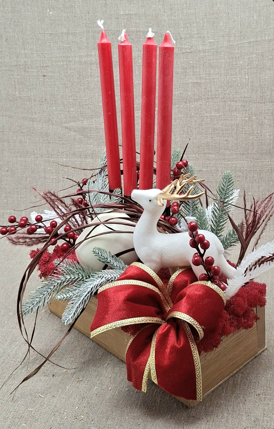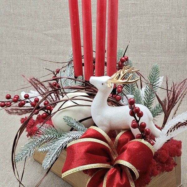 Dekors veidots koka kastītē, izmēri 34x15 cm. Dobeles garās sveces ir izņemamas no svečturiem. Pārdodas kopā ar svecēm.Daudzgadīgs.